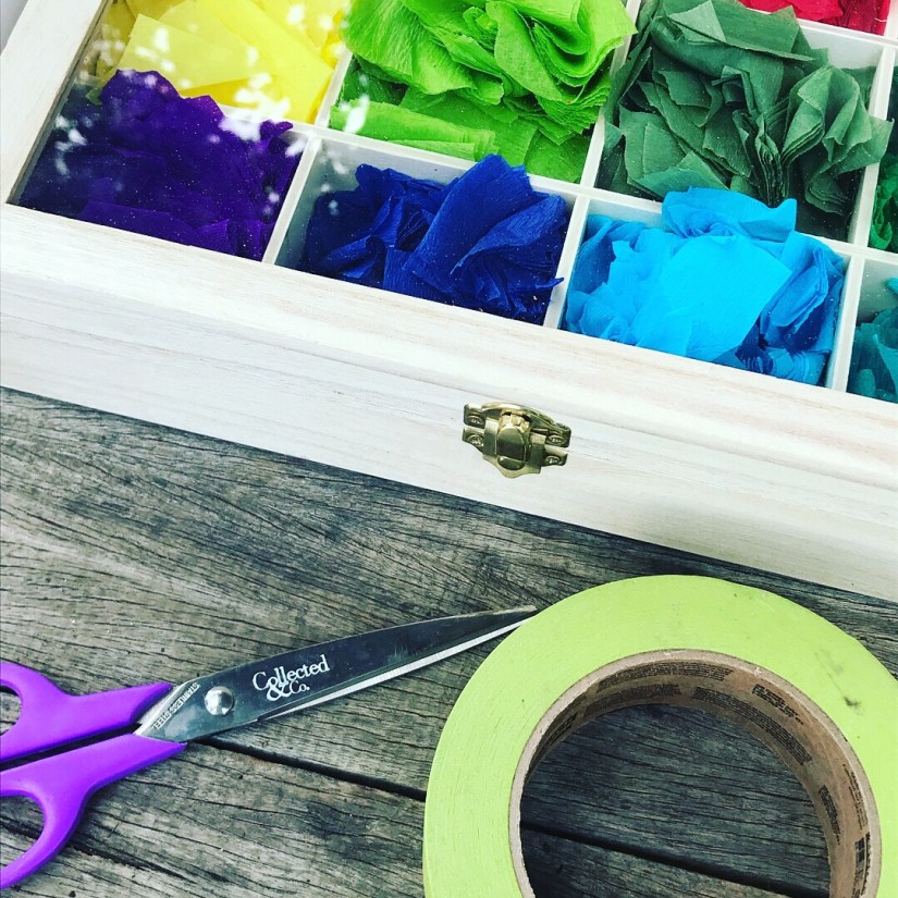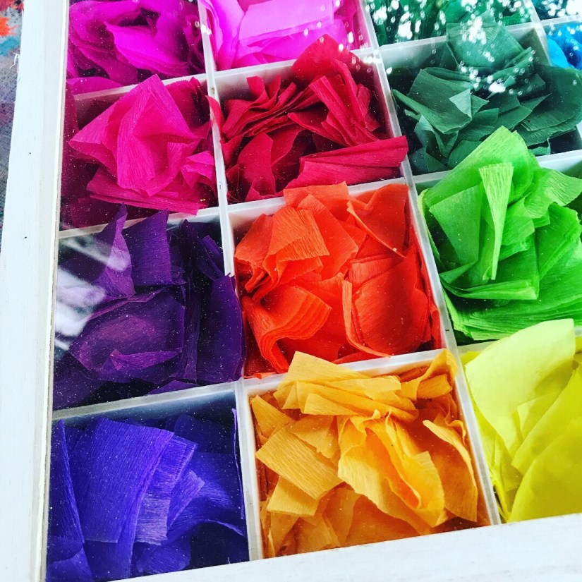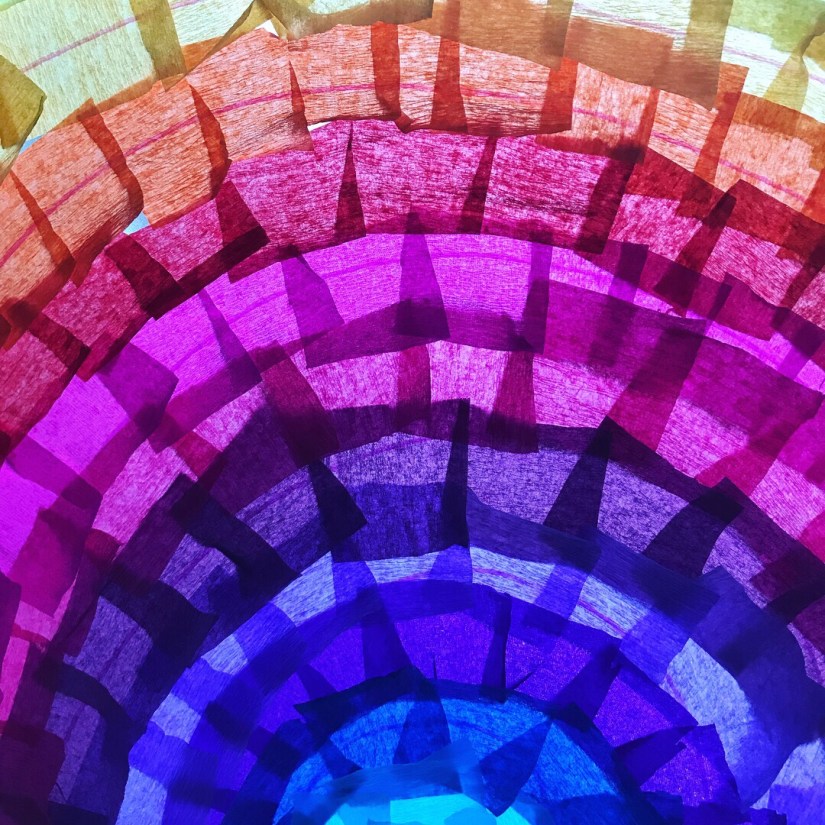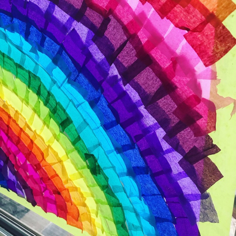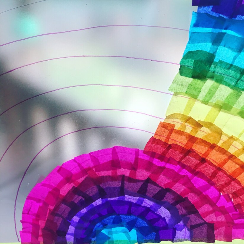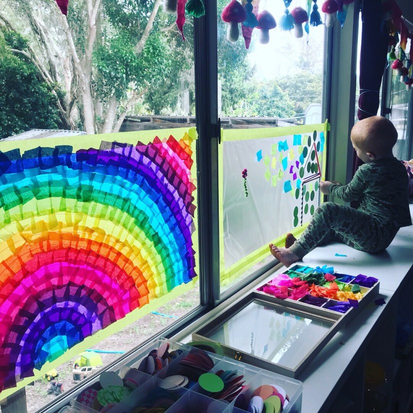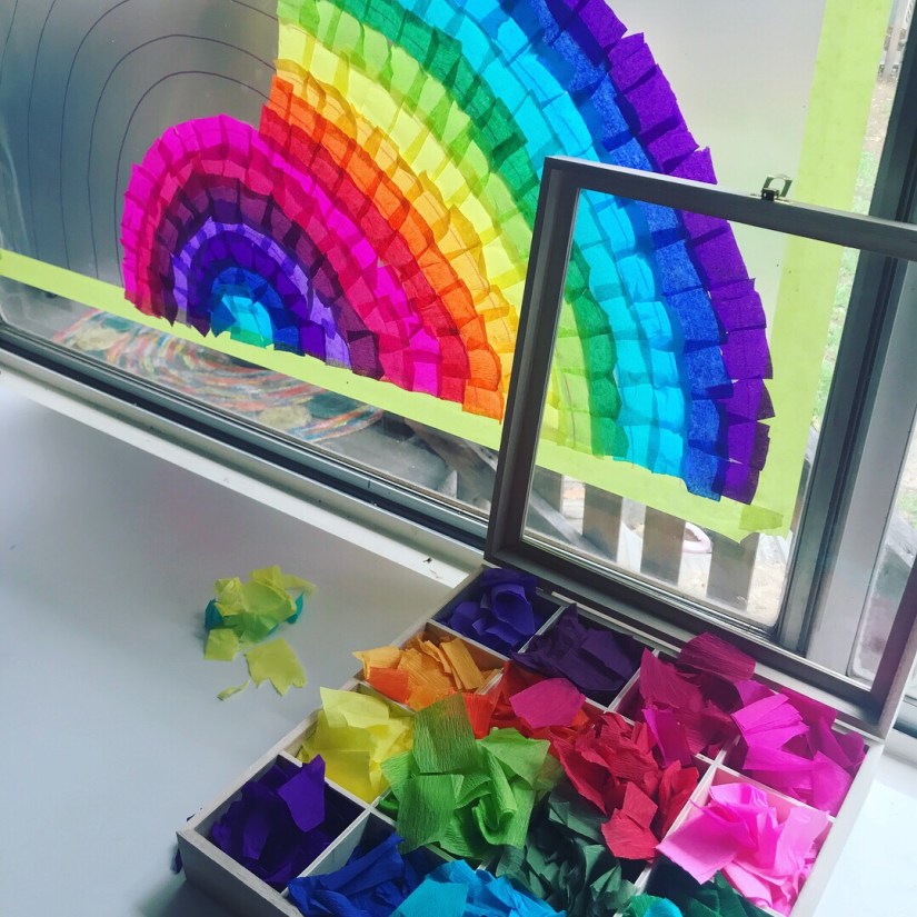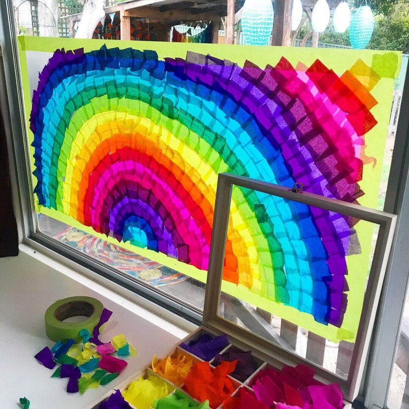 This gorgeous creation is so effective from cut up crepe paper into squares, we used painting tape from Bunnings, clear contact, peel the plastic back and the little bits of paper stick nicely to the sticky contact, looks stunning with the sun shining through, this can be also adapted to a smaller or larger version, I drew an arch guide and…… you can make any patterns or images!!! Hope you feel inspired to create a rainbow!!!!!