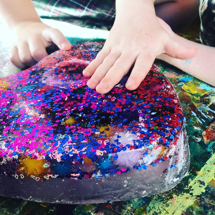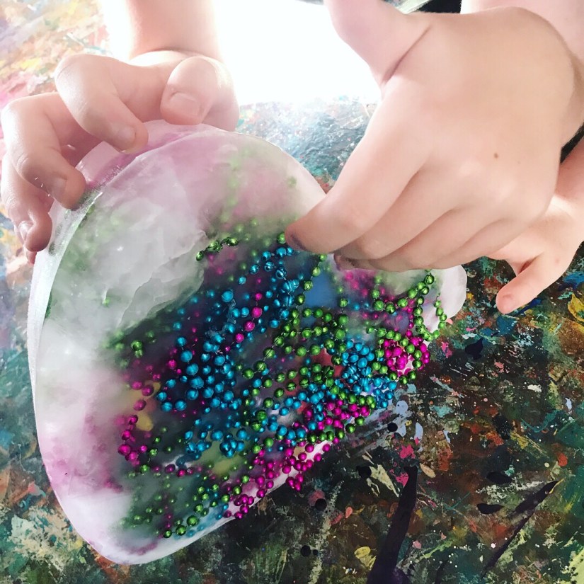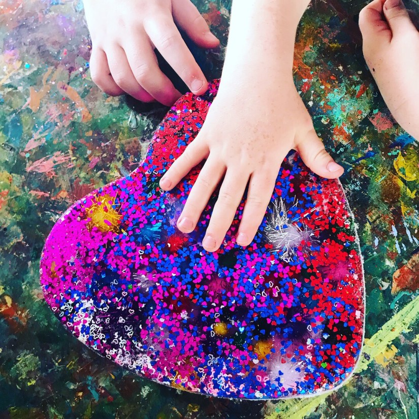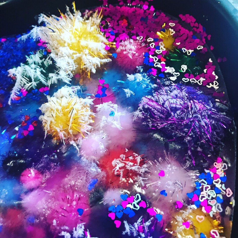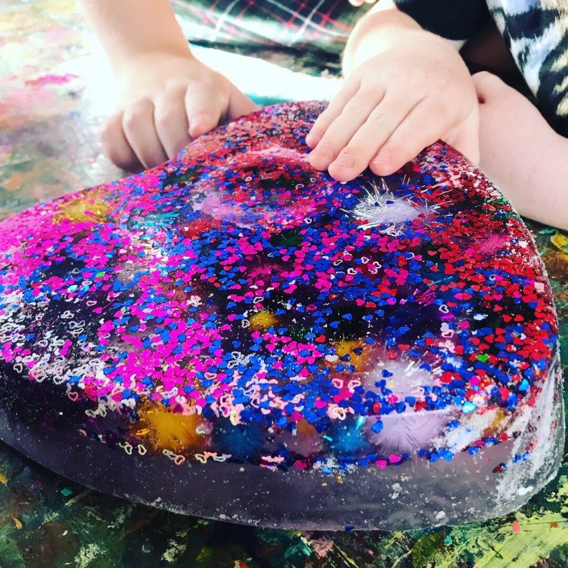 Summer time frozen hearts, these are filled with sensory treasures, I had this sweet heart baking tin and I’m not a big cook…. haha, always finding a different use for things, so we filled it with objects I had in my craft stash, filled it up with water and popped it in the freeze overnight, the next day it was used on a hot summers day to cool everyone down, by touching the ice, you automatically cool down, so with a pipet sucking up water and sprinkles of salt, watching this melt and discover treasures is a great way to engage little ones, kid friendly ways of learning basic science, and STEM activities. The excitement of little faces getting the sparkly Pom poms is so cute!!! This will work with with any baking tin. Hope you feel inspired to create!!!!