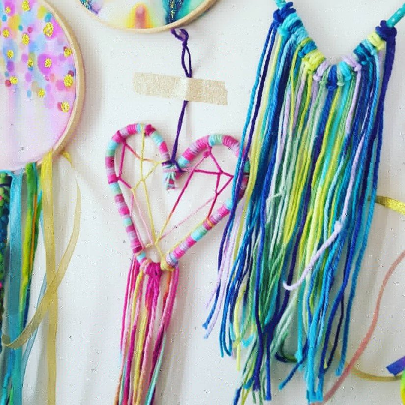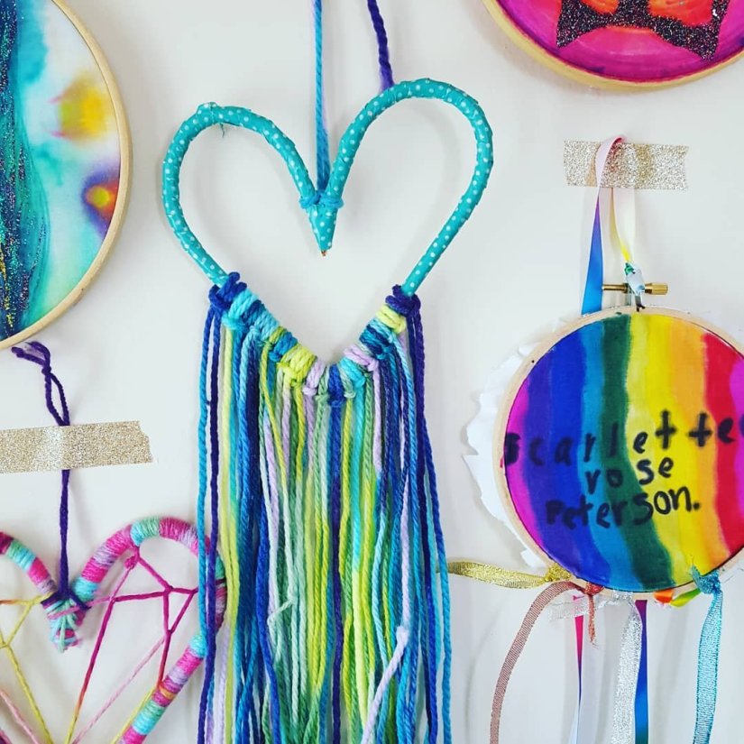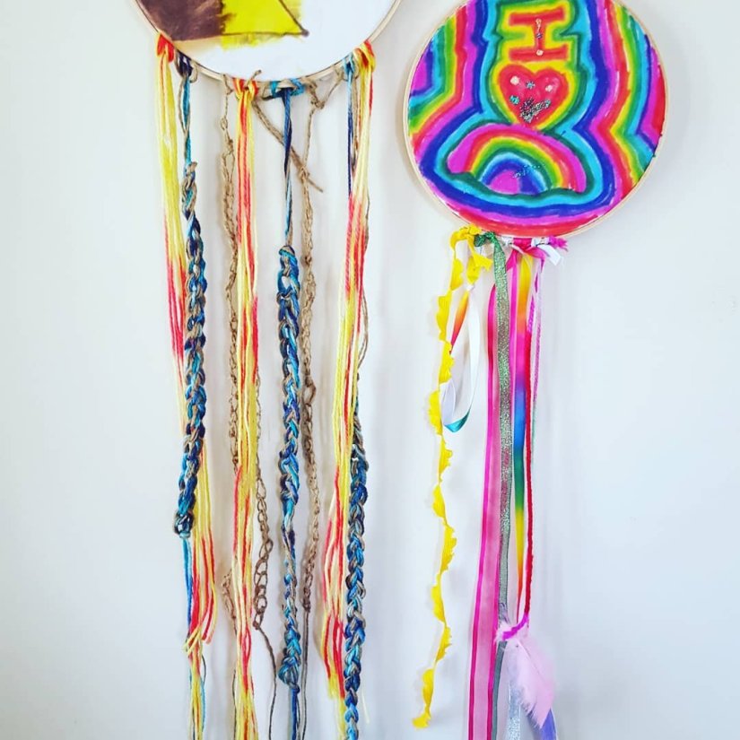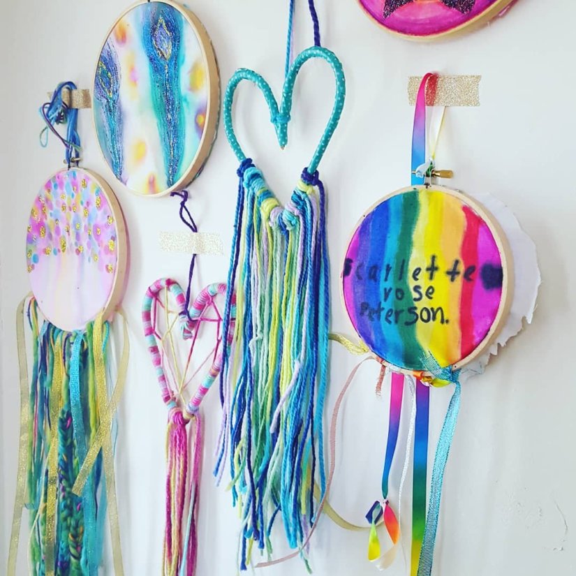 Dream catchers, gorgeous hanging art made by very creative girls between ages of 7-10, given the supplies and seeing what they create! I found all the supplies at Spotlight stores in Australia, the embroidery hoops have a cotton fabric over them, we used sharpie markers, then you can use rubbing alcohol from Woolworths or Coles supermarkets in green bottle or alcohol spray from Bunnings to allow the marker in to run, it’s pretty awesome and endless idea to children to get so creative!!!! ππππππ§‘β€π Adding glitter is optional, we used glitter glue!