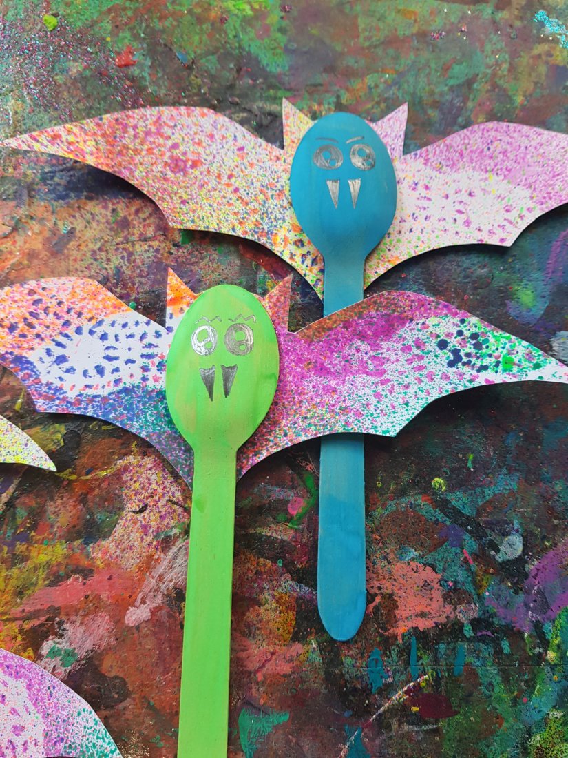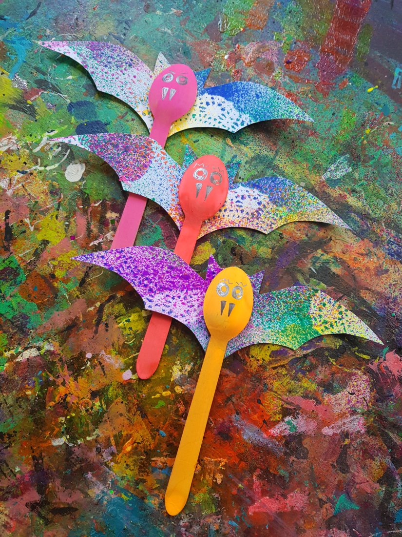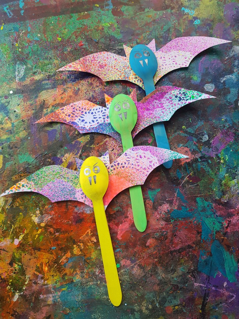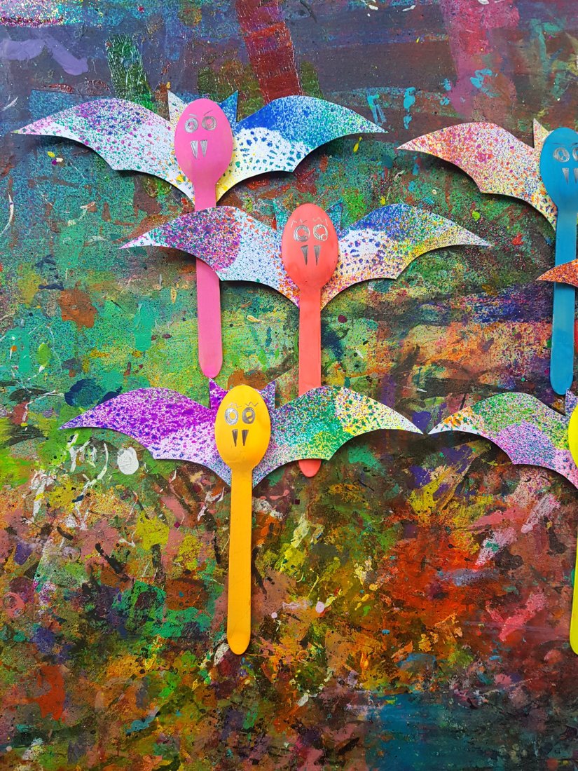 More cute bats, using some pretty paper that was used to paint doily’s on, we made bat wings and used wooden spoons from @kmartaus Australia, painted them with the dark arts, glow under blue light watercolour paint from @micador …… we had to make a bright rainbow family of bats! π¦π¦π¦πΈπΈπΈπ»π»π» #upcycling #imagination #crafty #craftykids #halloween #happyhalloween #sensory #woodenspoon #rainbow #childrencrafts #kidscraft