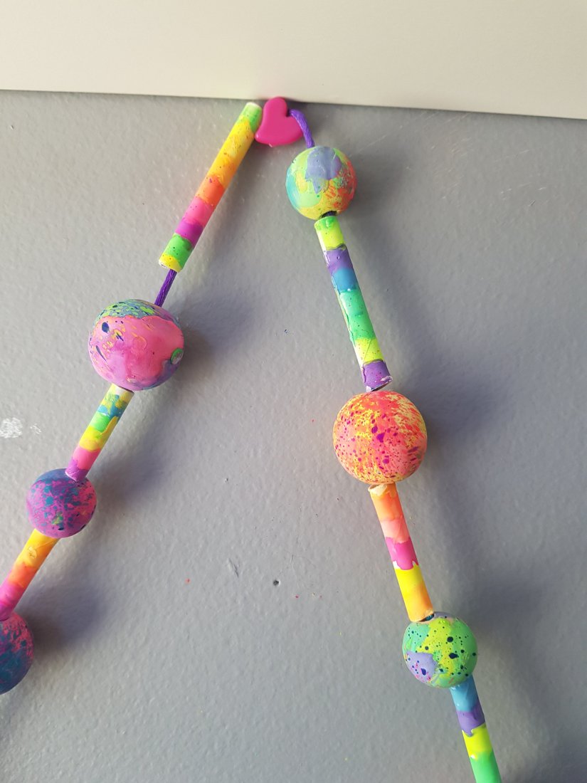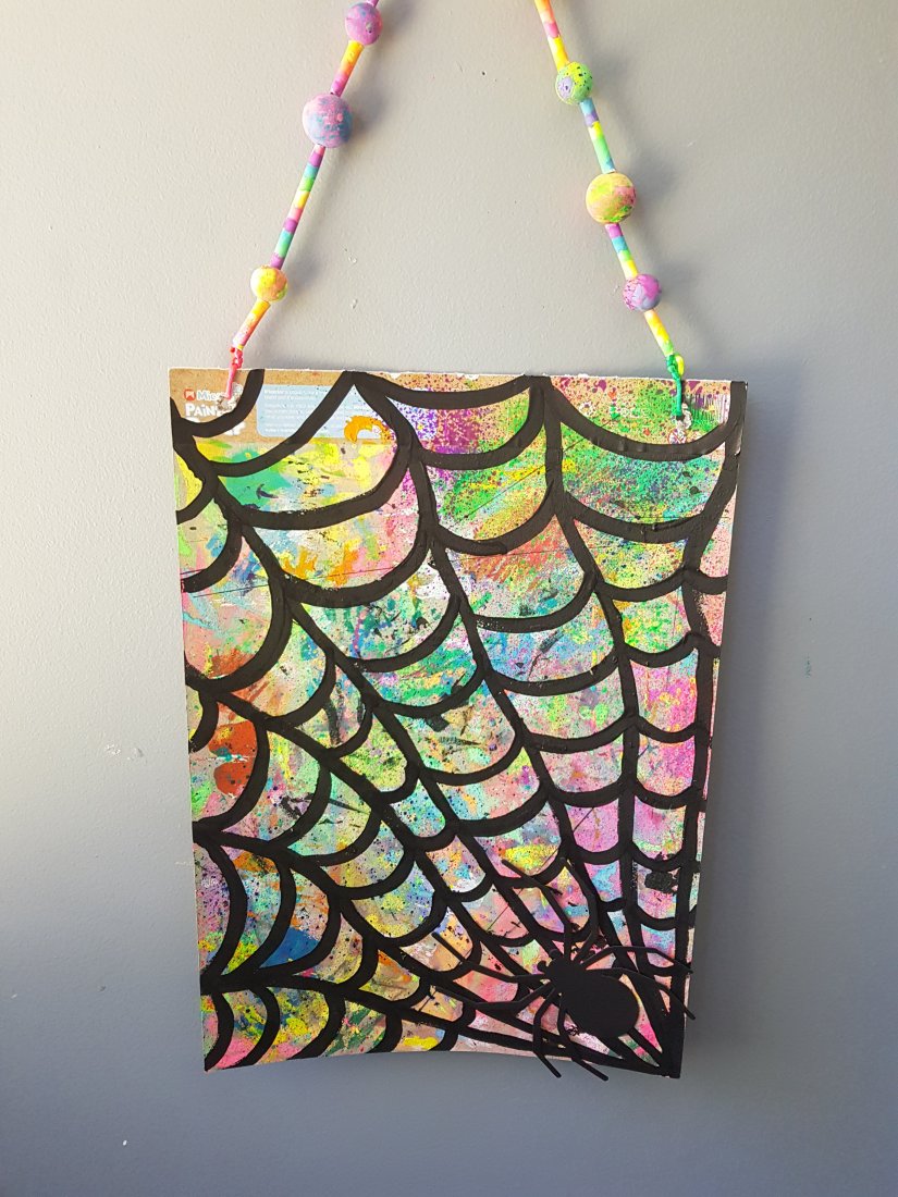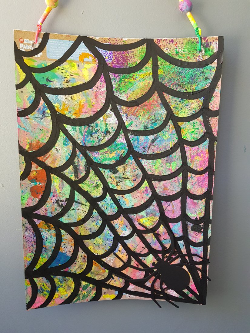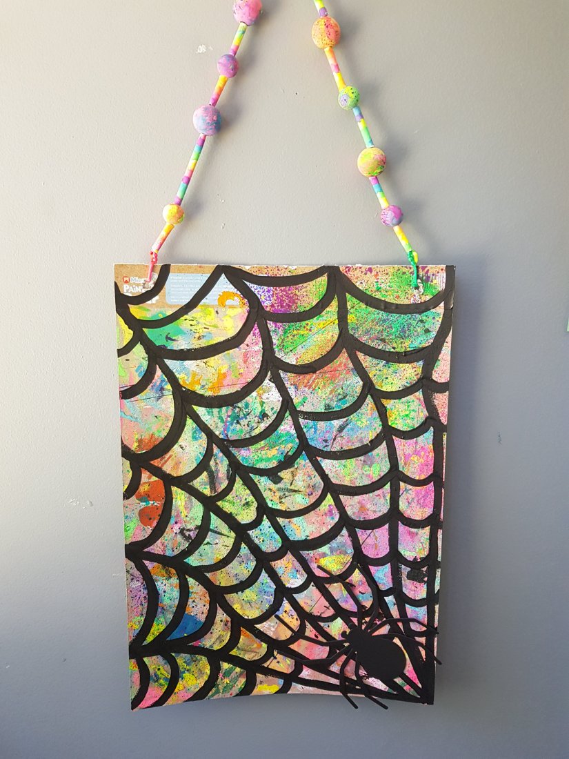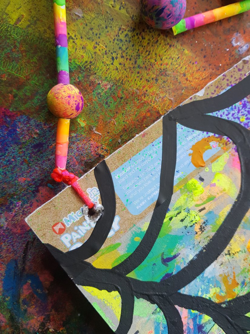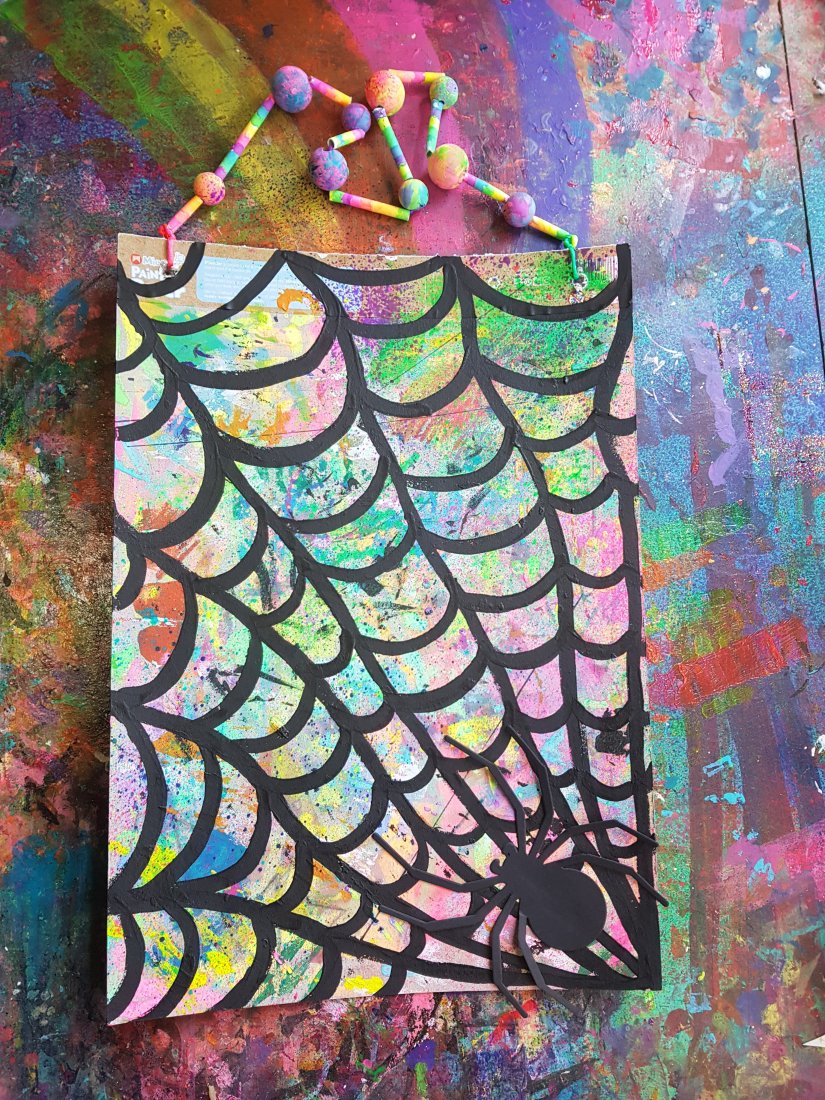 Remember that beautiful accidental background we created from using our finished @micador paper pad, tadaaaa, we added a web with acrylic paint, you could use anything like a sharpie and a cute spider cut out glued on. We painted our wooden beads & straws using @micador fluro watercolours palette too!