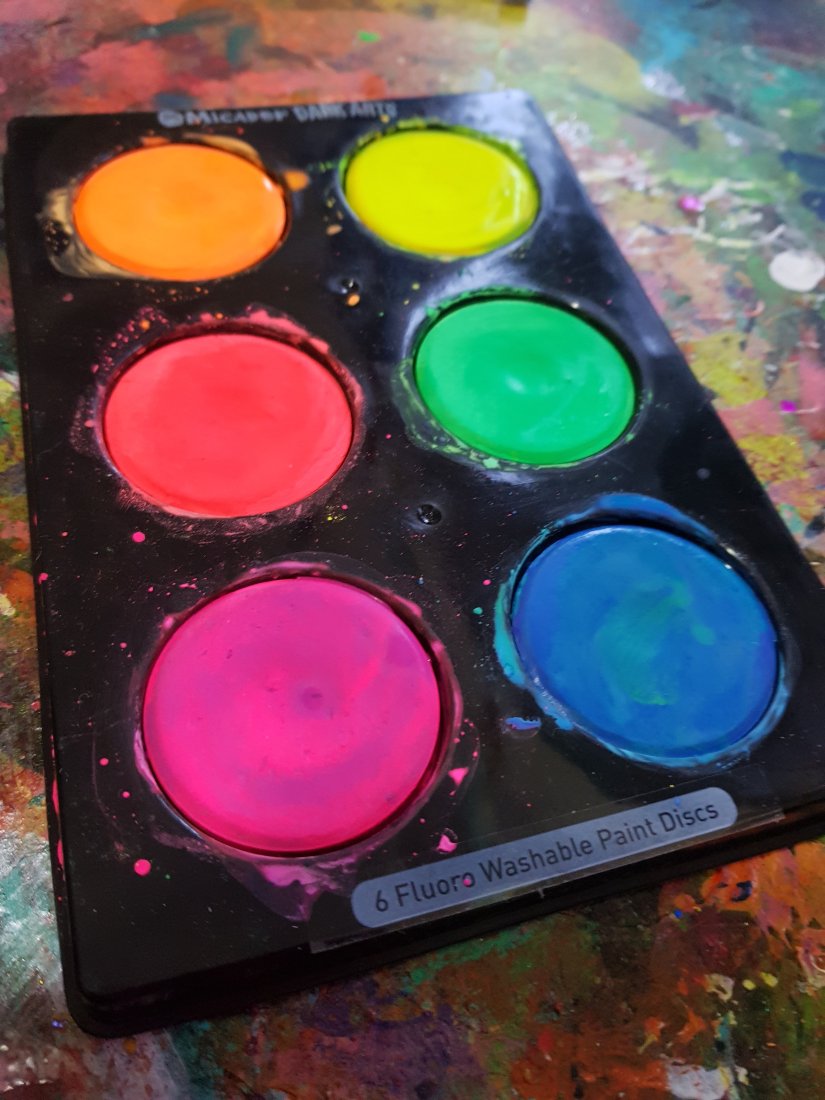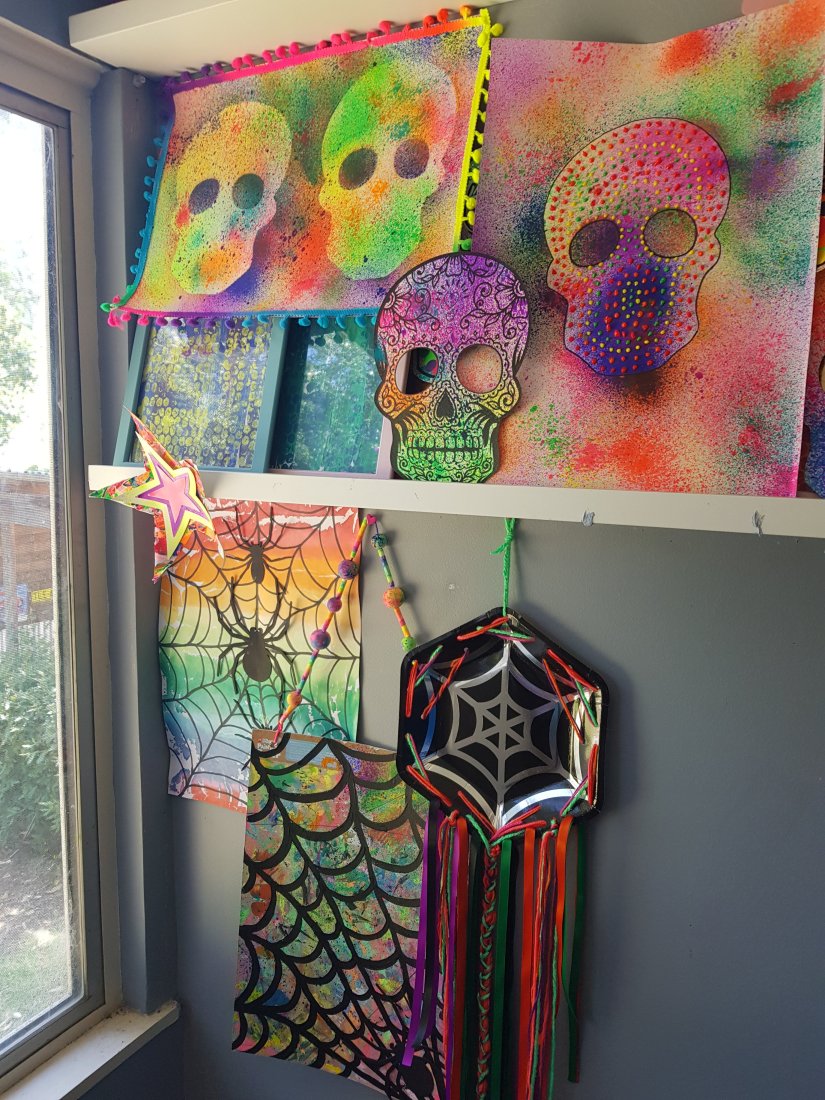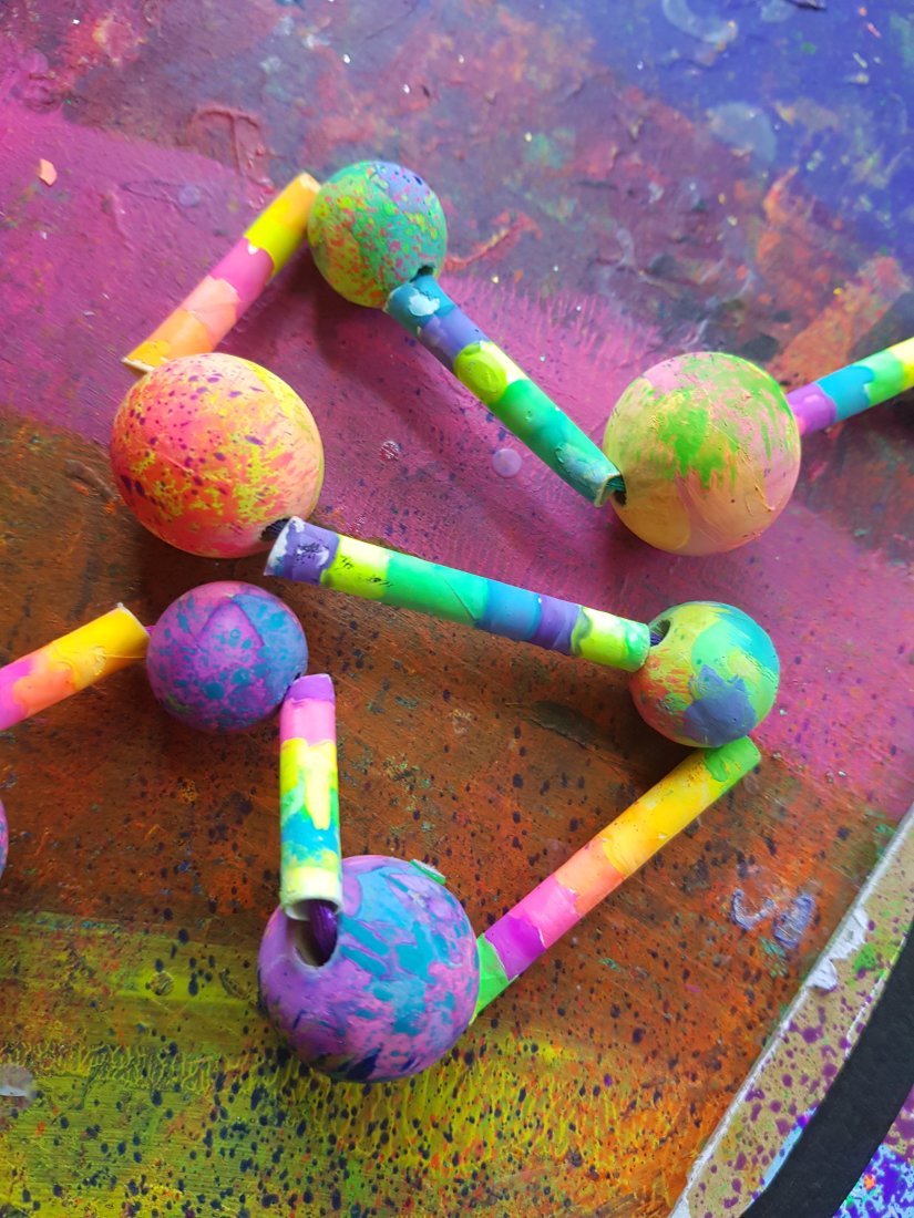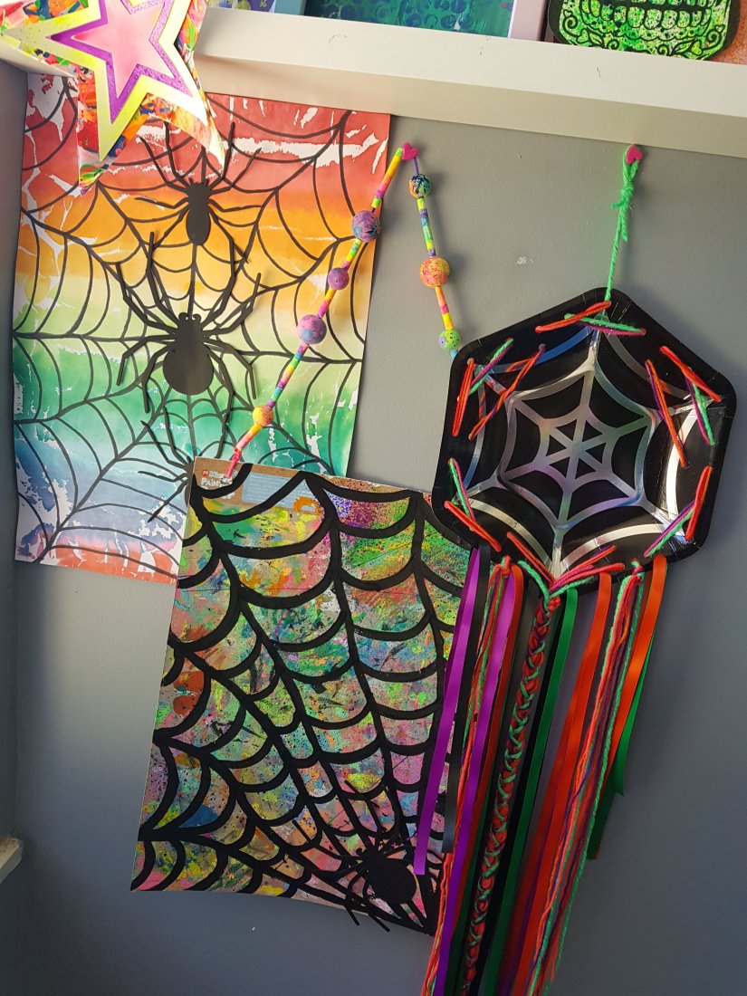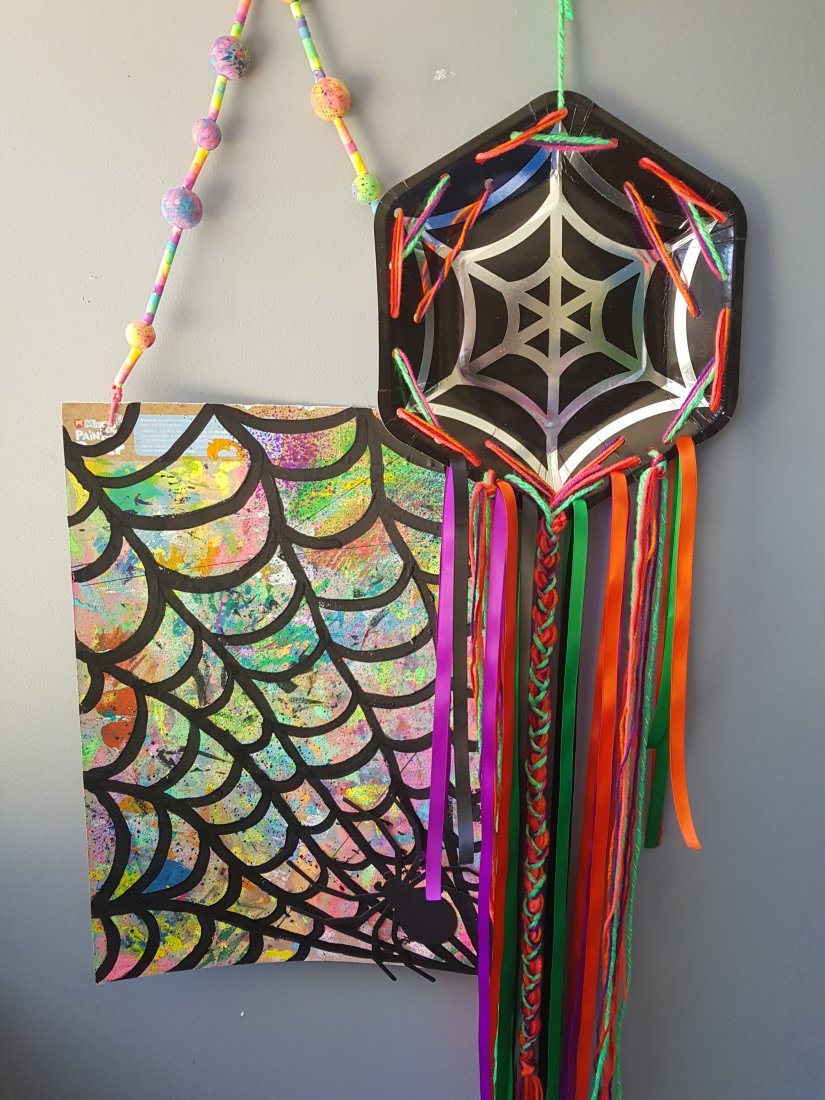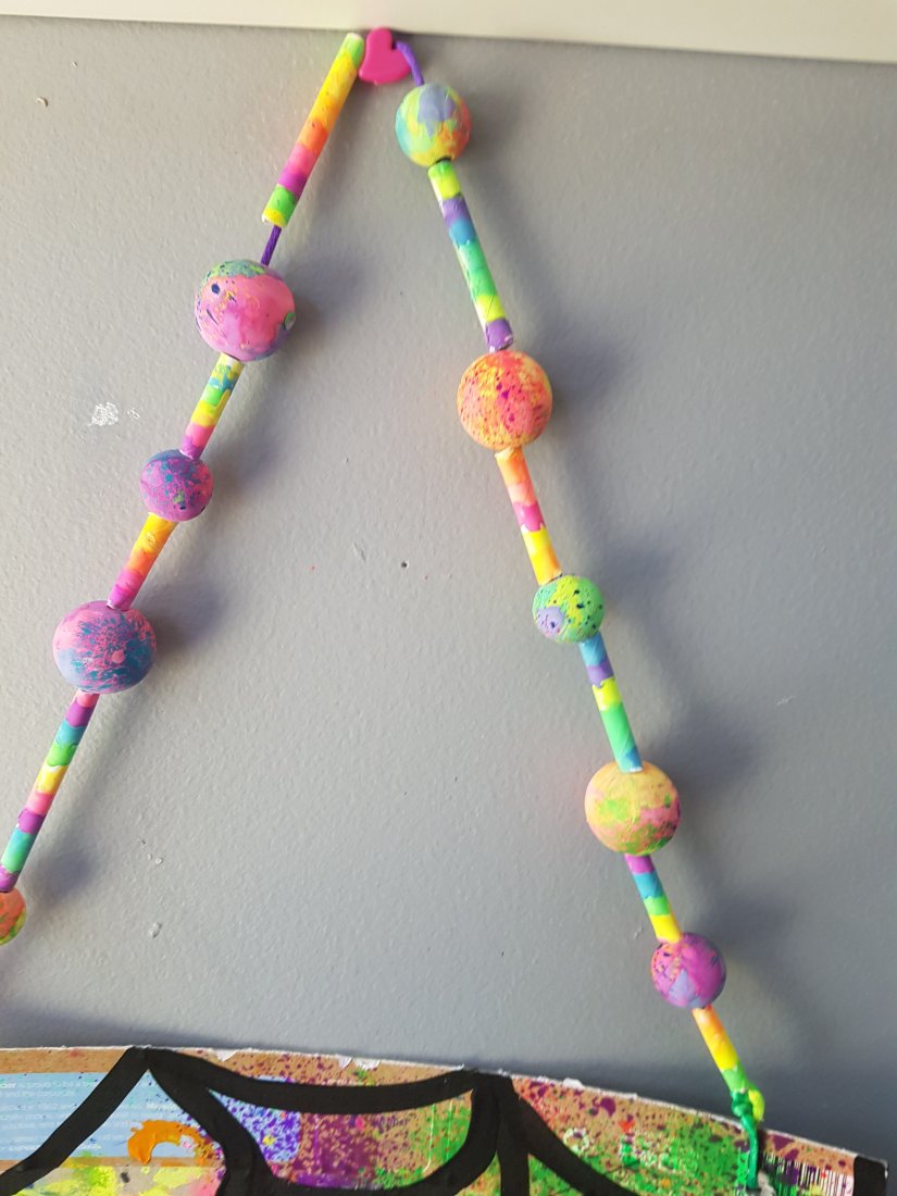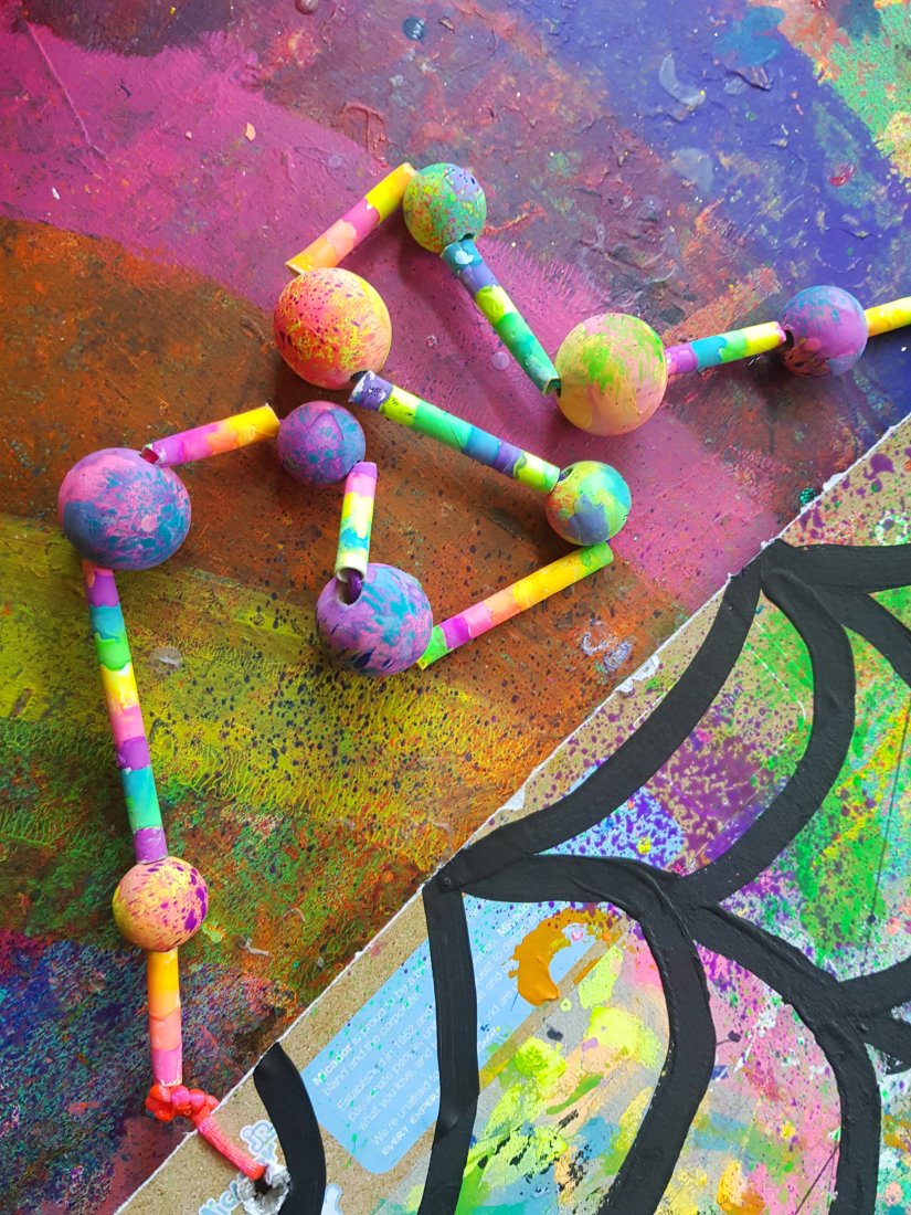 Remember that beautiful accidental background we created from using our finished @micador paper pad, tadaaaa, we added a web with acrylic paint, you could use anything like a sharpie and a cute spider cut out glued on. We painted our wooden beads & straws using @micador fluro watercolours palette too!