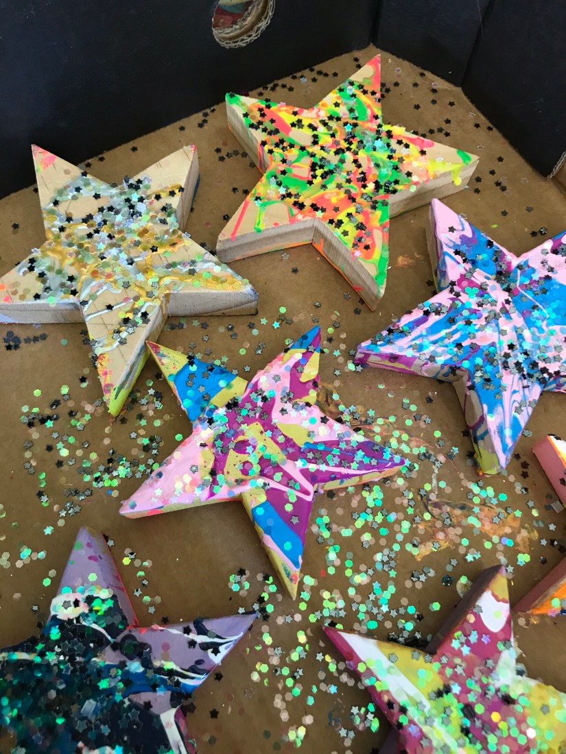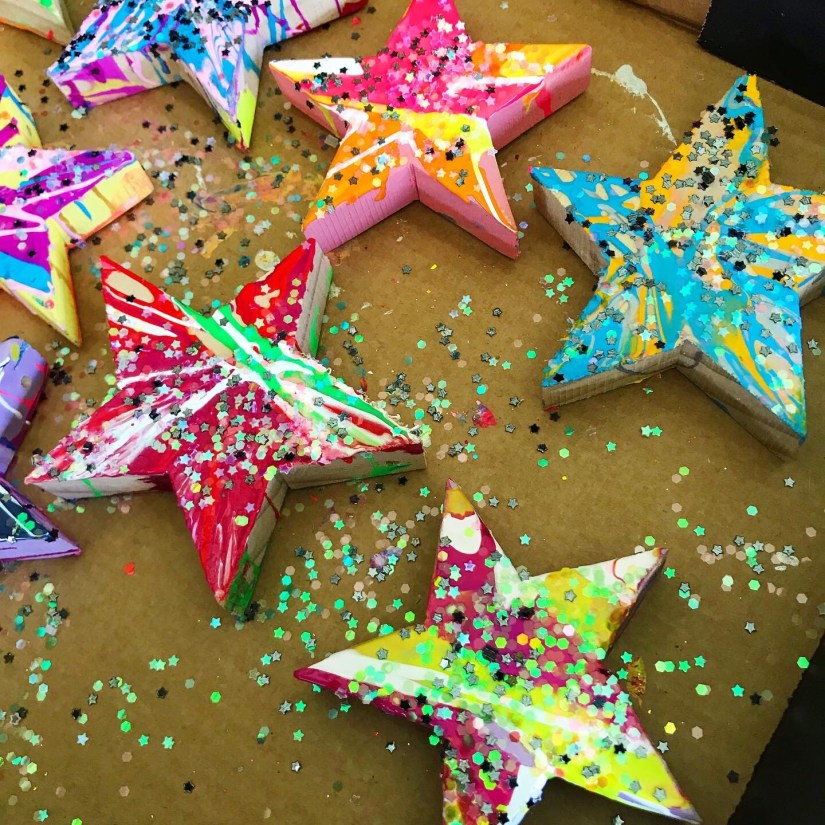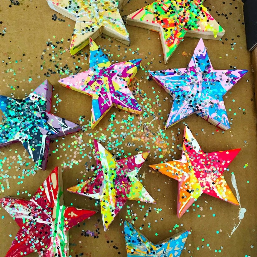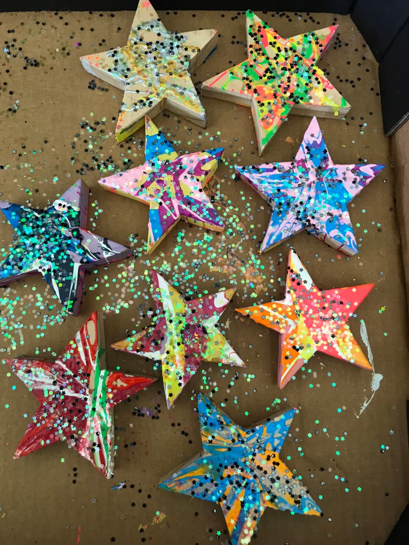These are so much fun, we found the best salad spinner at IKEA and their mala paints are the perfect consistently for spinner art, we cut ours out with a bandsaw, I feel lucky that we have that machine, but otherwise, paper ones are still another version of the crafty activity!!! #star #xmas #christmas #treedecorations #starcraft #kidscraft #craft #glitter #paint