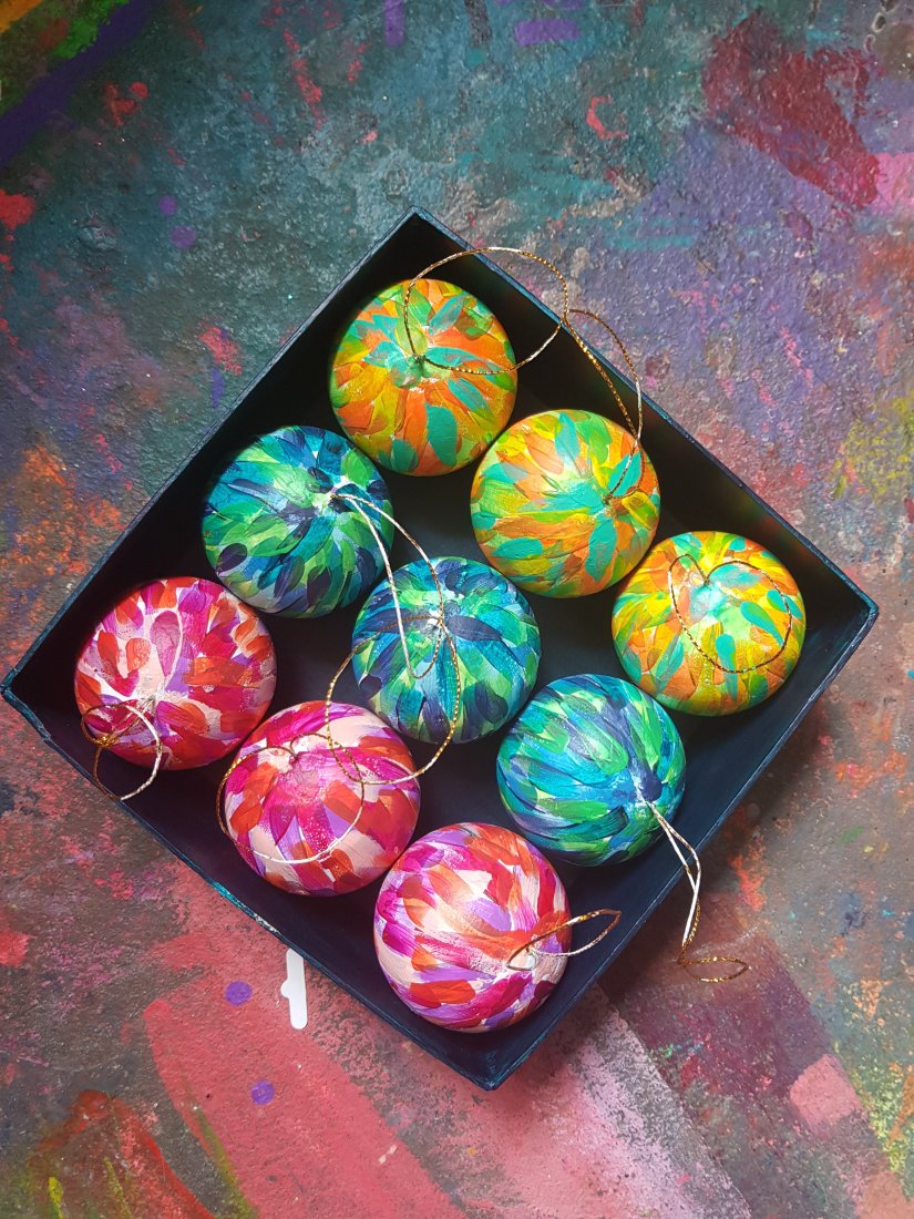 Hand painted baubles, these beautiful plain paper mache ones were from @lincraft ….. we layered these with paints, waiting for each colour to dry before adding the next to avoid muddy murky colours, then added white posca marker over the top!!! ๐๐๐๐๐๐๐โค๐งก๐๐๐๐๐ decorating #decorations #trees #tinkertray #christmassy #christmas #christmascraft #processart #xmas #xmascraft