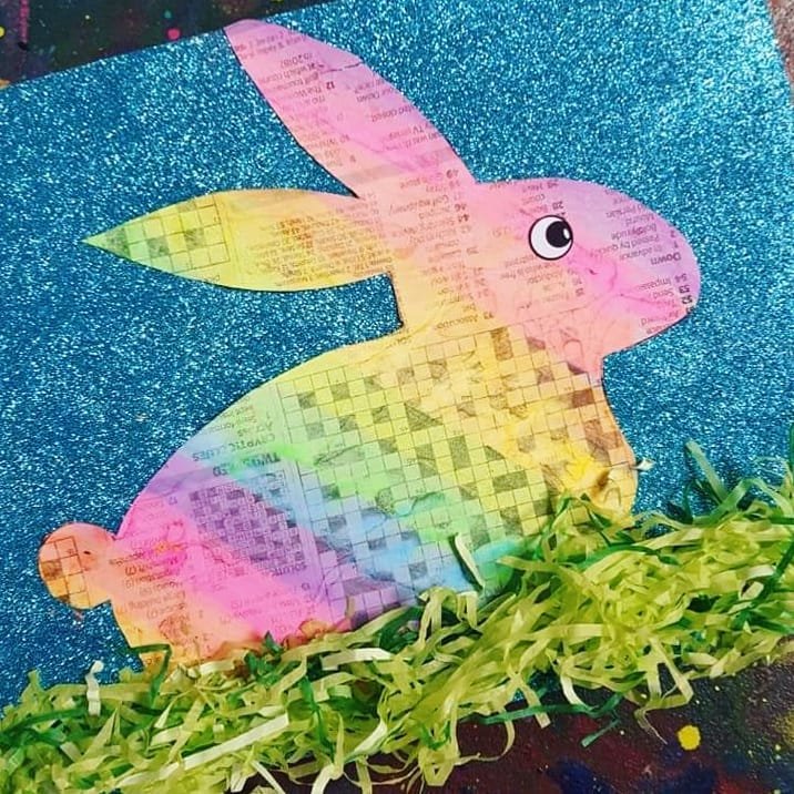 More……..Upcycled newspaper bunnies. Our pretty layered Easter craft, spray paint on newspaper and cut up paper to make grass or Easter shred that was in a basket so upcycled aswell, this is another great project on a budget and use any paper scraps ….. Collage bunny! feel free search the hashtag and see the Easter bunny inspo #easter #easterbunny #creativechallenge #creativeprompt #parentsofinstagram #teachersofinstagram #creativechildhood #playbasedlearning #teachingkids #playandlearn #makelearningfun #popculture #sensoryplay #kidscrafts #craftthezoo #messyplay #imaginativeplay #pretendplay #homeschool #kidsart #playideas #bunny #bunnycraft #collage #rainbow #flowers