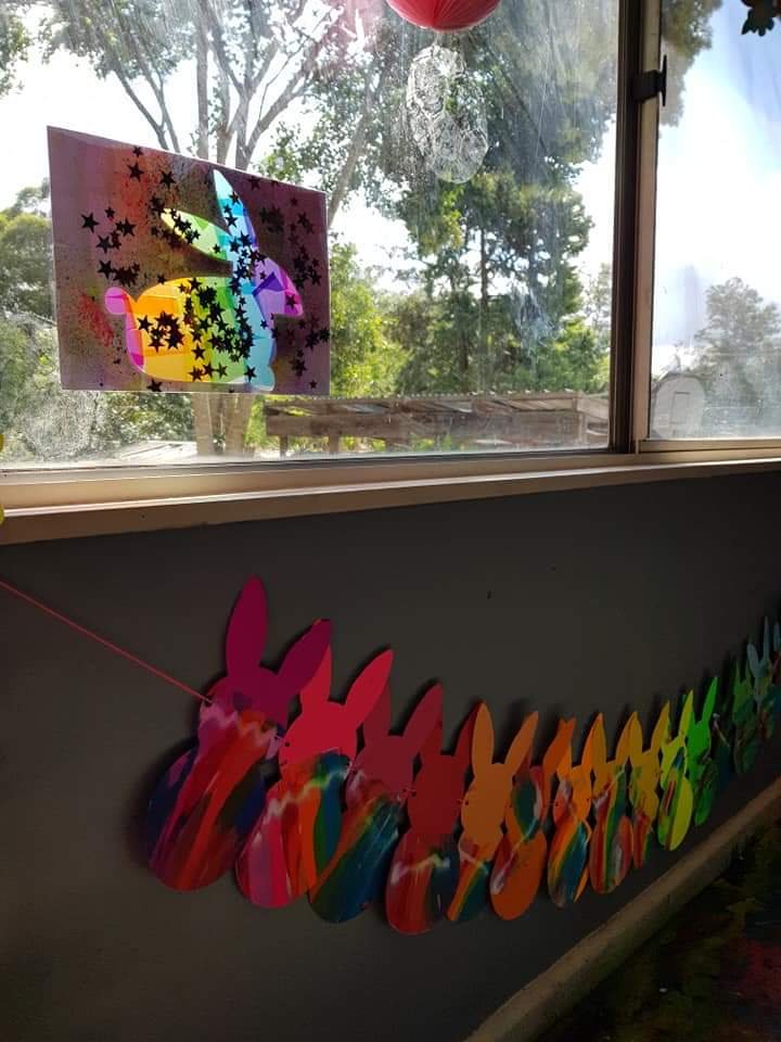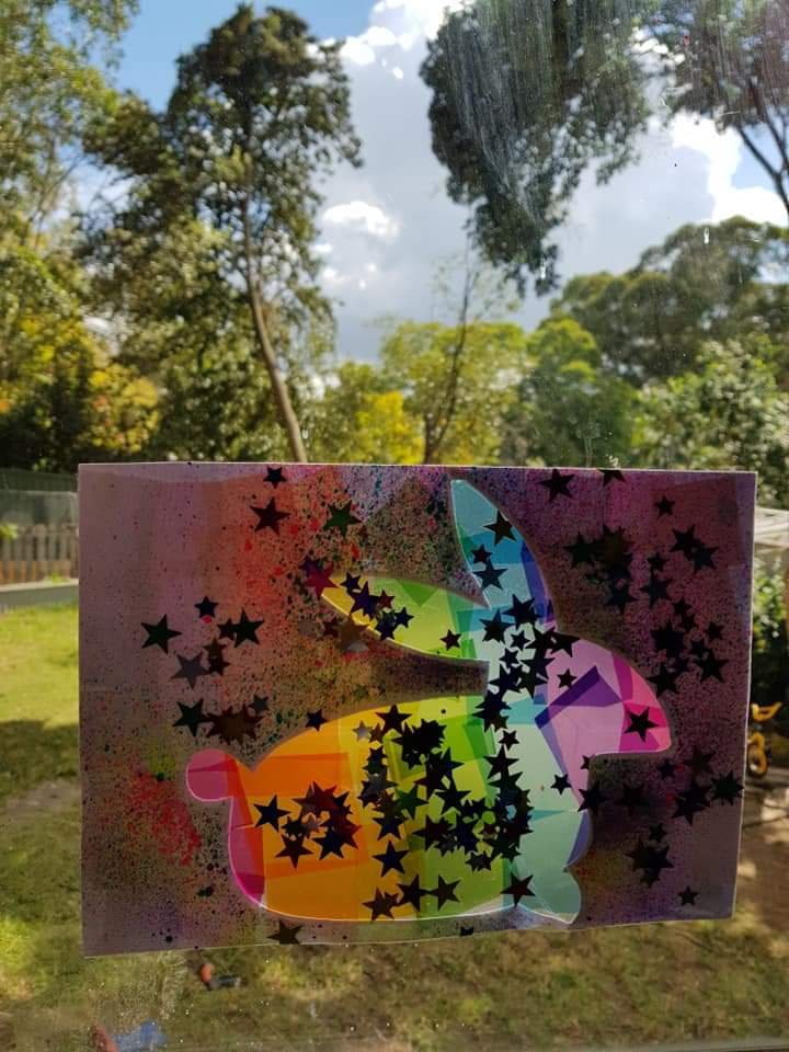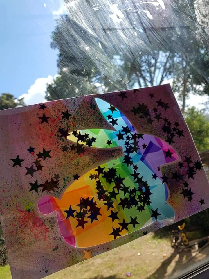 Beautiful cellophane Easter bunny art, this is another gorgeous way to make art on a budget, you can make any shape or design, these are so pretty in the afternoon with the sun beaming down, we added metallic stars for a bit of extra shine!!!! We found our cellophane and the local dollar store! We cut the cellophane up in little squares so they are ready to use for little hands! ❤李 #rabbit #easter #kidscraft #kidscrafting #paper #cardboardcrafts #papercrafts #bunnycraft #kawaii #cute #eastercraft #bunny #crafty #craftykids #kidscrafts101 #rainbow #rainbowcraft #finemotorskills #kidsart #kidslearning #easterbunny #papercrafts #kidslearning #eastereggs #preschool #schoolcraft #rainbowcraft #suncatcher #eggcraft #cellophane #hop_fest #glitter #eastercrafts