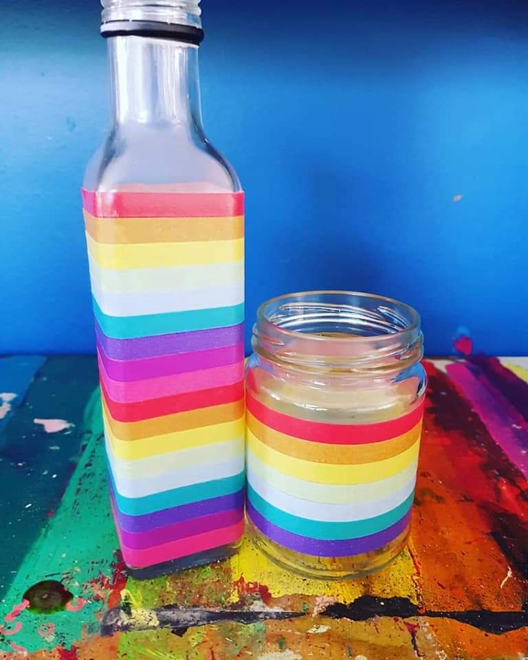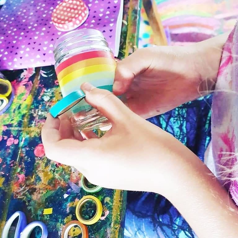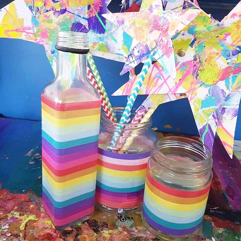Scarlette upcycling tins, glass bottles & jars with washi tape!!! Scarlette the little tinkerer!! Making, creating, drawing, colouring & gifting such thoughtful things! she made these for me with washi tape, how cute, upcycling a coffee jar! 李❤ #washitape #washitapeart #crafty #craft #craftproject #kids #kidscraft #upcycled #upcycle #rainbow #creativekids #kidsart #imagination #creativity #kidslearning #learnthroughplay #homeschool #homeschooling #rainbowcraft #unicorn #unicorncraft #tincan #jar #imaginativeplay #unicorncraft #glassjar #rainbowcraft #rainbowart