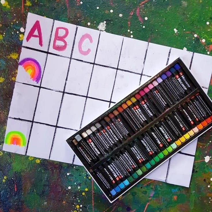 We made our gorgeous background using baking paper & paint. …… the resist technique for the alphabet poster and added white oil pastels outline to the coloured letters to make the letters pop a bit more! Tadaaaa!! Finished!!๐๐๐ Some amazing neon fluro art & craft supplies to get your mind inspired!!! We used oil pastels, jumbo watercolour palette, paper & paint from @micador