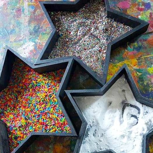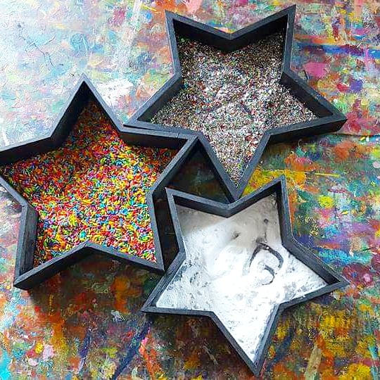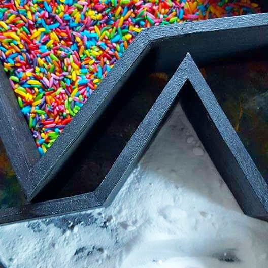 We used our rainbow rice that we posted a few photos back, we used our glitter & corn flour in the third box.