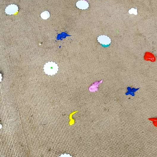 We had an old rug that was covered in drops of paints in our studio so we made even bigger splats, blobs of paint, covered with paper or make up cloth, use a rubber mallet from @bunnings