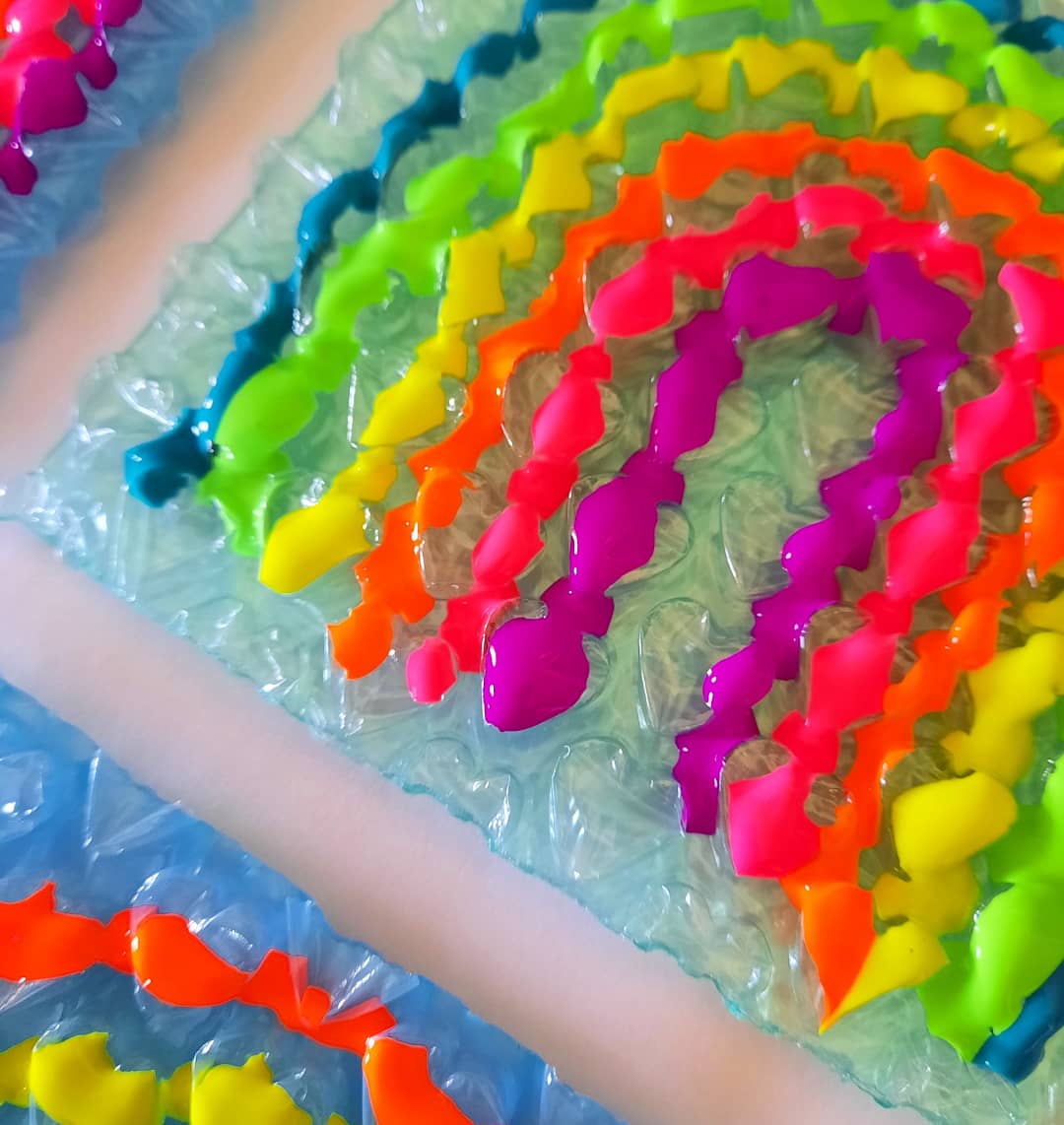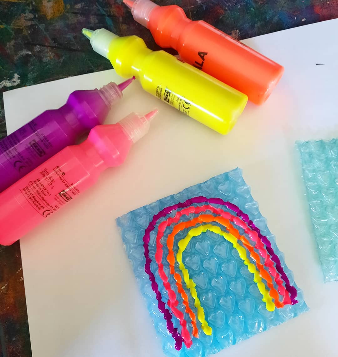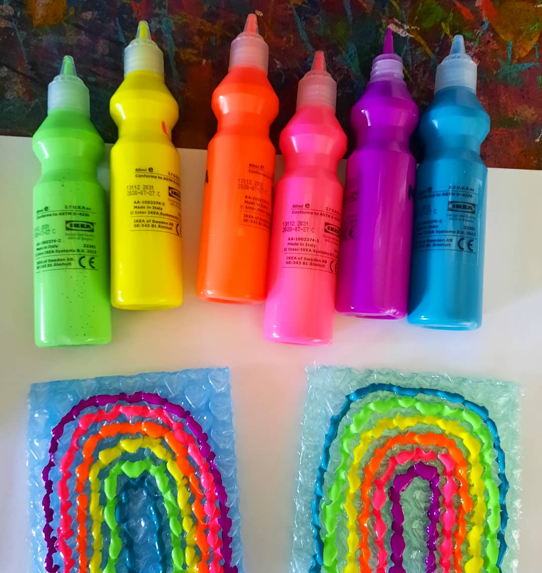 We used the Ikea Mala paints onto the bubble wrap then gently pressed plain A3 paper onto the painted bubble wrap, we made fun rainbow arch patterns with these paints, we love making gorgeous patterns and use the paper for more projects with the kids like collage art, this inspires the next creative activity and the kids feel proud that they painted the paper, thereβs no right or wrong way when creating art, its about the process and the joy it brings!!! We just played around and you know how we love our rainbows!!!!