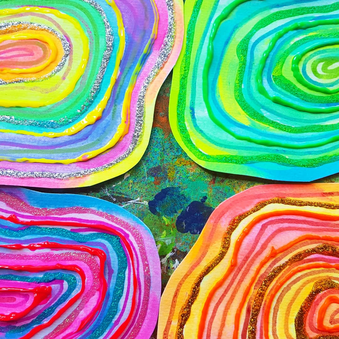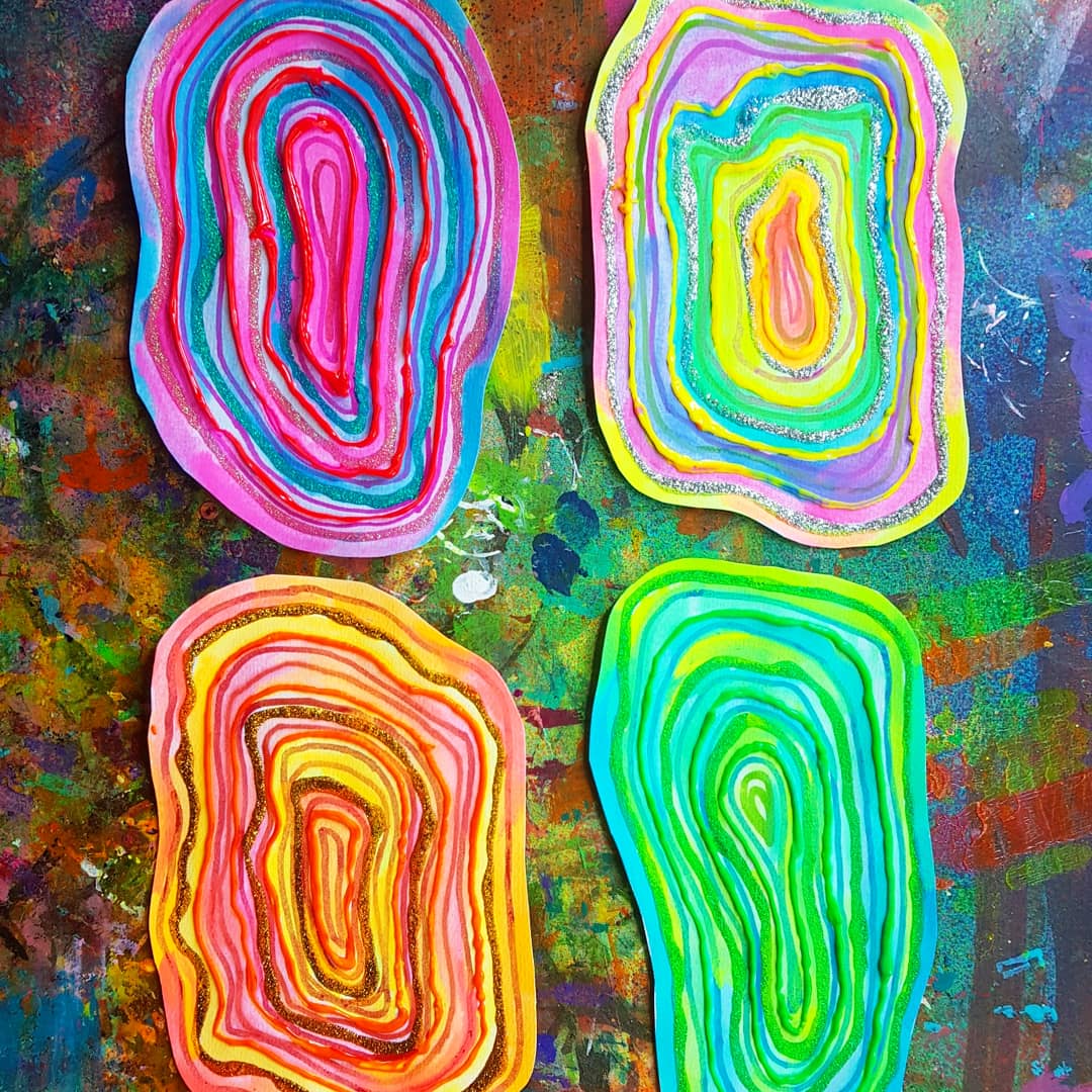 Gorgeous geodes /agate!!! I’ve been wanting to play around with these supplies & experiment to see how they all turn out when used…. glitter glue, 3d paints & watercolours. Have you seen all the stunning geode crystals art inspiration!???? We used sharpie markers aswell,Ā free hand shapes, our watercolours & 3D paint from @micador
