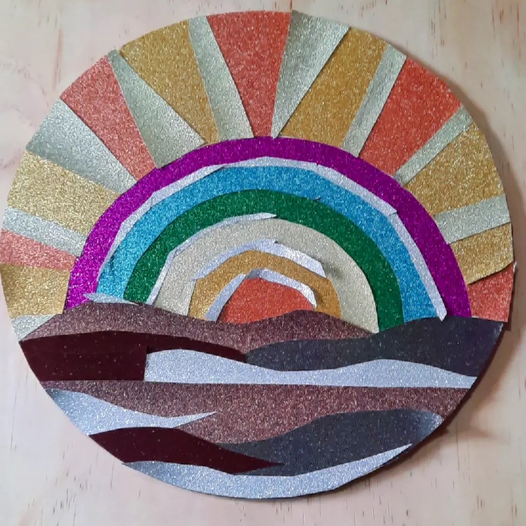 Rainbows & glitter sticky sheets, what a delightful combination of craft supplies, endless possibilities but we had to make a rainbow & sunset collage!!