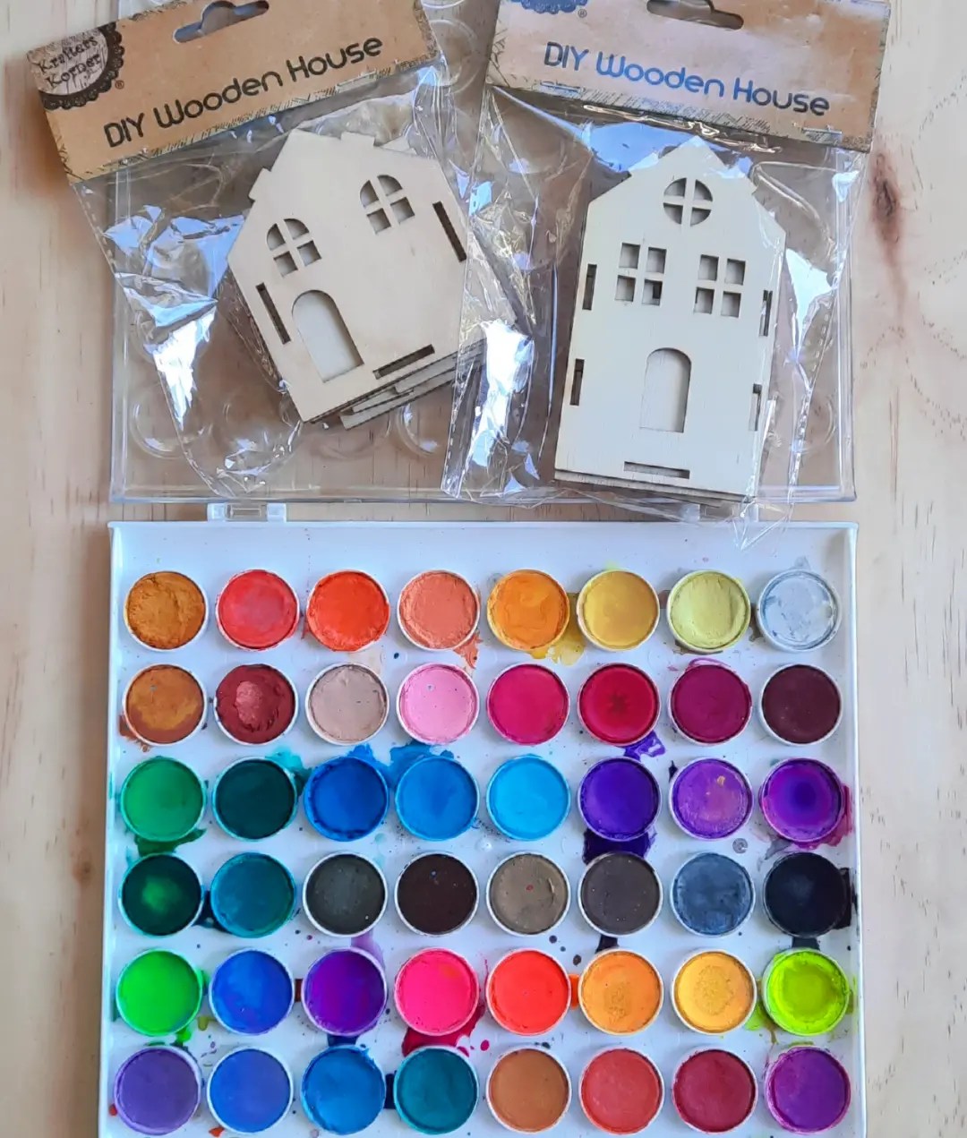 The little wooden houses from @krafterskorneraus turned into Halloween houses and painted using @micador watercolours …… we used playdough as the tray base but you can use anything to created a mini spooky world!!!