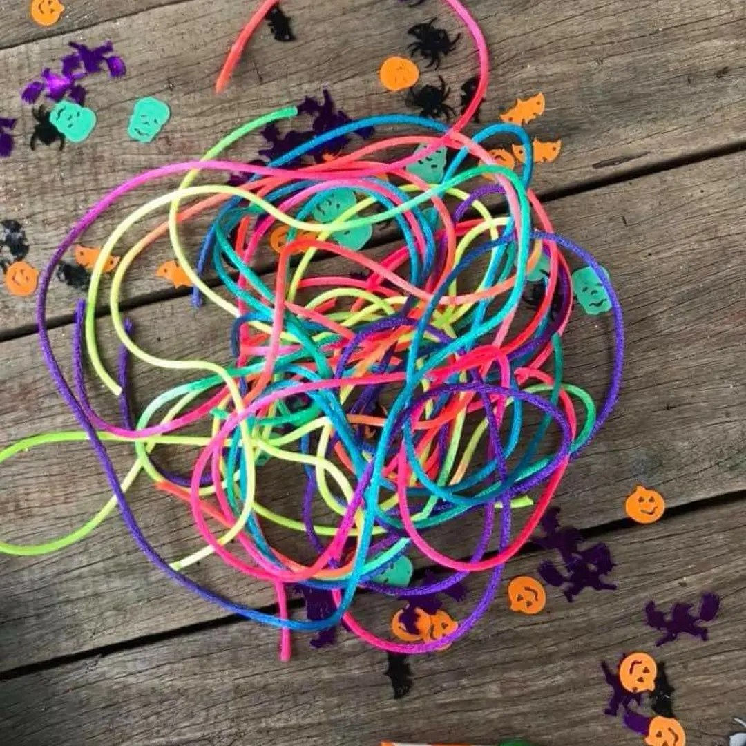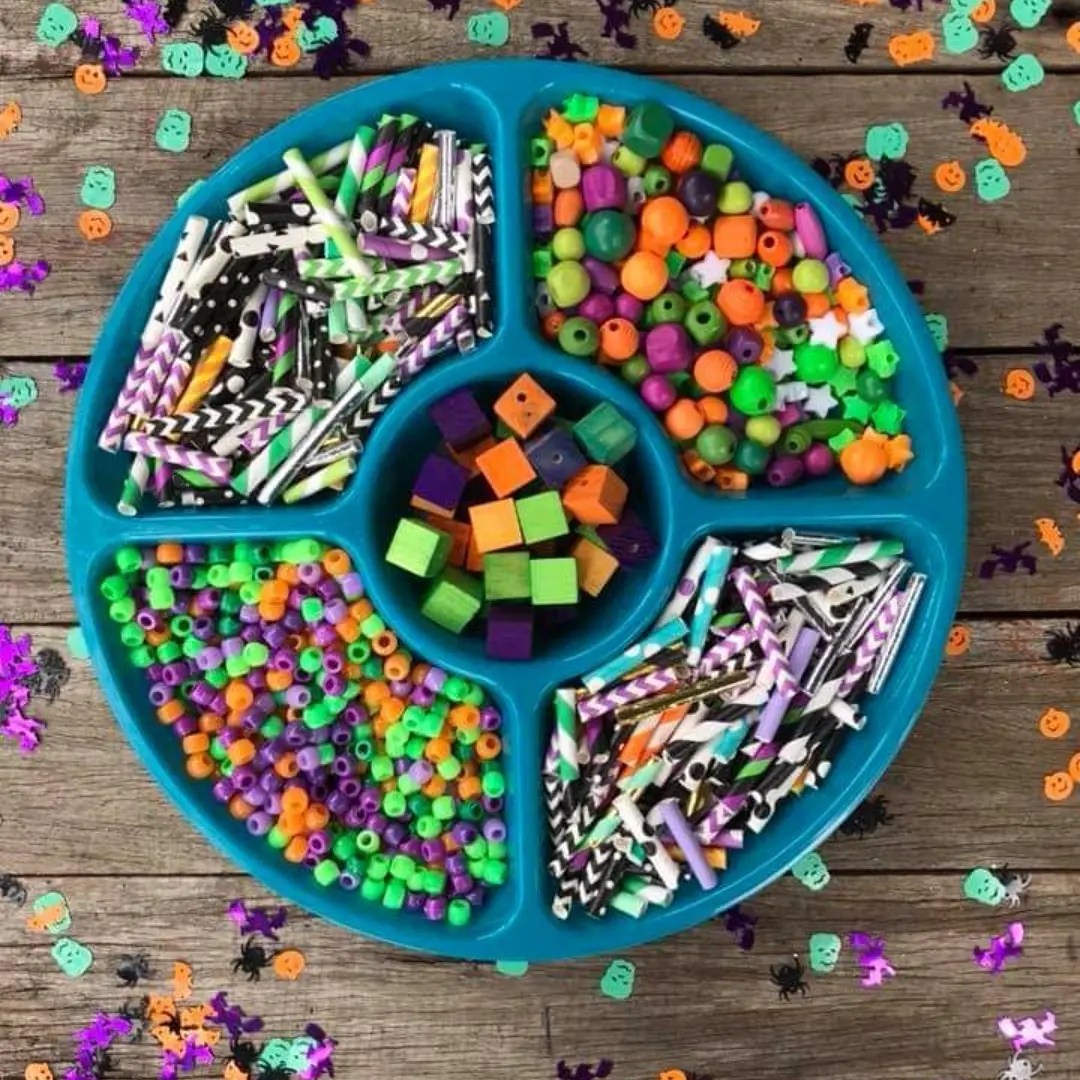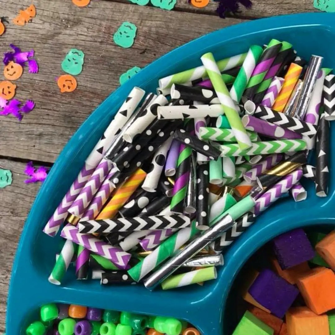 Halloween necklaces, another great way to use paper straws, perfect for little fingers to thread!!! We looooooove paper straws!!! These are unreal for crafty projects, we cut these up to make some cute spooky Halloween inspired kids necklaces. They are great for threading activities!!! You can find these supplies in so many party shops, dollar stores, department stores with party supplies, even the supermarkets now or online.