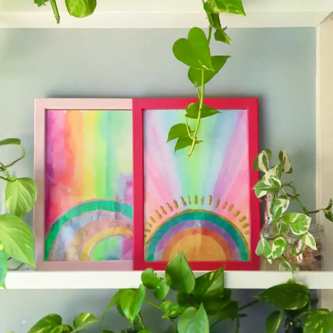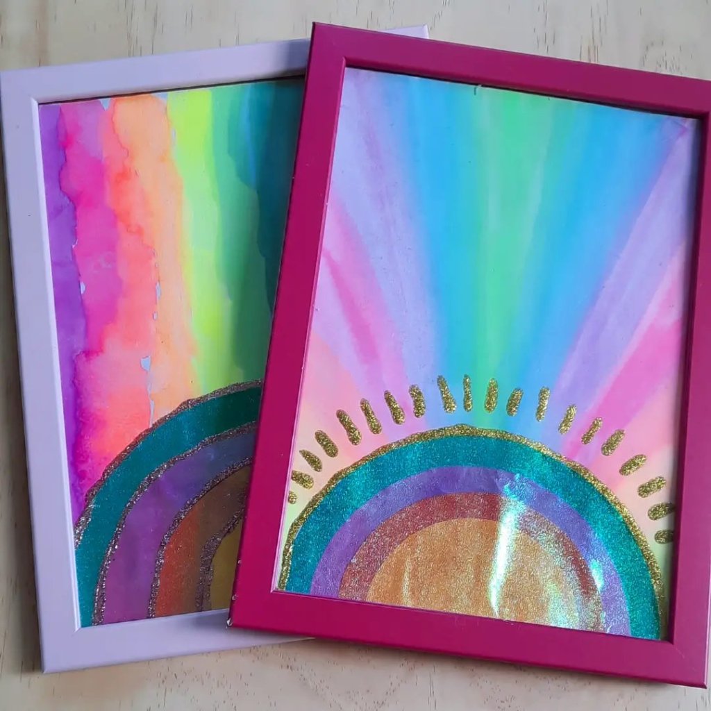 Stunning iridescent paper cut up into shapes of rainbow arches to make these sweet artworks, sparkly paper from @zart_art and painting the background with our favourite watercolours from @micador ….. we use our shelves & frames from @ikea_australia to proudly display all our creations!!!