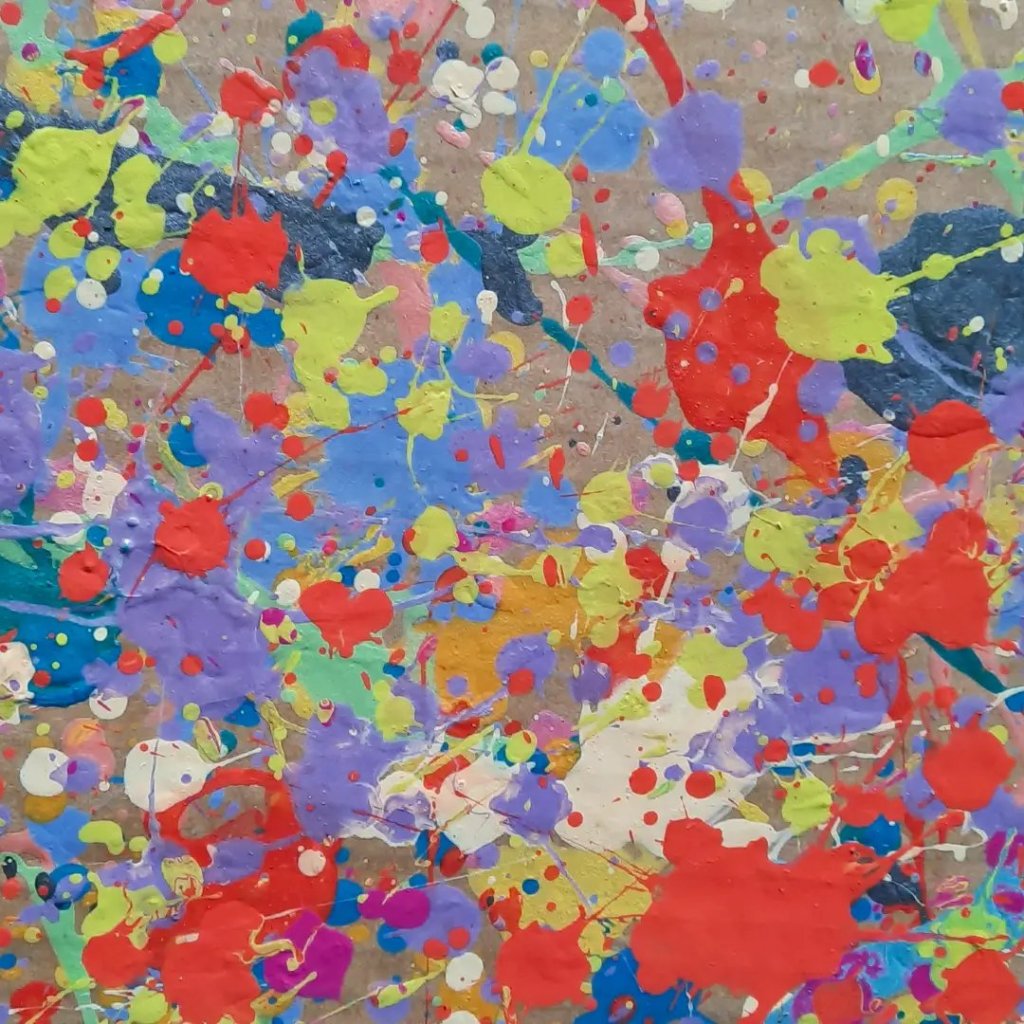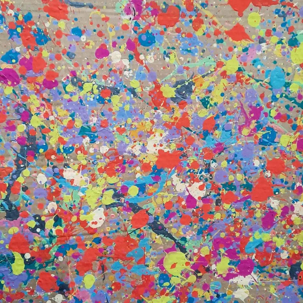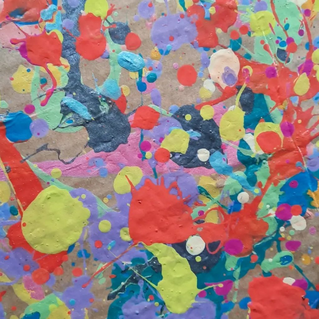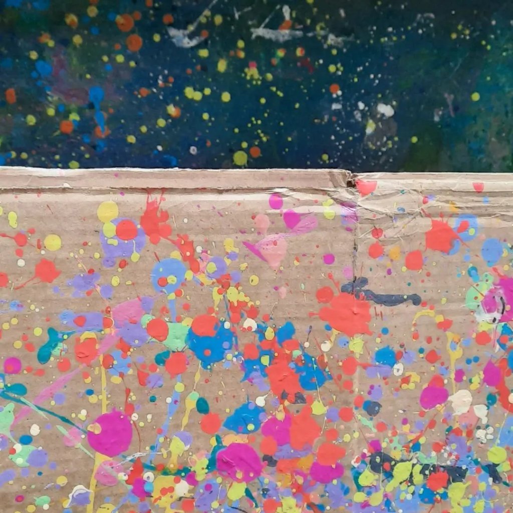 Jackson Pollock inspired art for kids, we used a box so happy to upcycling and added water to our fun bright paints from @globalcolours dip your brush and splatter, definitely out outside sensory experience, magical artworks made!!