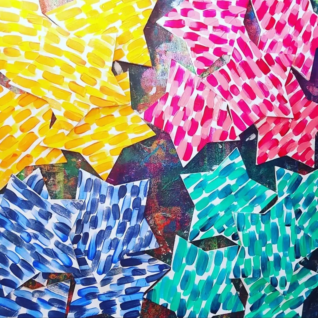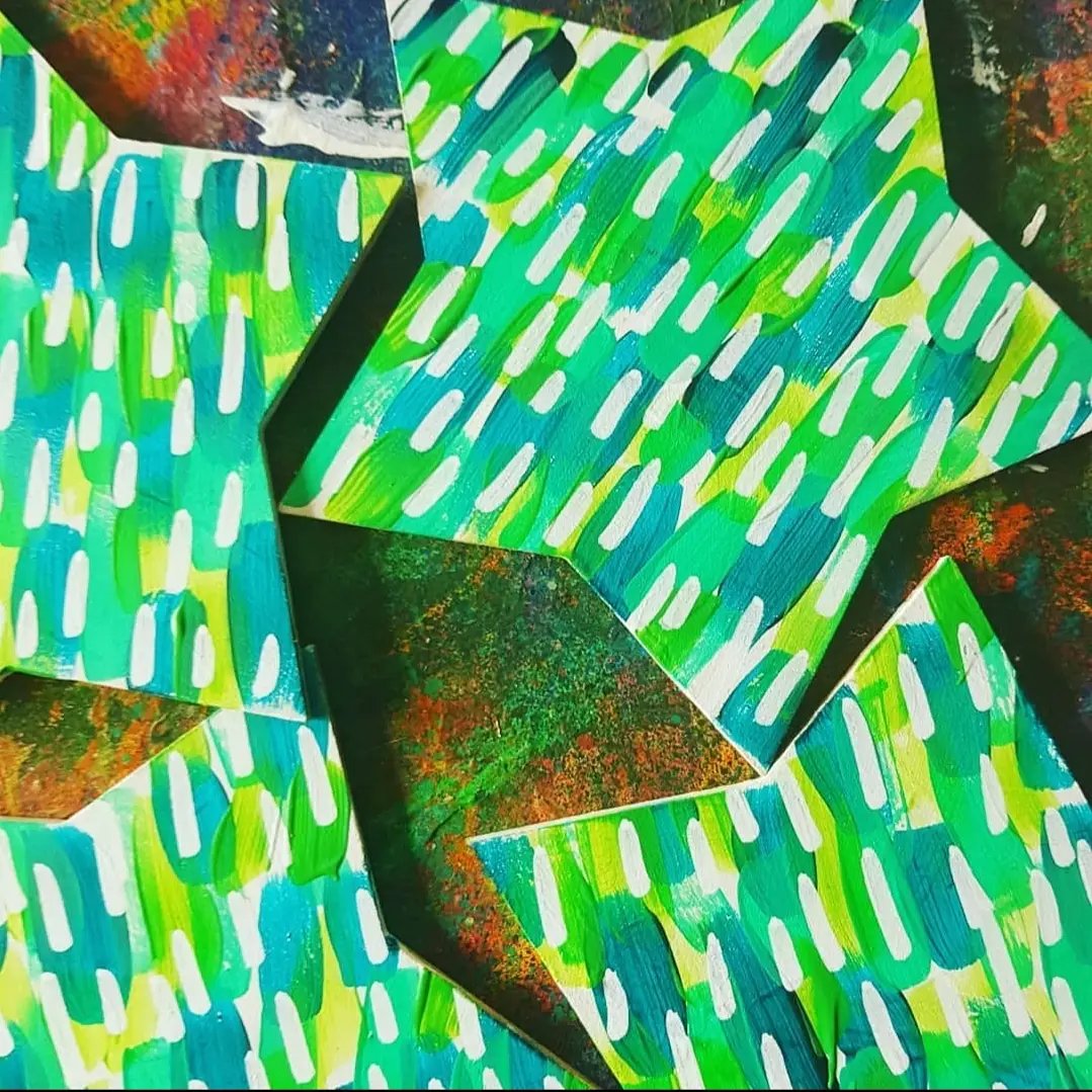 Our pretty stars! These are basic MDF from @spotlightstores and we painted them white and layered each colour, our tip, add 1 colour, wait to dry, add the next and so on! Stop paints from going murky & yucky colours. Then, added white posca marks over the top when finished!! We used global paints from their website and,made in Sydney Australia. Support local always!!