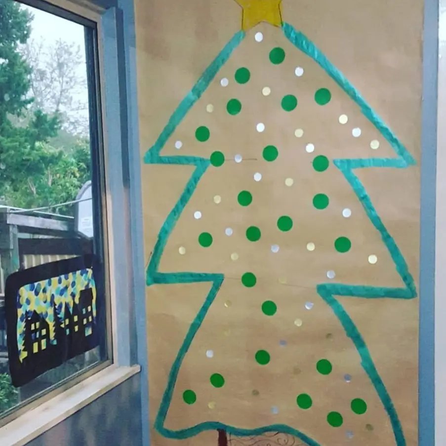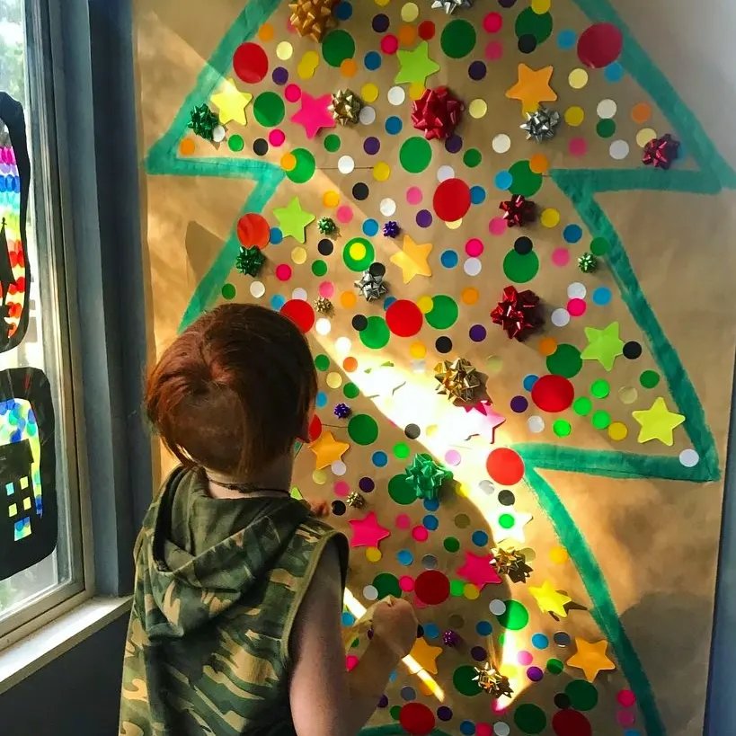 The finishing touches on our paper…….. Christmas tree polka dot sticker decorating project, we rolled out a big sheet of brown craft paper and similar to ikea paper. Draw on a tree with anything! We found stickers at office supplies and ebay or online teaching and craft supplies. How beautiful does it look with decorations!