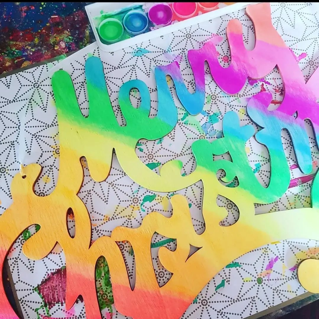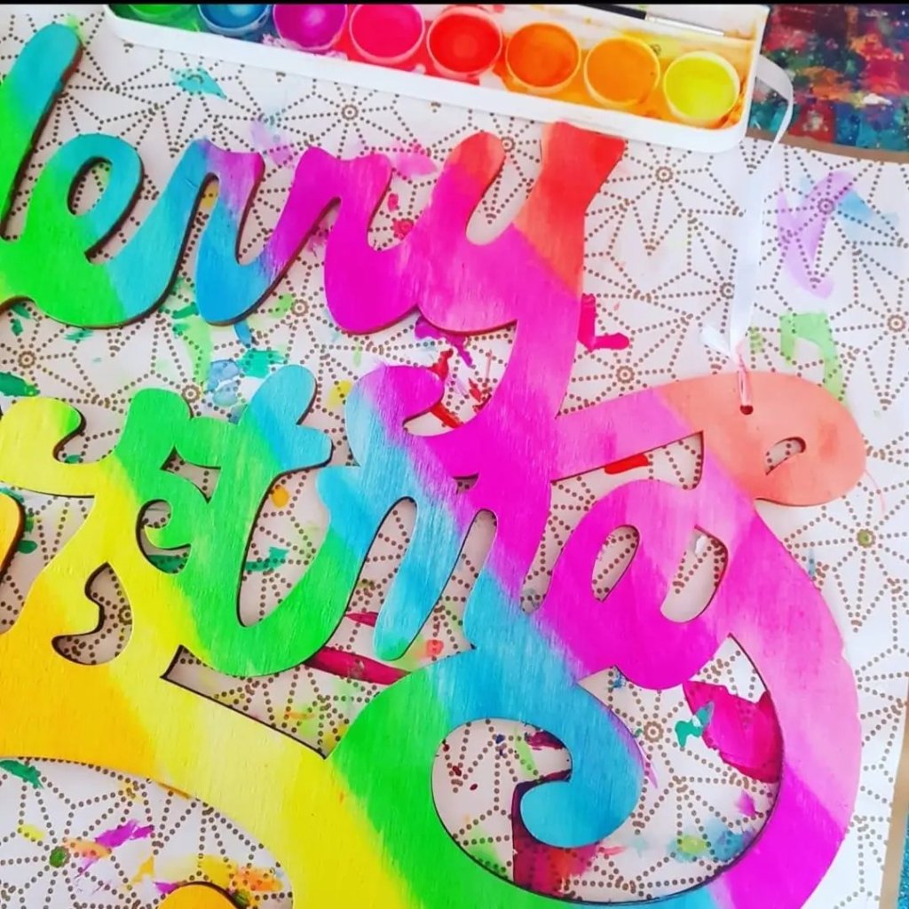 This was fun, a gorgeous plain wooden Merry Christmas sign from @kmartaus Australia & tree from @woolworths_au …. ofcourse we rainbowed it up!!! Using @micador fluro watercolours are the best!!!!!