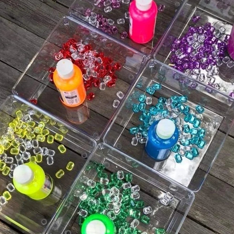 This is soothing and calming and unlimited time spent playing here!!! These clear plastic containers are such a bargain at @kmartaus and have tiny rubber grips underneath!!!! (And coloured bowls for scooping water) Awesome fluro paints from @cleverpatch We added coloured crystals to also add to the sensory part & colour sort into bowls.