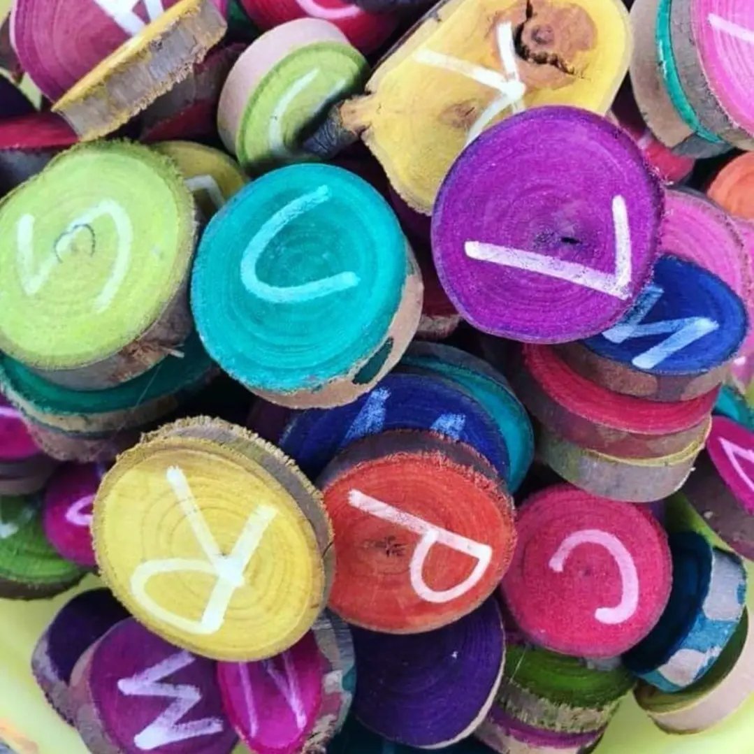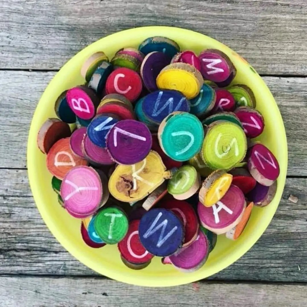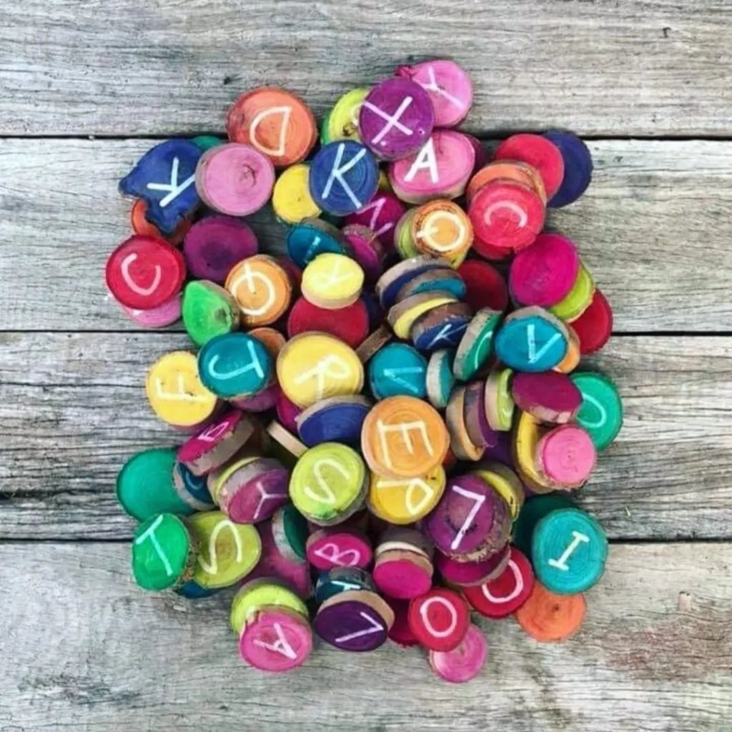 Our wooden tree branches pieces sanded back and using a white posca marker to draw the alphabet. They are dyed with watercolour paints but can also use powdered dyes & paints, they asorb really well. They have been something different to use with spelling activities. They store easily in a pretty jar or our @bunnings box. We have used or little branch pieces for a few things, We cut up big sticks found on the ground, we only use fallen branches and allow them to dry if damp.