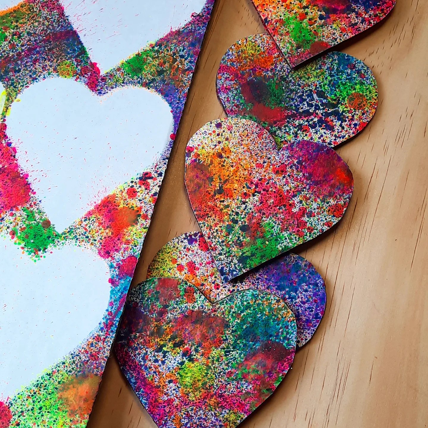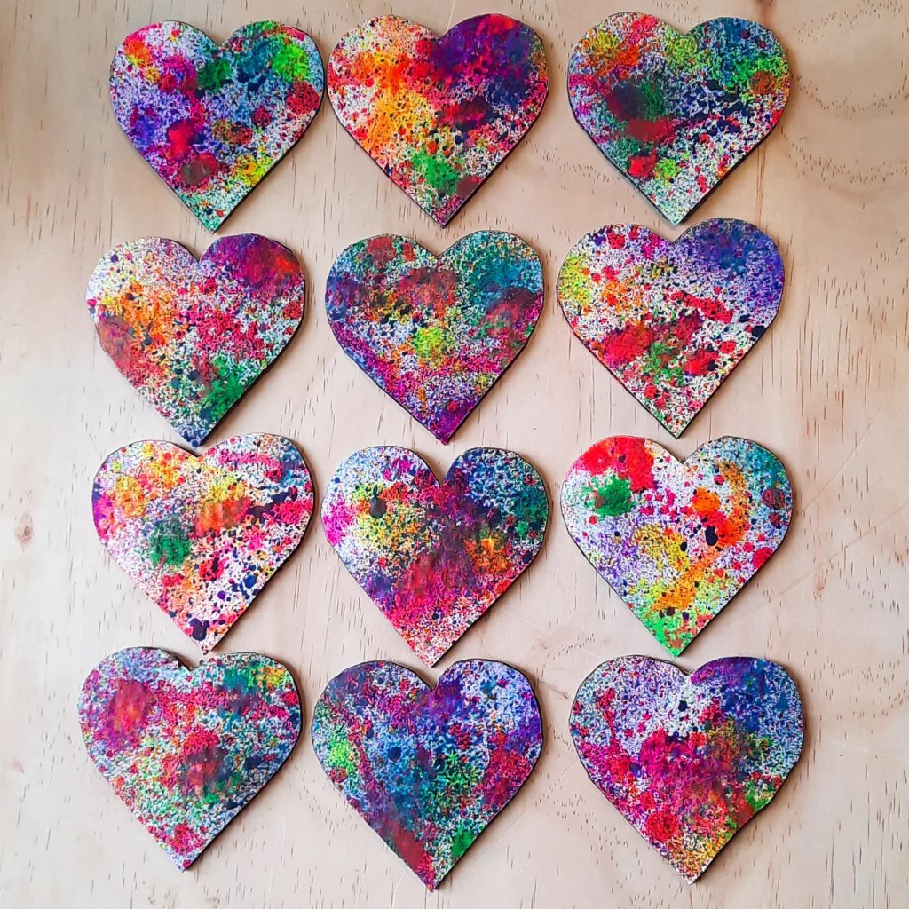 We absolutely love hearts! We upcycled some cardboard and traced out some hearts and used the fun spray paints from @kmartaus and kept layering until it was filled with every colour!!