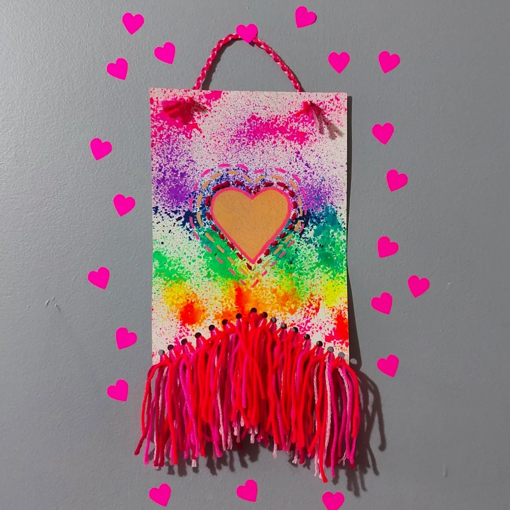 #cardboard #cardboardcrafts #cardboardproject #fluorescent #wool #paint #paintsticks #homeschool #kidsart #childrensart #kidscraft #crafty #craftykids #heartcraft #heart #recycledcraft #rainbow #create #creativekids #valentines #rainbowcraft #rainbowart #rainbow #artstudio #artspace #heartcraft #hearts #diy #valentinesday