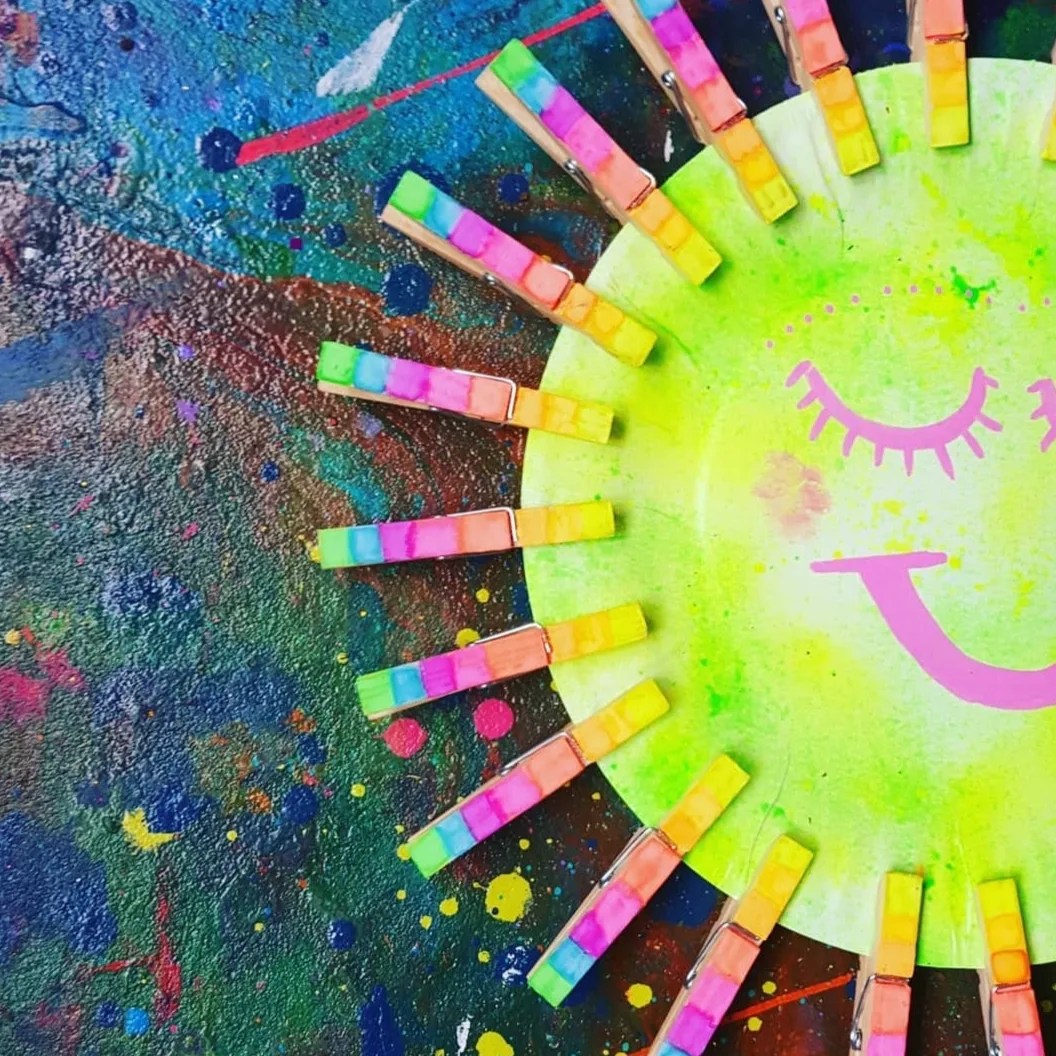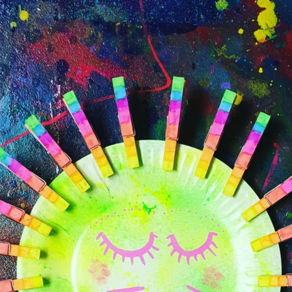 Neon pegs, turned these plain wooden pegs into bright fluro sun rays and painting a good old paper plate for the sun’s face……… hope you feel inspired and join in and share your crazy bright neon creations!!!!