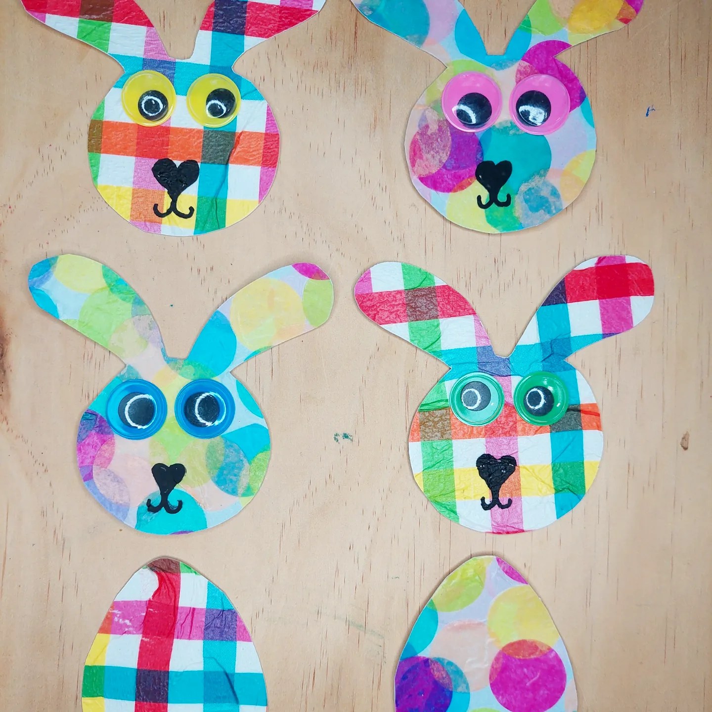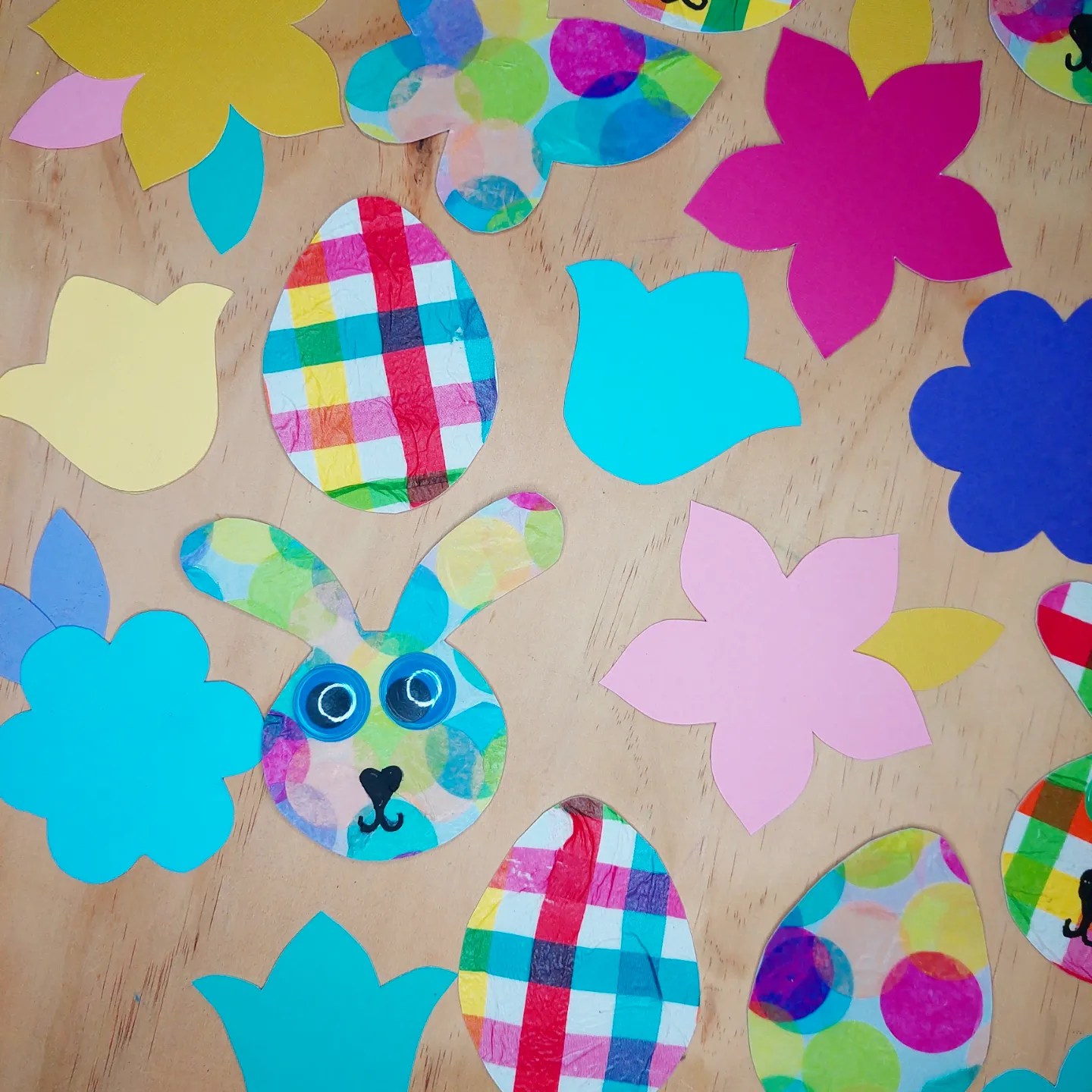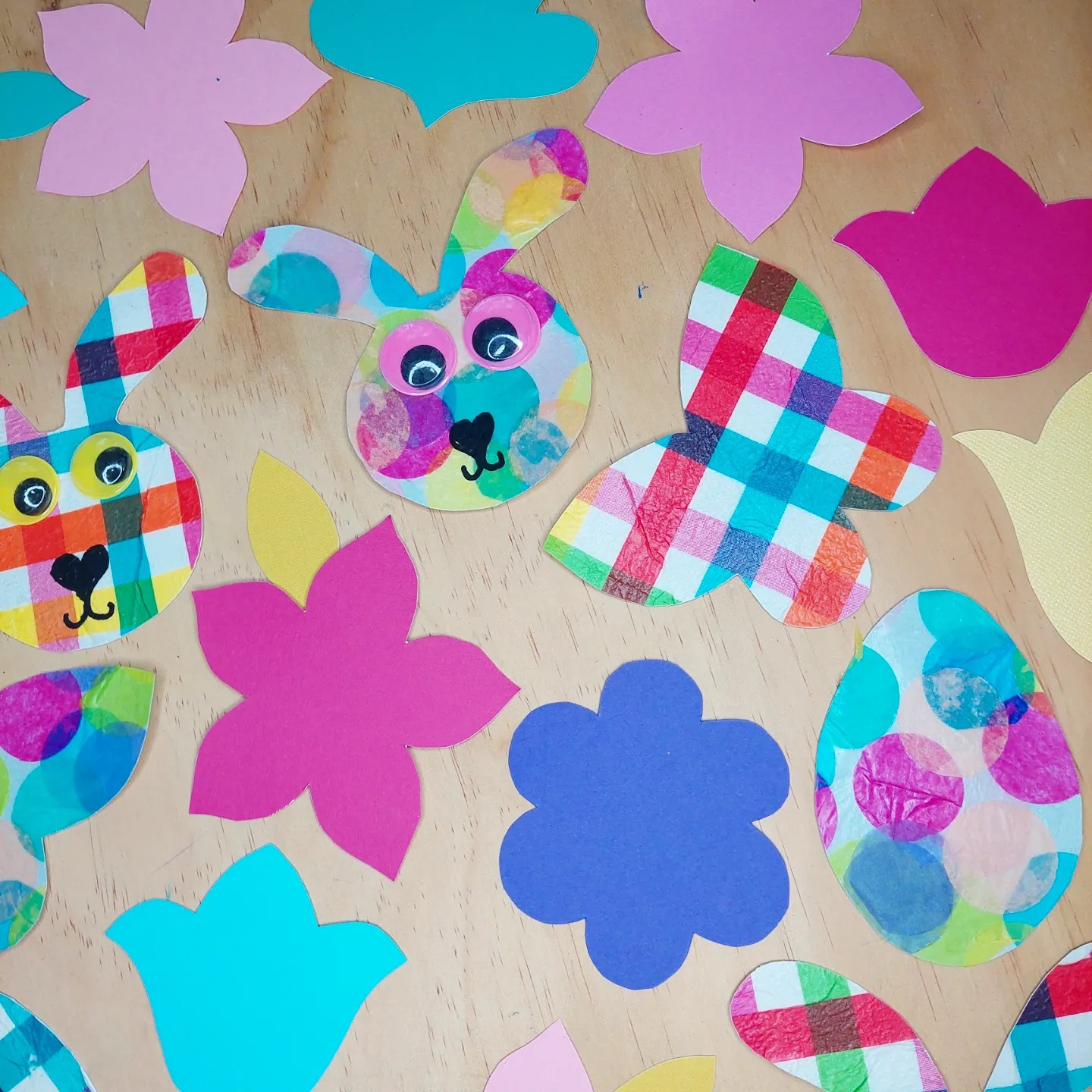 We had some Easter cookie cutters we used to trace around for the shapes, napkins from the supermarket and confetti dots, glue & cute wobbly eyes are from @krafterskorneraus
