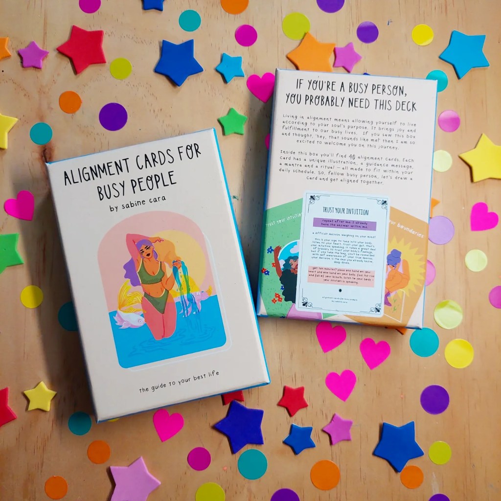 I love supporting other inspiring creative souls, Sabine ….. your cards are so helpful and important in supporting everyone through alignment cards. Helpful messages & prompts on the back of each card. No rules on how to use these, choose 1 a day or pick a few, all messages are filled with goodness to start your day!!