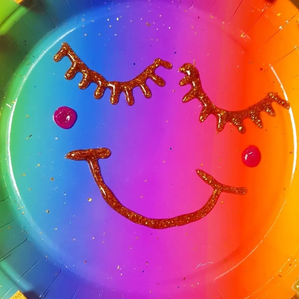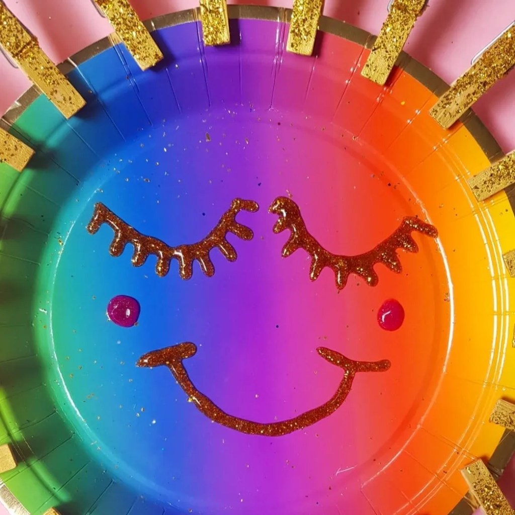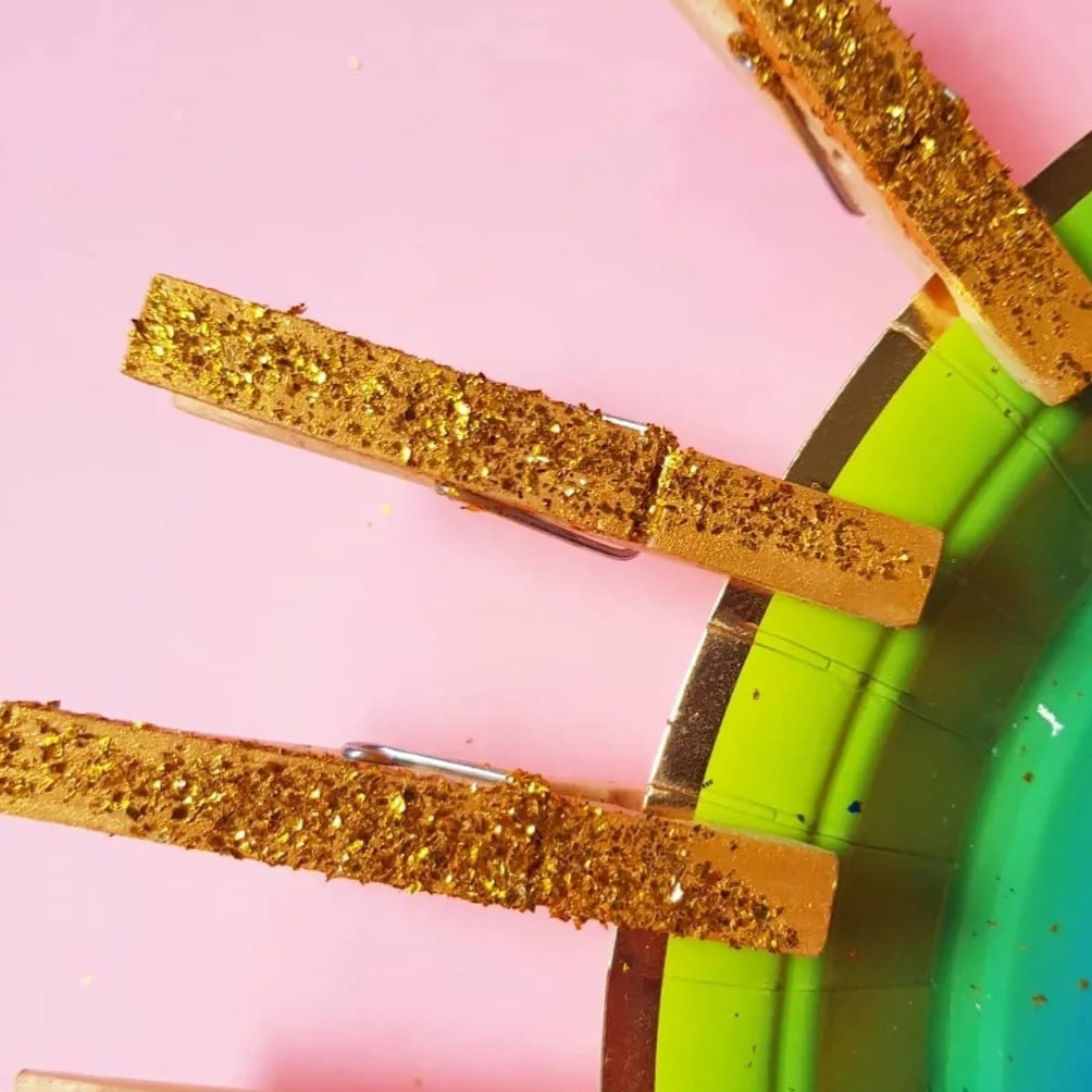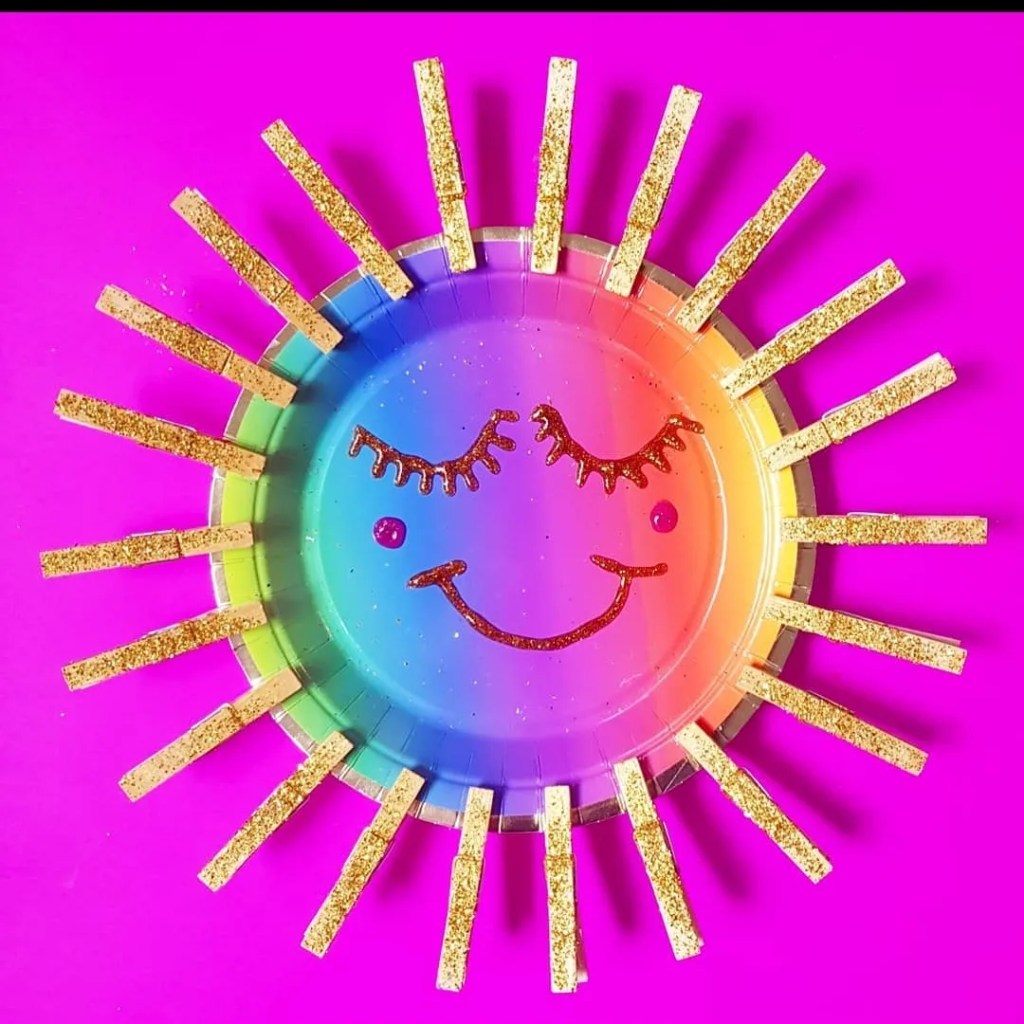 We found some plates party shops, dollar stores, ebay, @kmartaus & @targetaus & wooden pegs from @bigwaustralia or @bunningsbunnings We used this rainbow one from @targetaus but you could make it with any coloured plate and paint the pegs. We used gold glitter & glue for the pegs and glitter puff paint to make the face