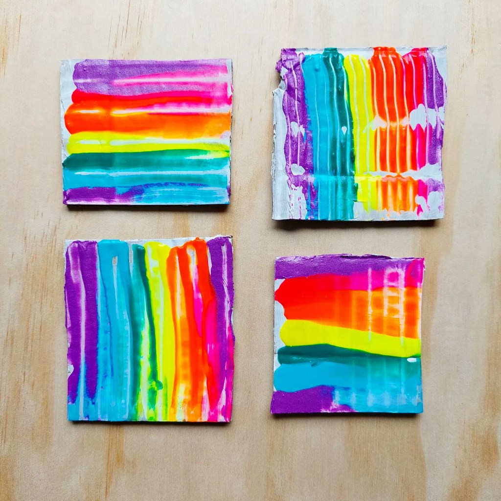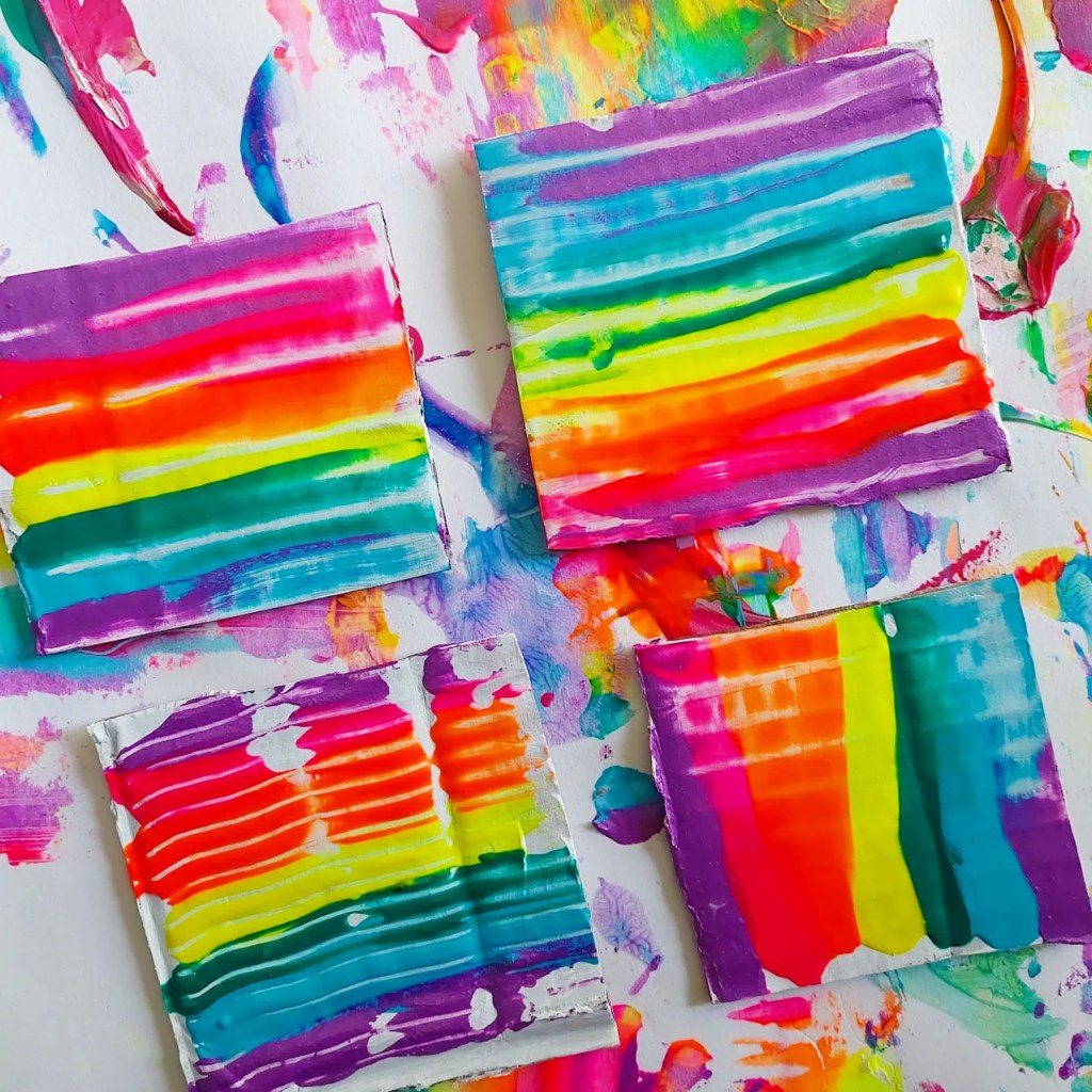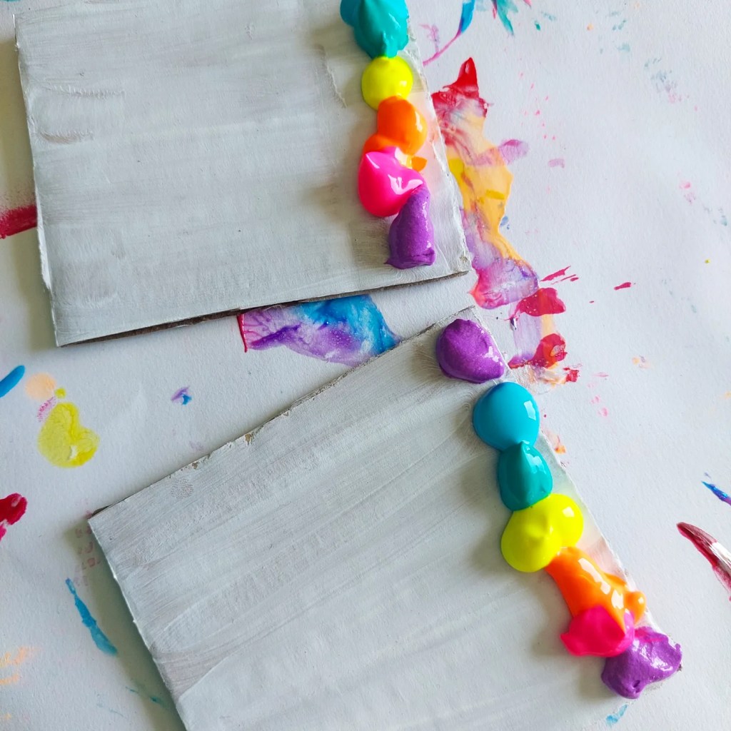 Tiny art, how cute are these mini canvases on cardboard mini paintings made using fun fluro paint from @kmartaus adding a bit of texture using paint scrappers from @riotartandcraft & @bunnings