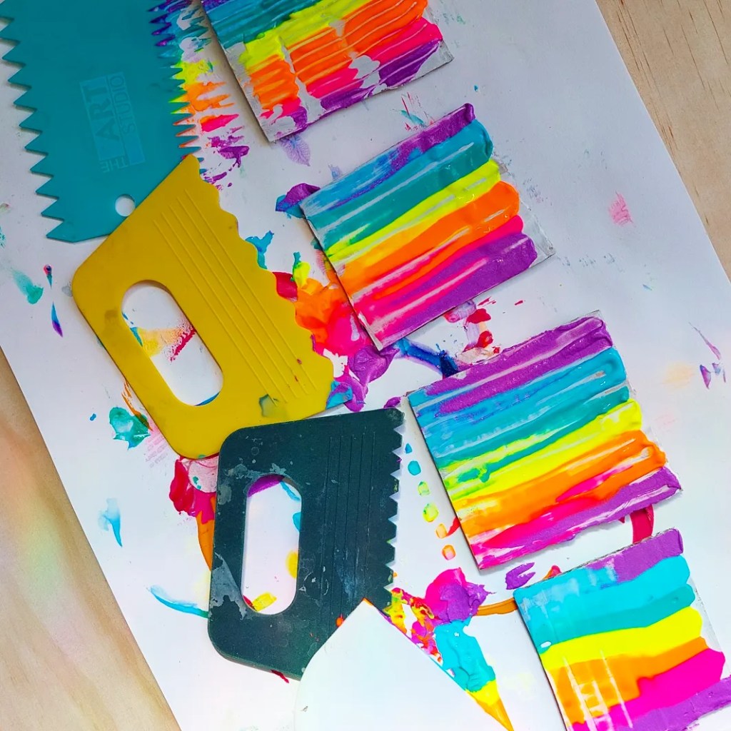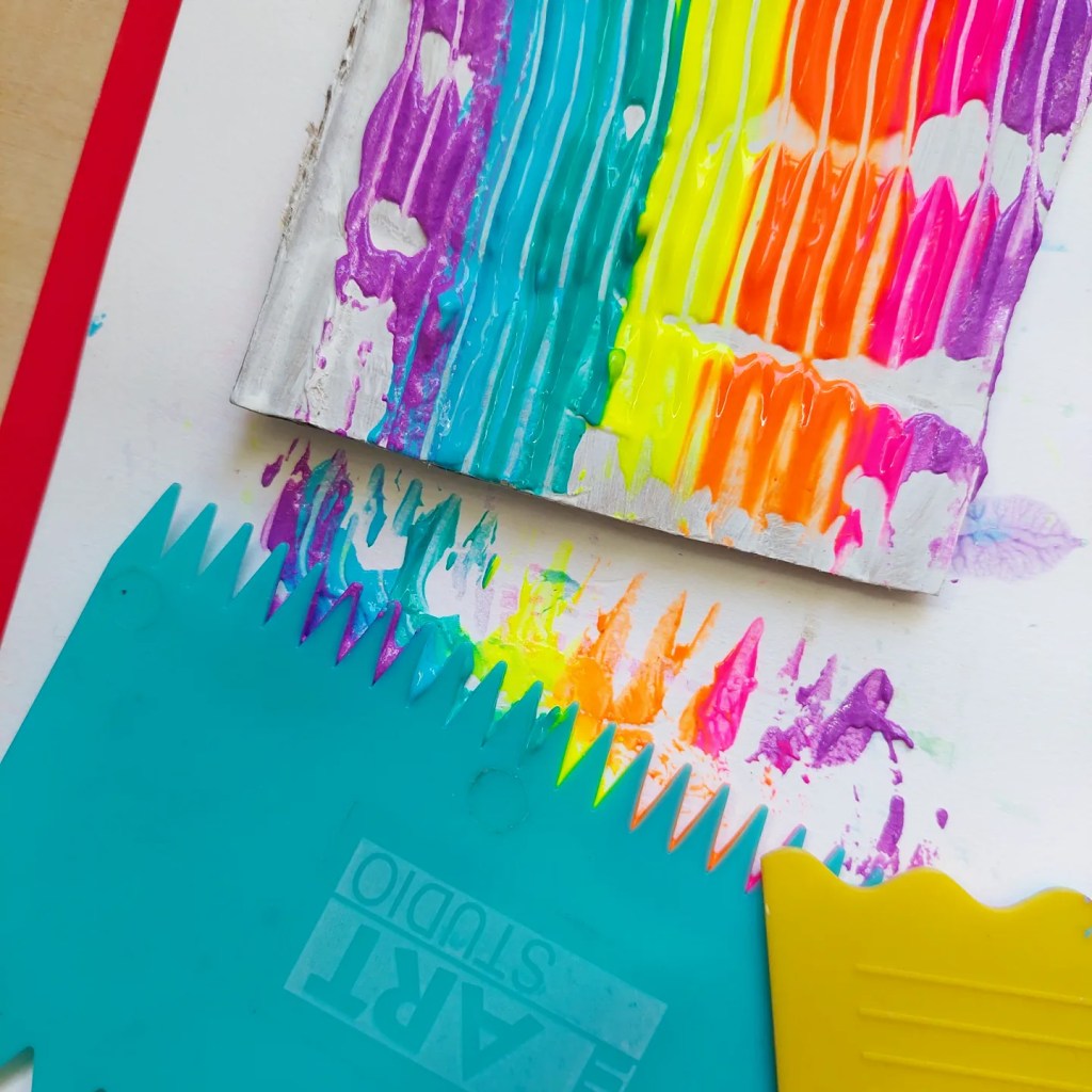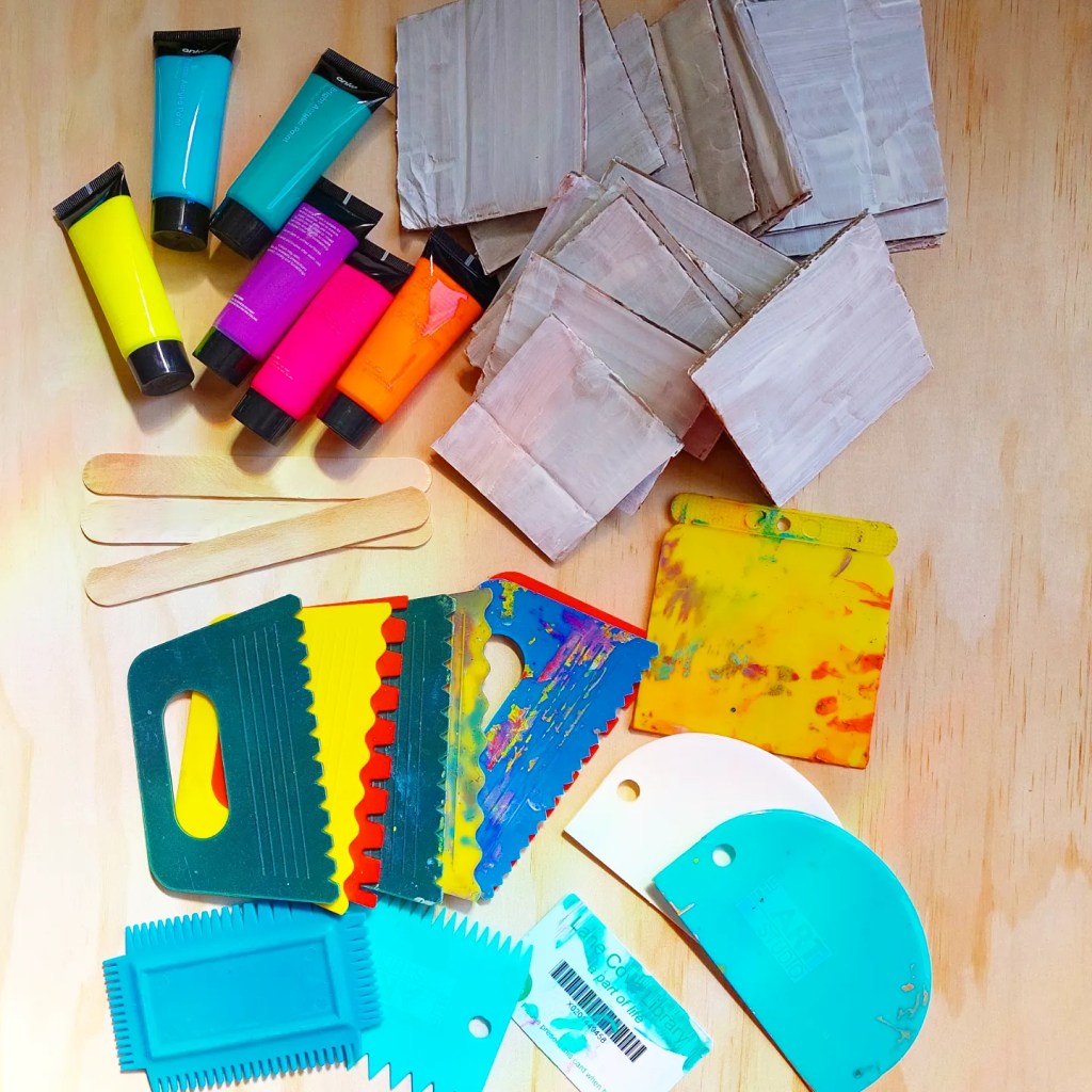 Tiny art, how cute are these mini canvases on cardboard mini paintings made using fun fluro paint from @kmartaus adding a bit of texture using paint scrappers from @riotartandcraft & @bunnings