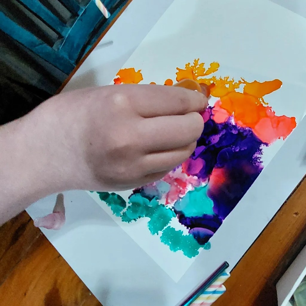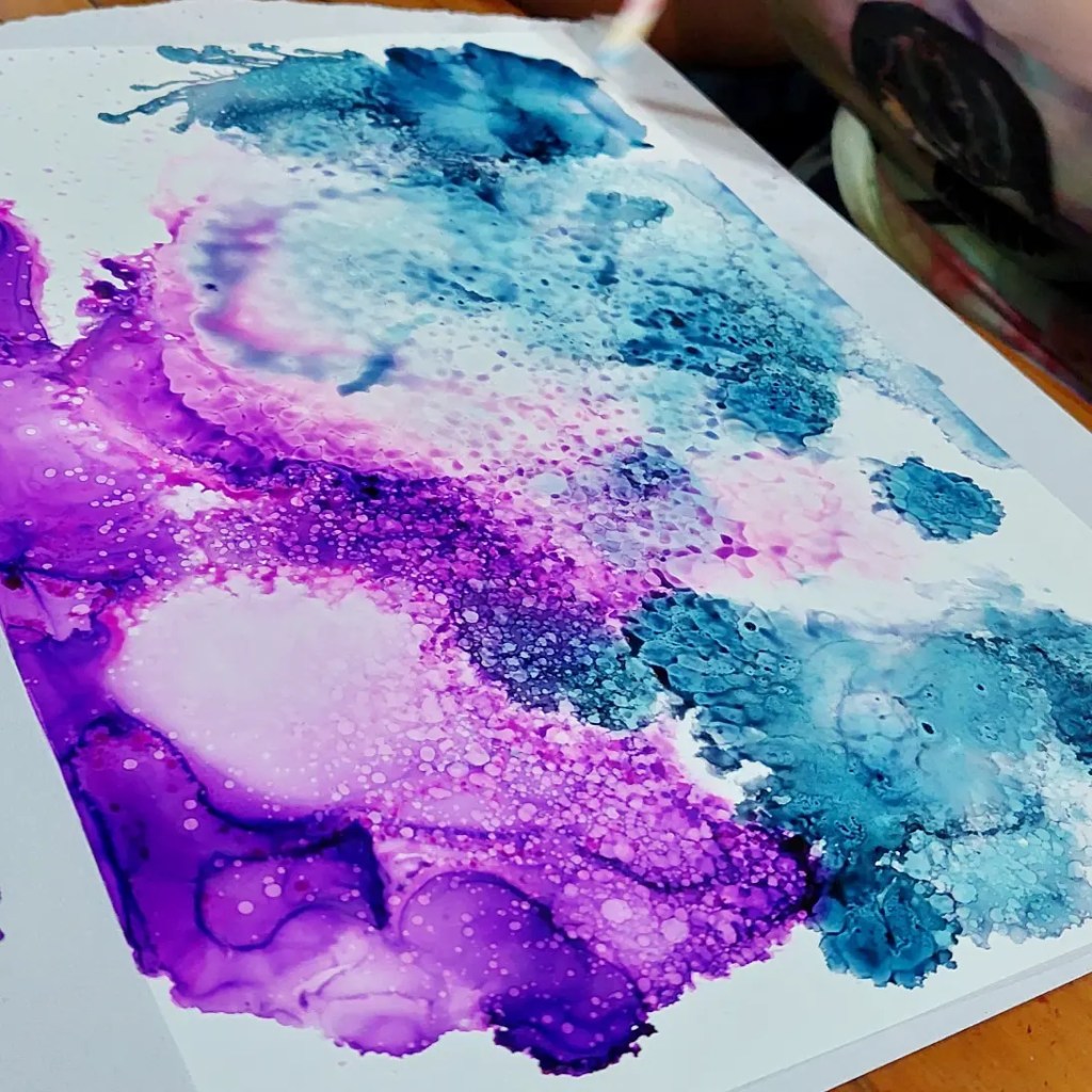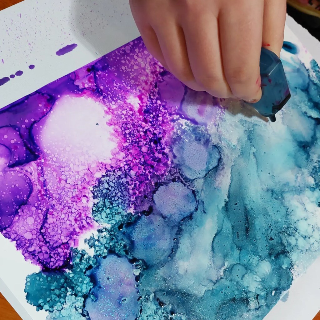 Alcohol inks, my oldest Scarlette making some really gorgeous colour blends with Alcohol inks on yupo paper from @riotartandcraft