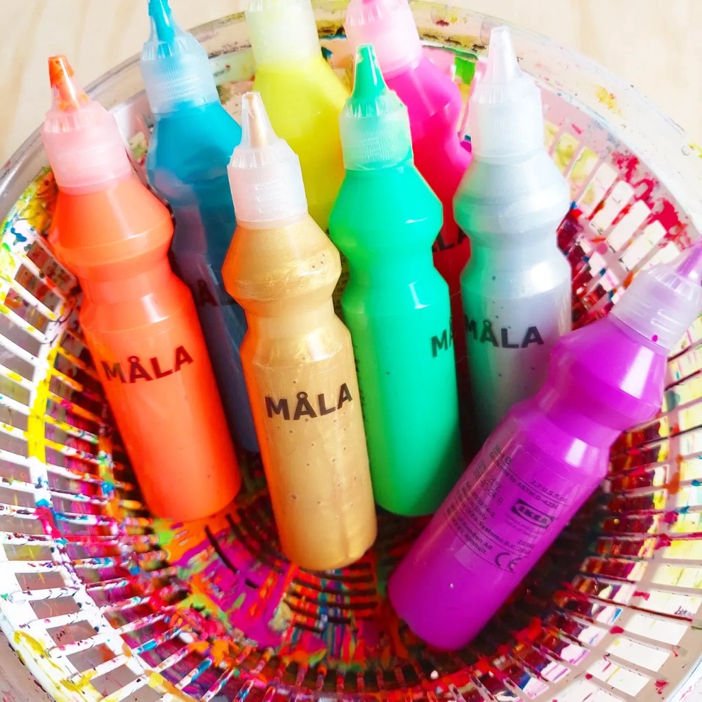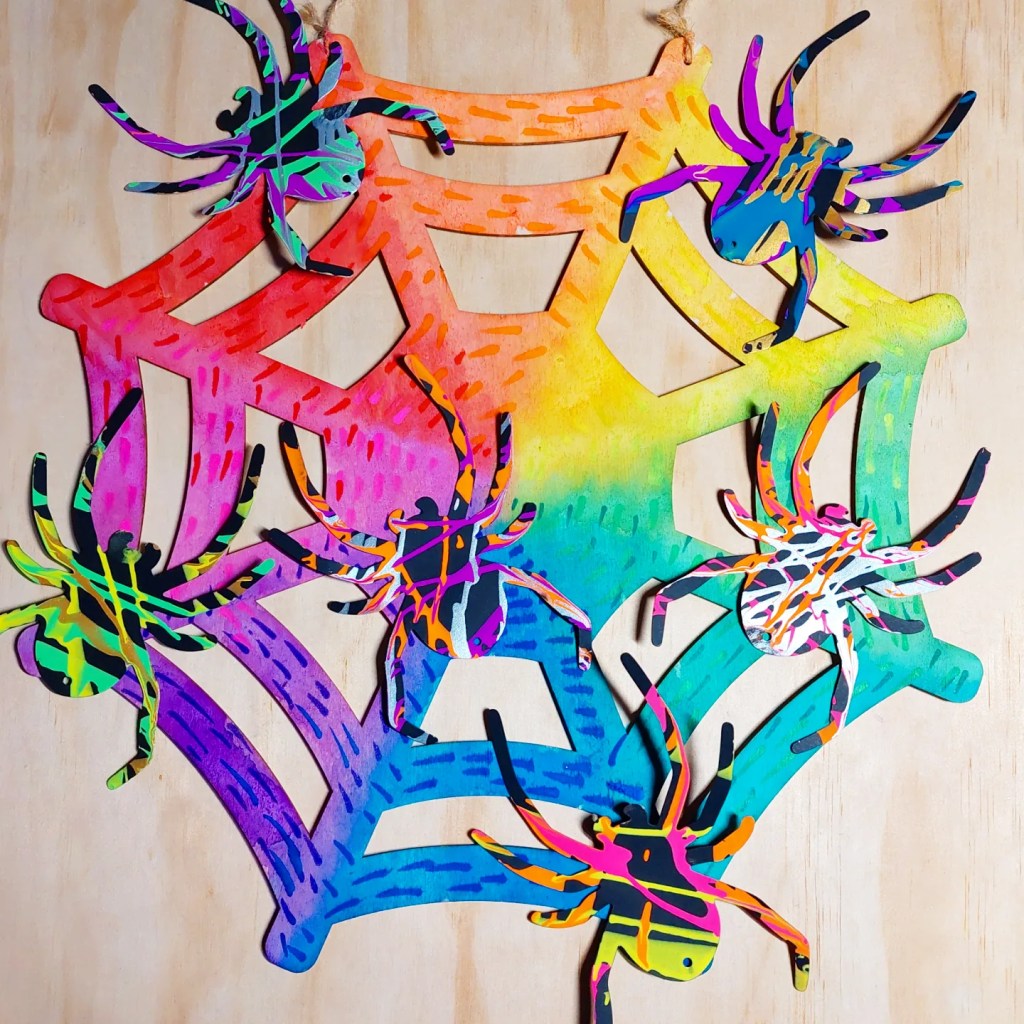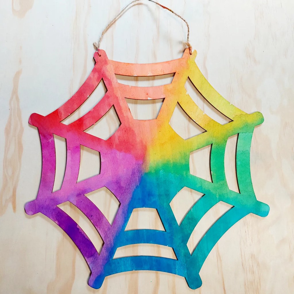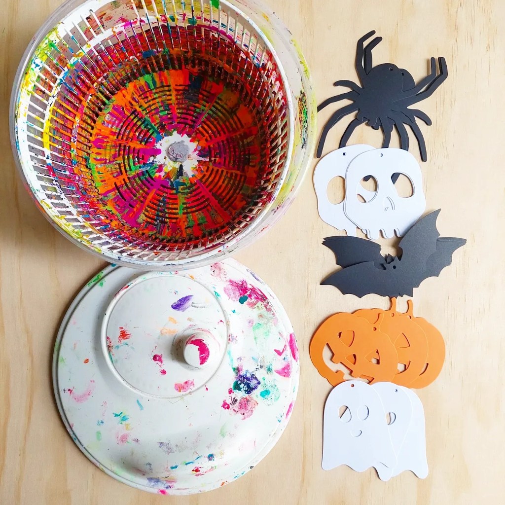 We used the vibrant watercolours from @micador on the web and used the fun salad spinner painted spiders ontop from a few posts back.