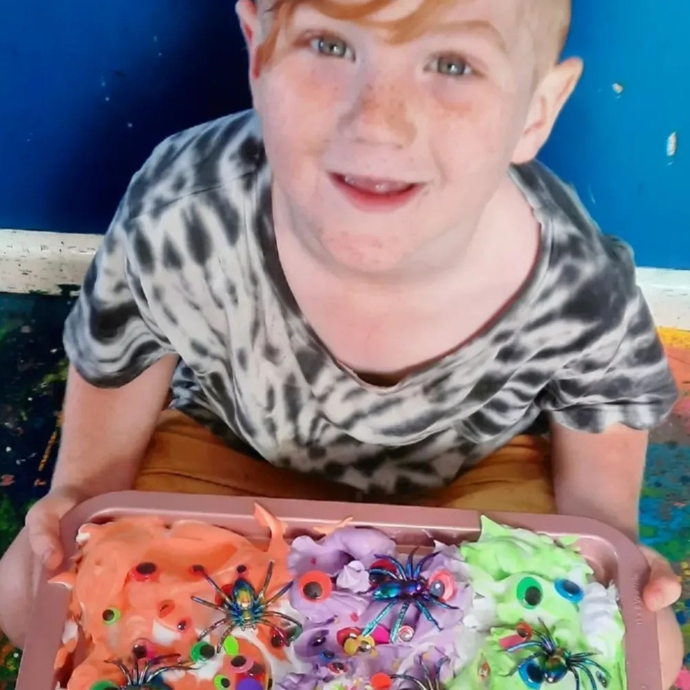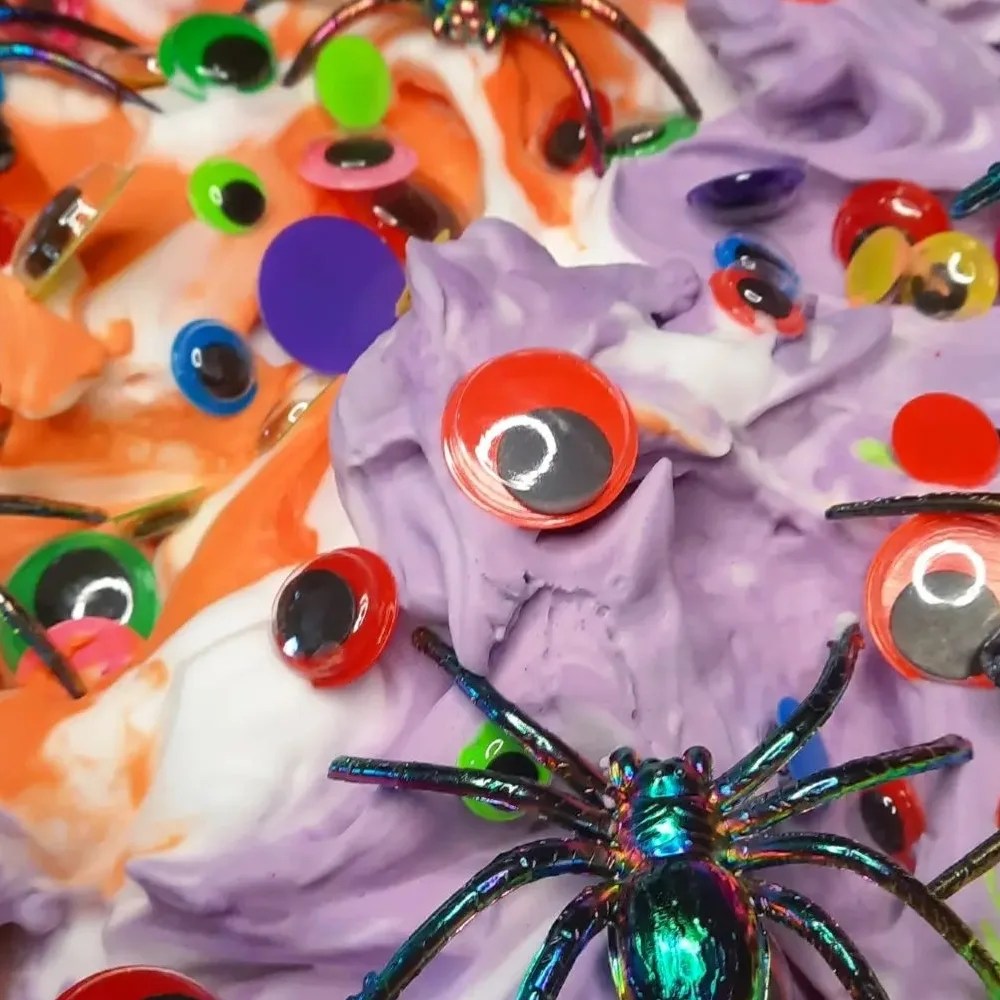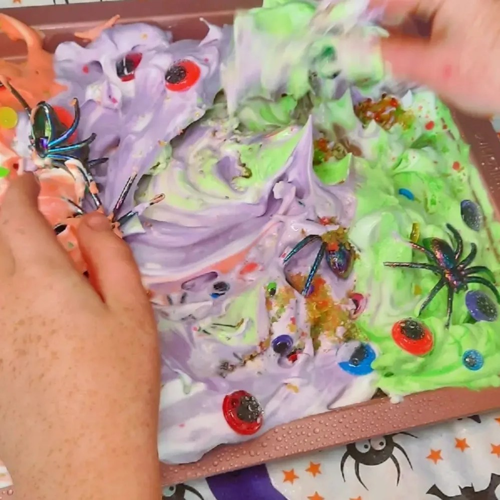 Shaving creams, eyes & spiders, for extra fun add crackling candy for a noisy sensory delight!!