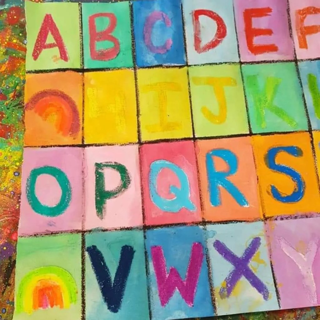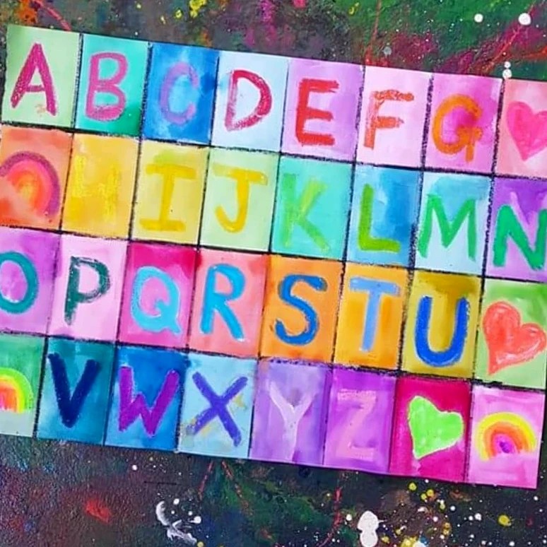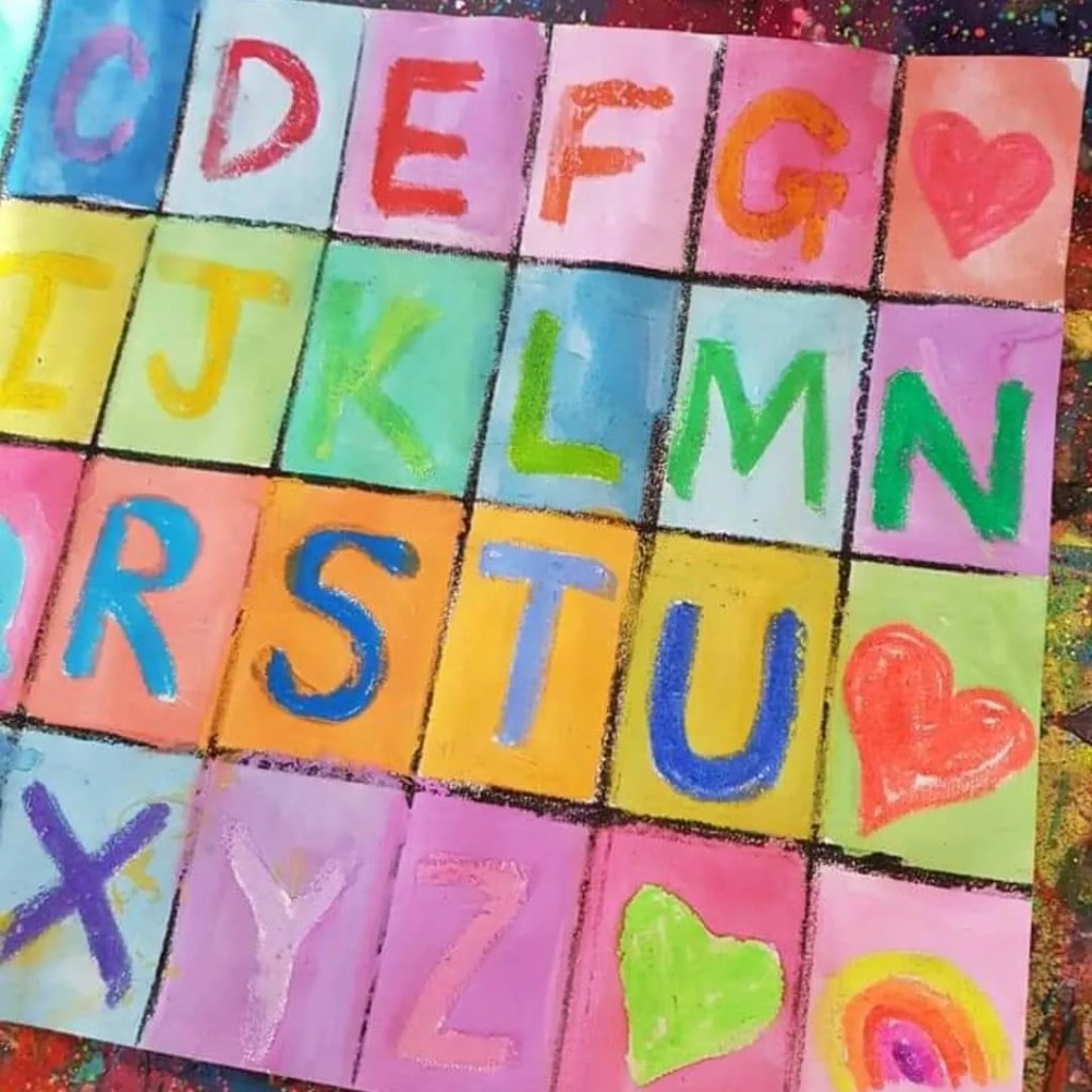 Made our gorgeous background using baking paper and added white oil pastels outline to the letters to make the pop a bit more!