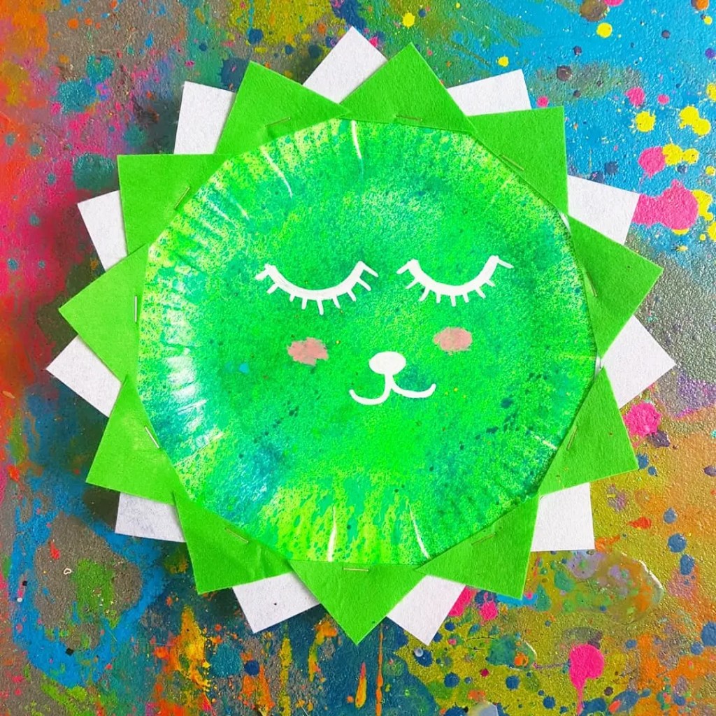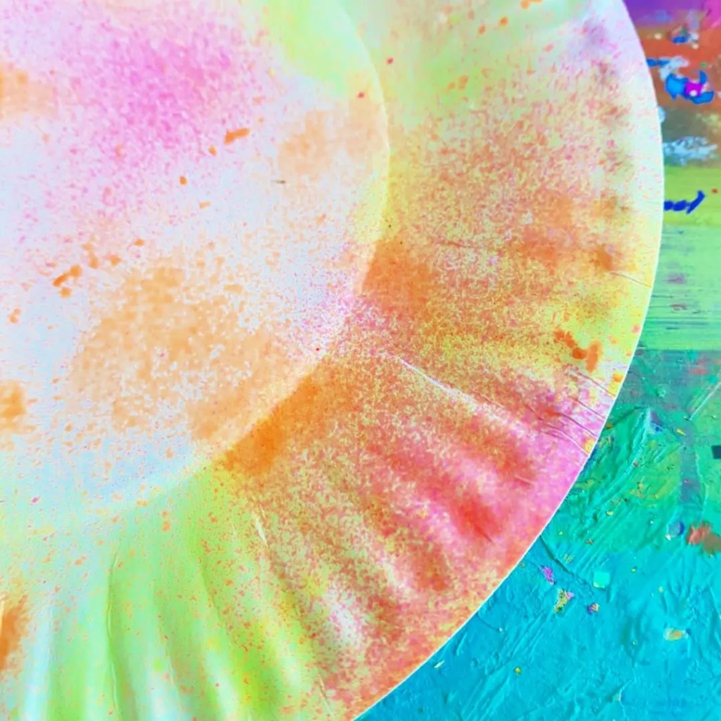 Our plain white paper plates from @colessupermarkets and our little felt triangls from a kmart mosaic kit in the kids craft section, spray paint effect using kmart fluro pump bottles. We used a stapler to attach triangles into the plate.
