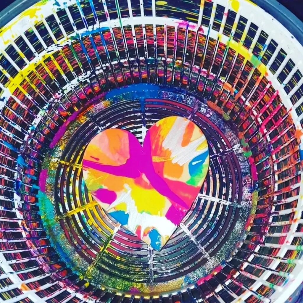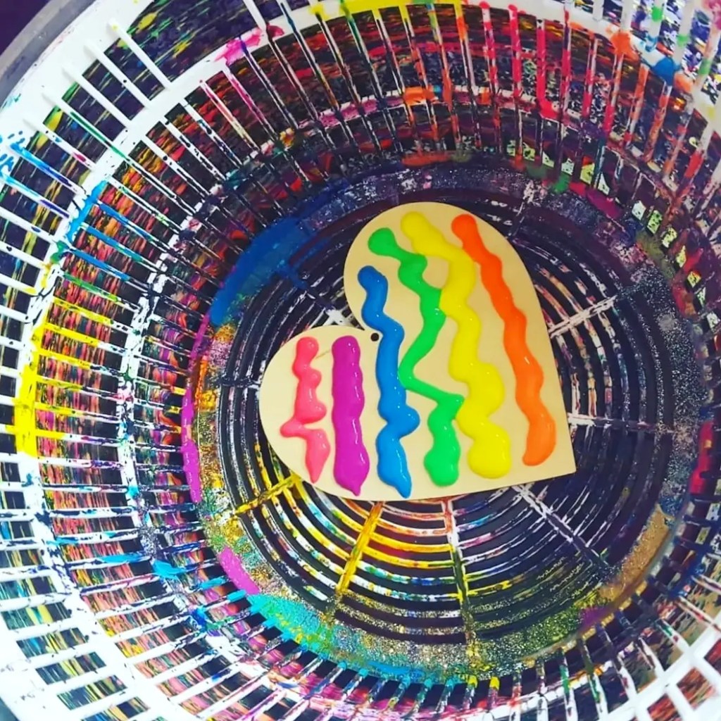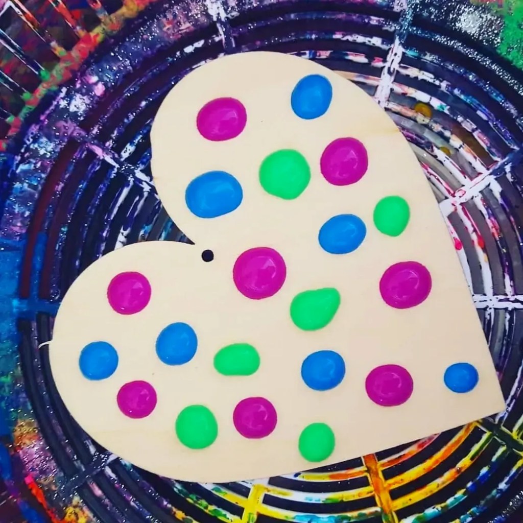 Salad spinner art!!!! Our bright wooden hearts from @bunnings craft section or @spotlightstores through the salad spinner. Ready set go…… spinnnnnn………..Ikea salad spinner hearts looking so pretty with an old favorite with the kids….. especially the boys who can get some energy out by spinning the lid.