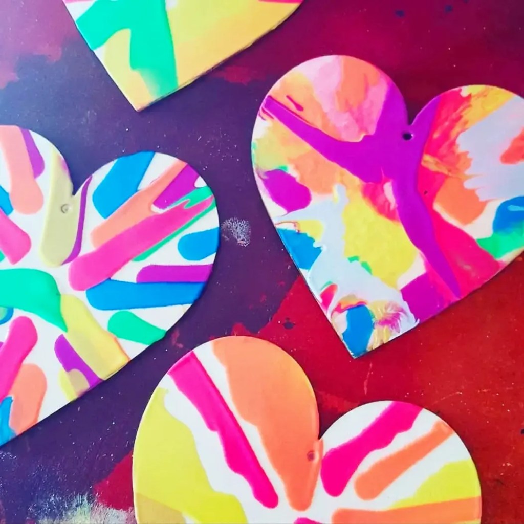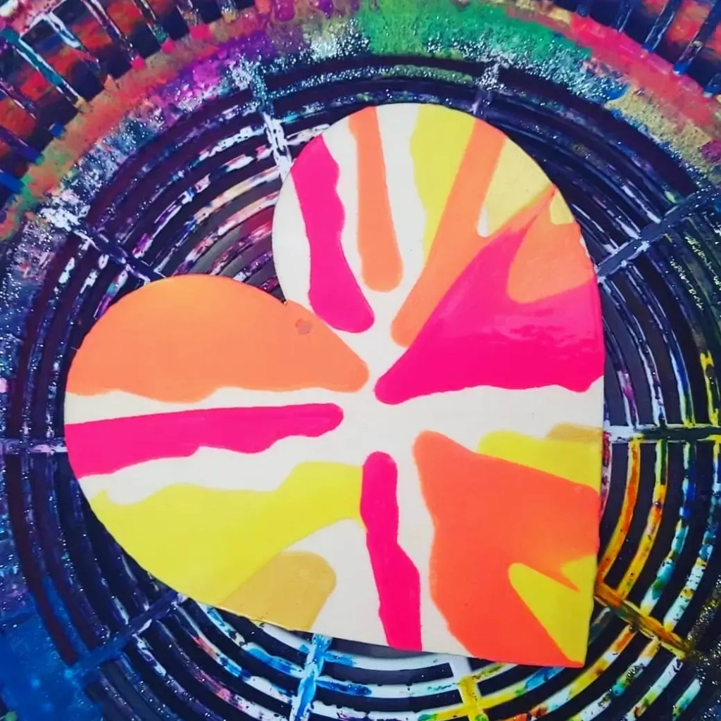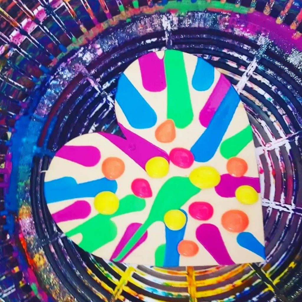 Salad spinner art!!!! Our bright wooden hearts from @bunnings craft section or @spotlightstores through the salad spinner. Ready set go…… spinnnnnn………..Ikea salad spinner hearts looking so pretty with an old favorite with the kids….. especially the boys who can get some energy out by spinning the lid.