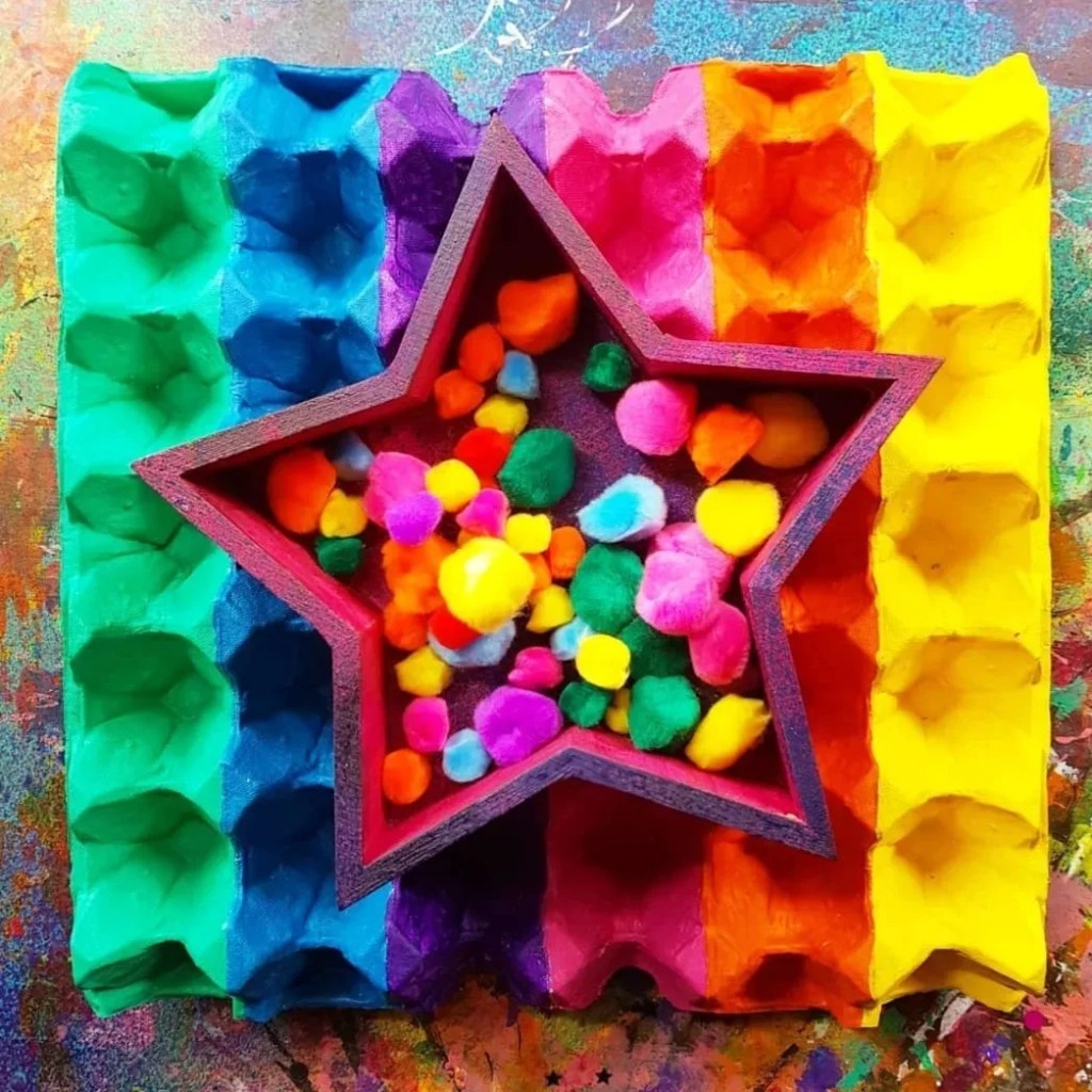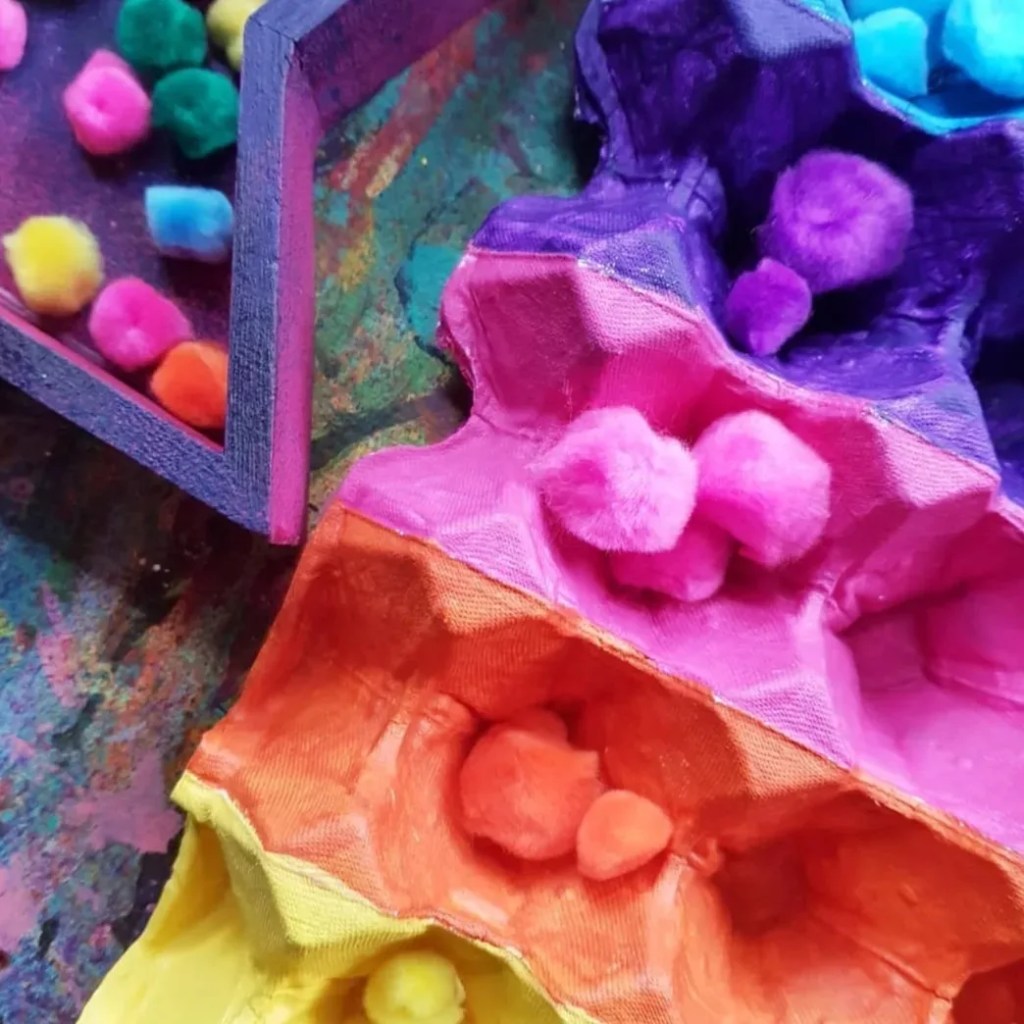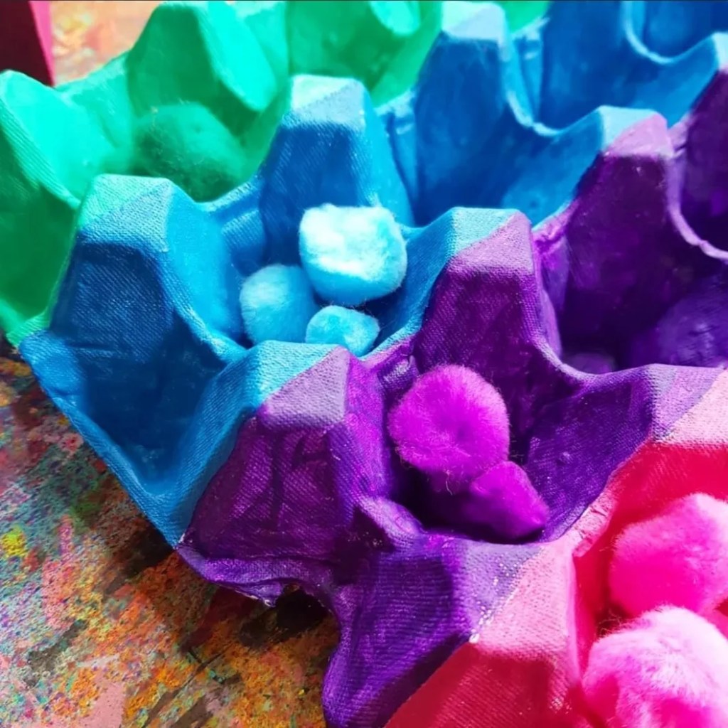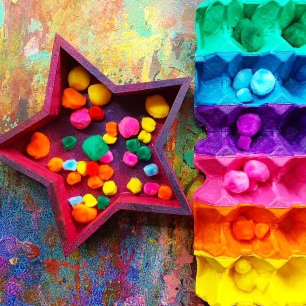 These beautiful fluff balls of sensory goodness are perfect for our colour sorting activity, upcycling an egg tray made of cardboard and our bright pompoms from @krafterskorneraus …. perfect for kids of all ages!!!