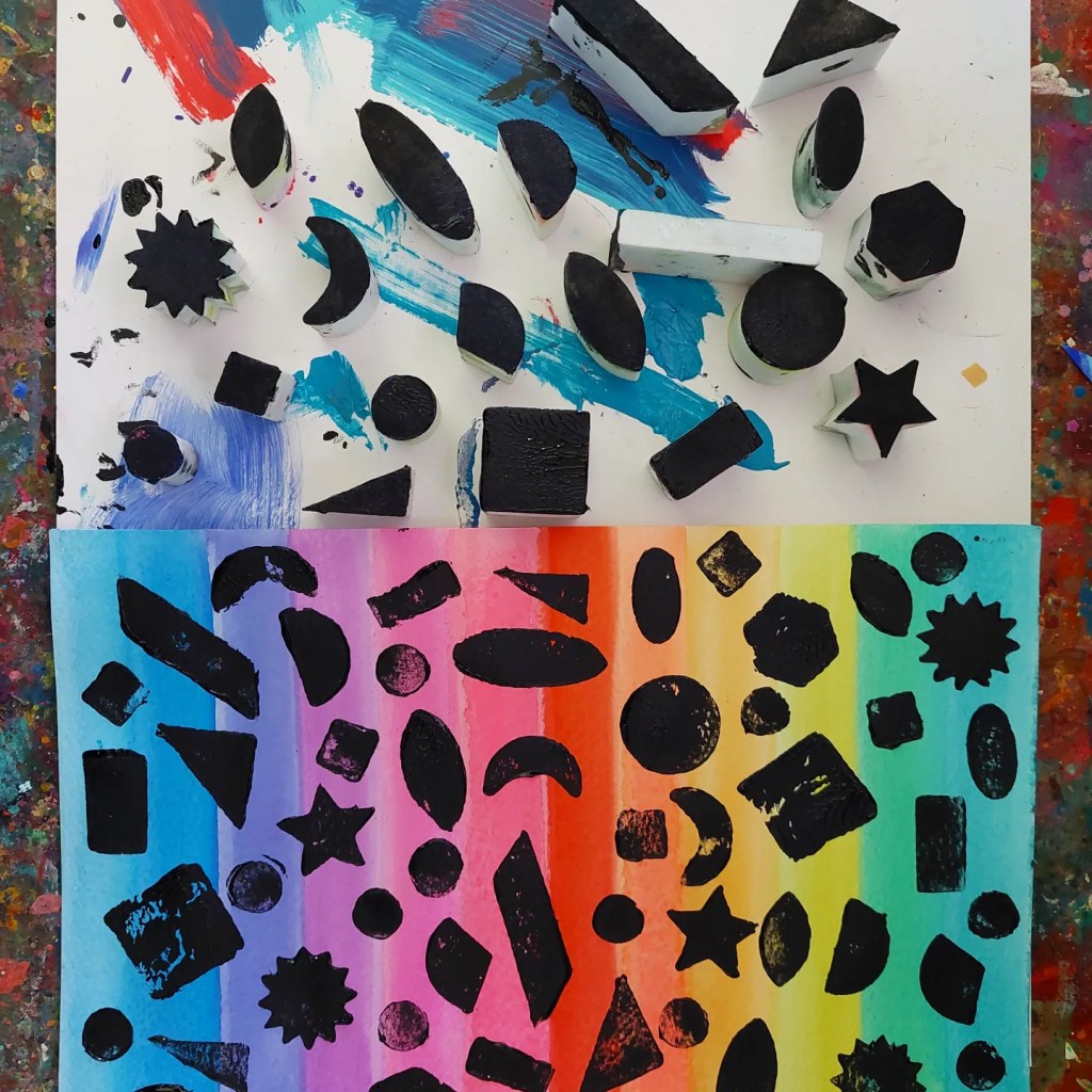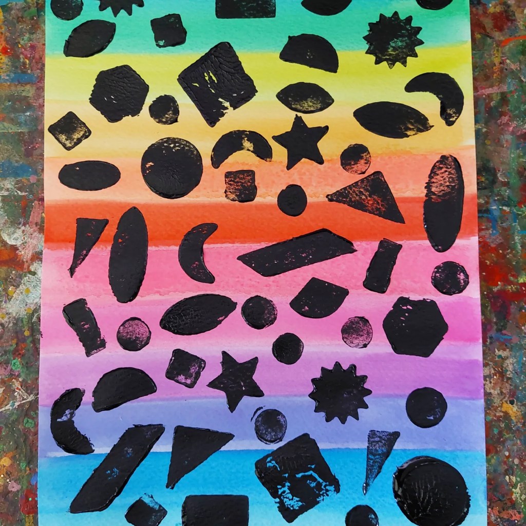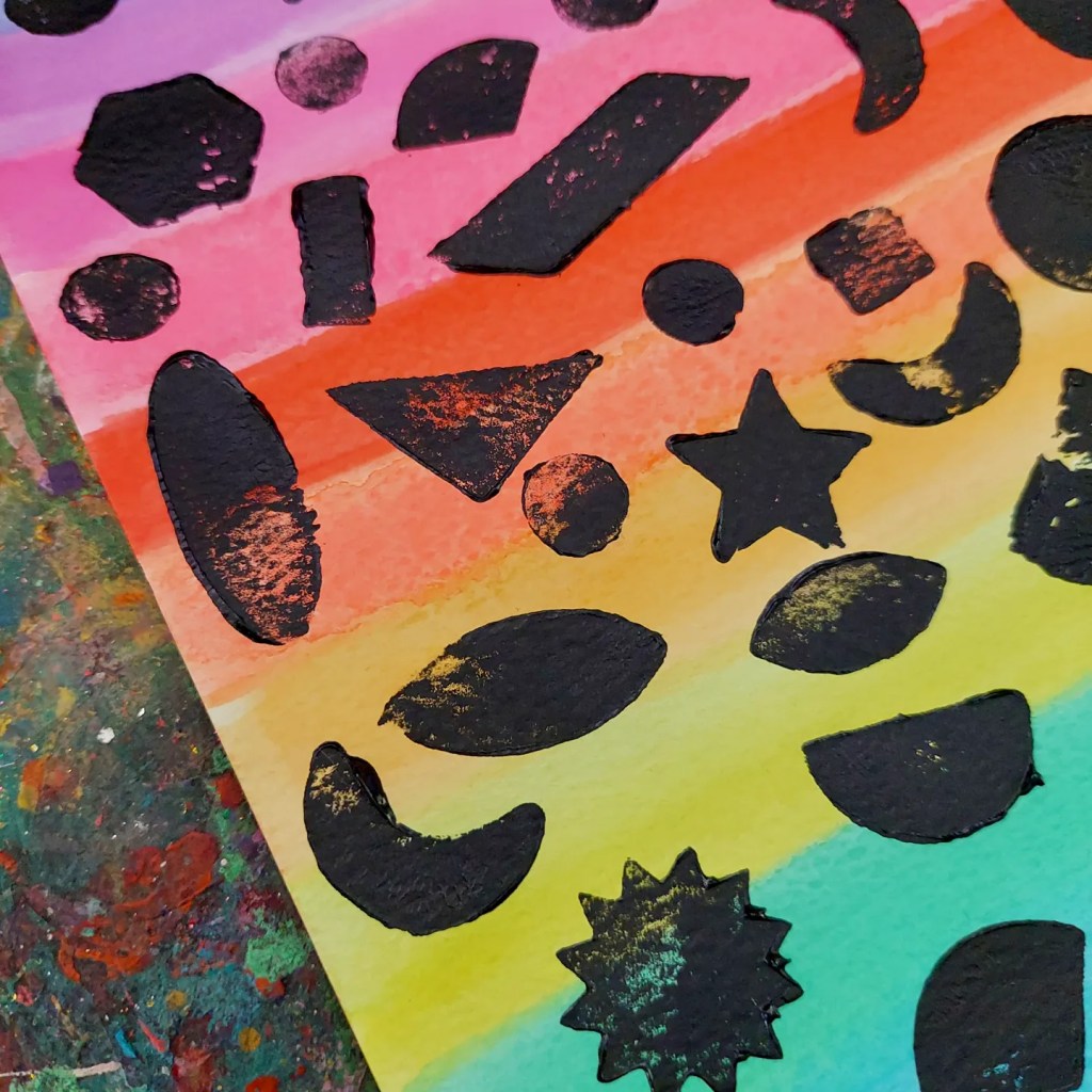 Working with fun sponge stamp shapes from @zart_art of the rainbow watercolours makes the contrast so bright & effective.