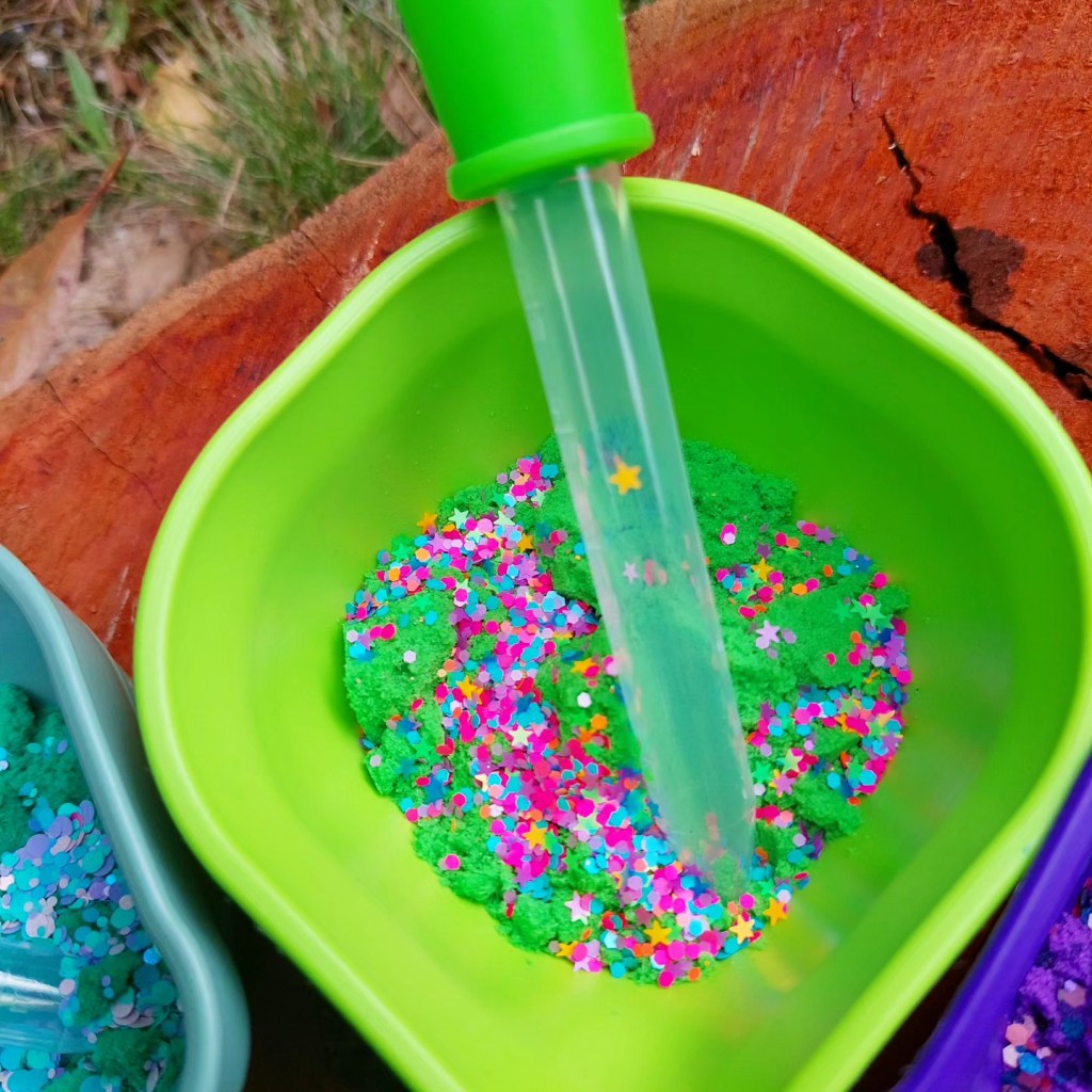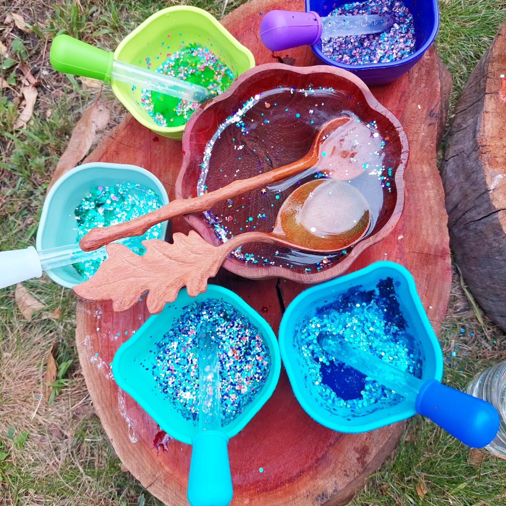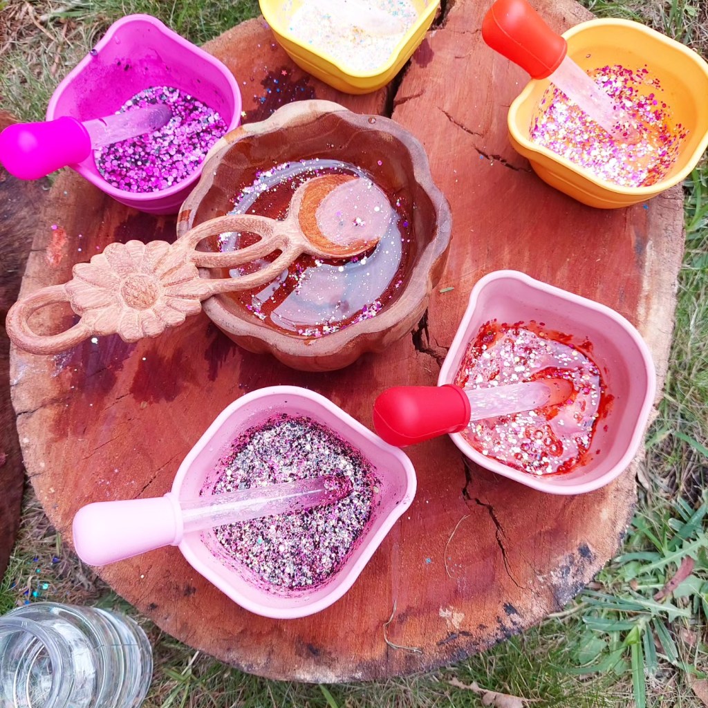 Magic potions!!! So beautiful, our devine glitter from @glitter_heaven_australia , our wooden mixing tools and daisy bowls from @the.curated.parcel & our fun bright bowls are from @replayrecycledau