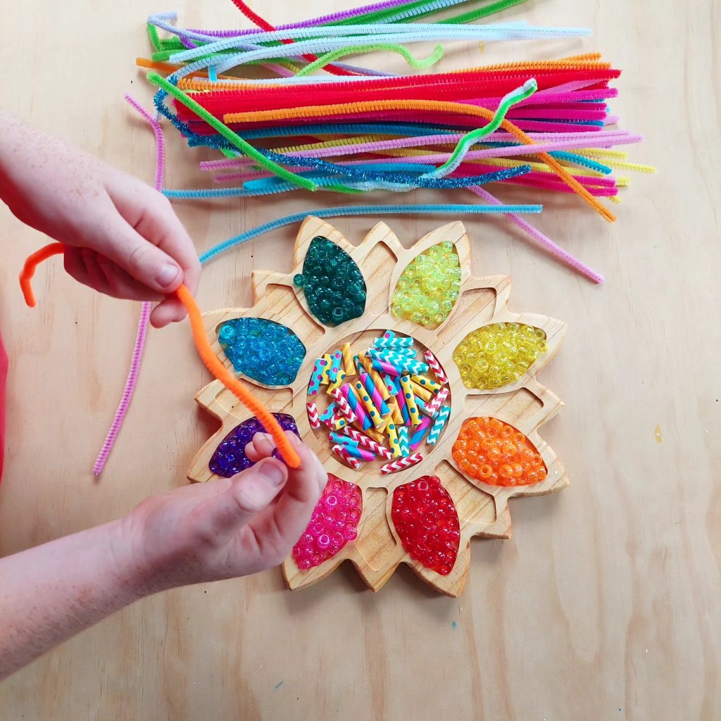 The relaxing mindfullness of threading is a wonderful skill for kids to take some time out in their busy days and create something fun to wear!