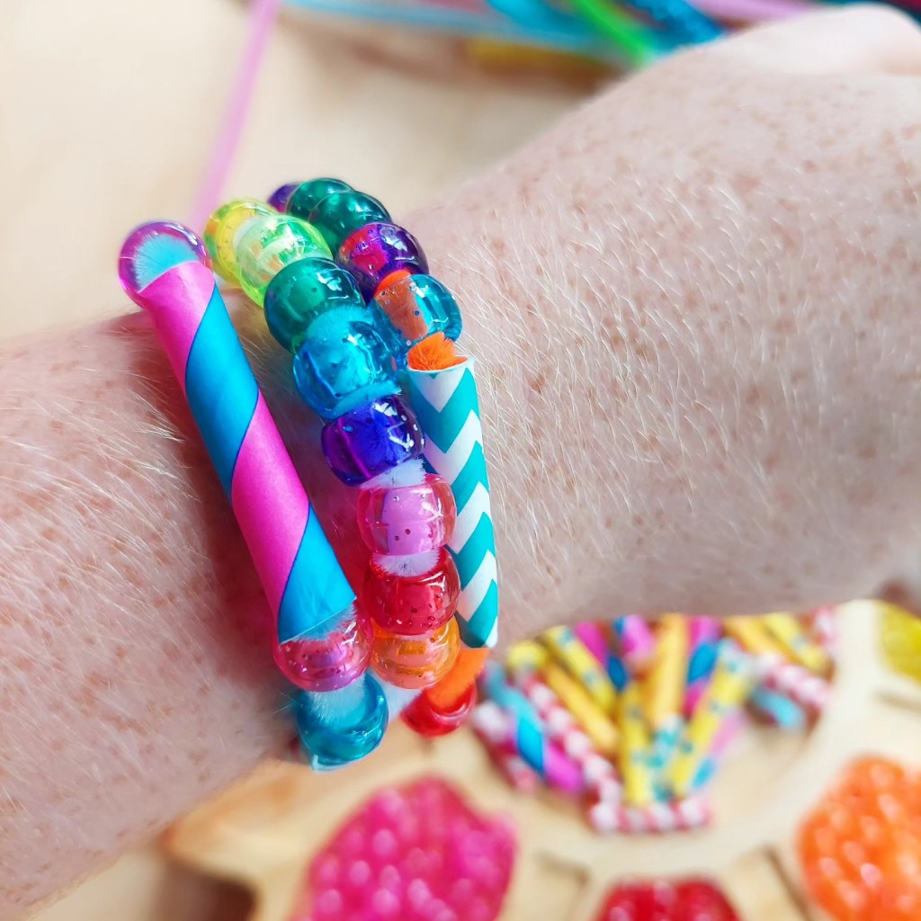 Simple and sweet kids bracelets using pony beads, cut up paper staws & pipe cleaners from @spotlightstores