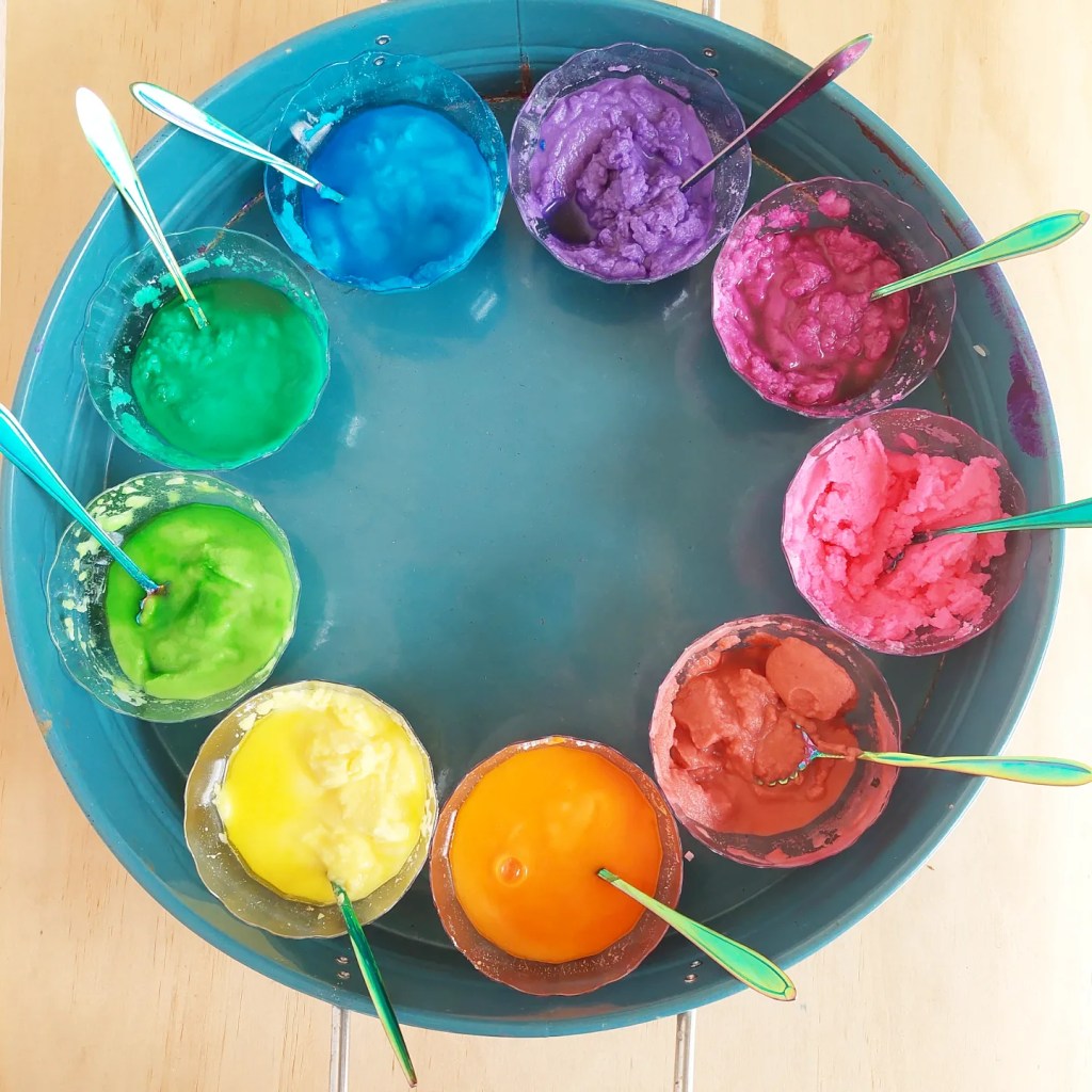Magic water…… is vinegar …….bicarb soda & food colouring from supermarkets mixed together and popped in each little compartment. The container is a hair elastic one we upcycled from @kmartaus