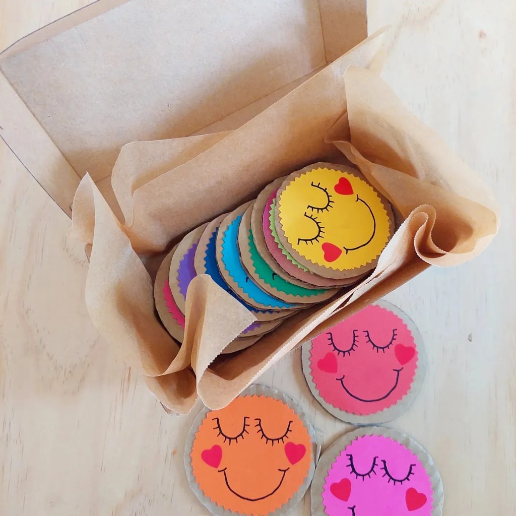 Cute rainbow cookies using recycled cardboard boxes as the base. ……..