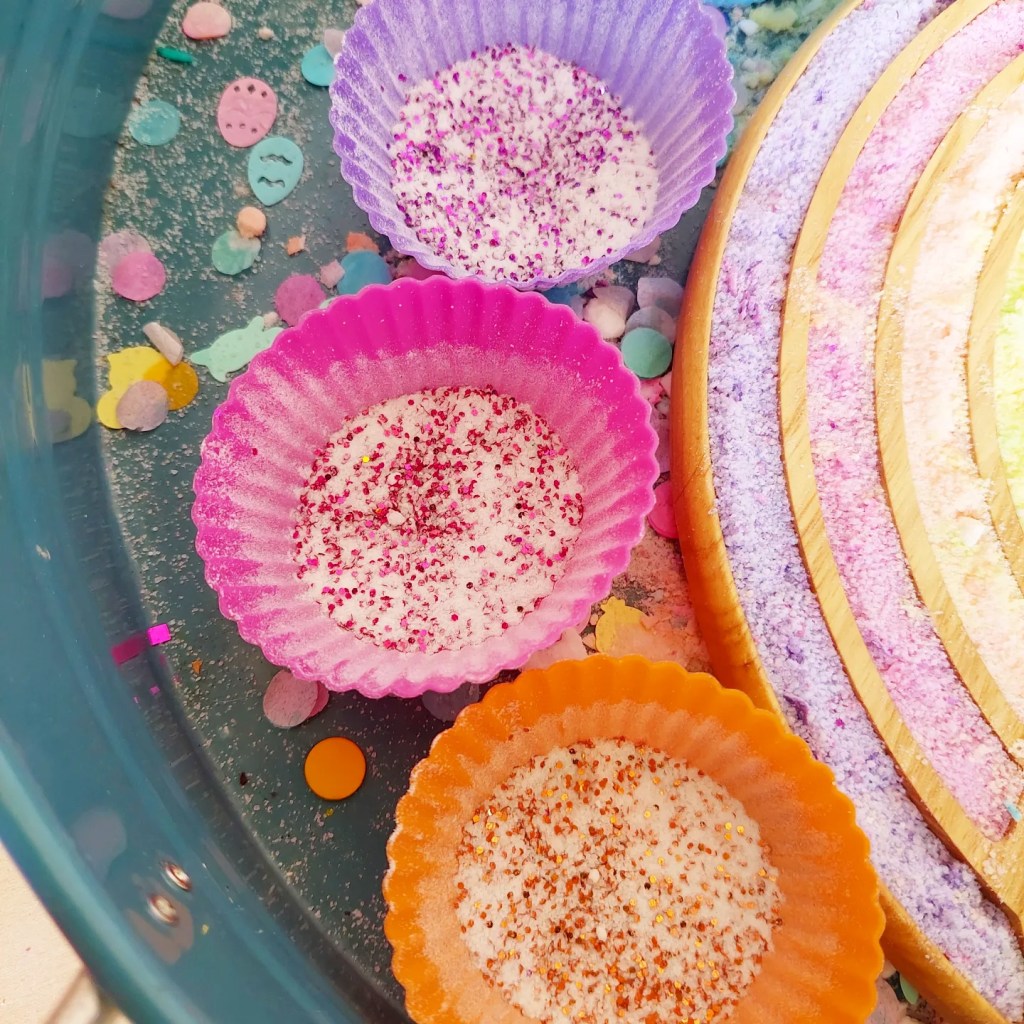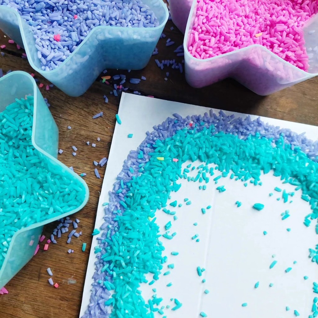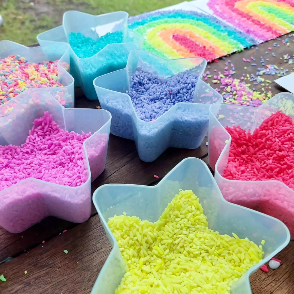 I usually don’t follow an exact recipe but combine rice, colouring & hand sanitiser and close the bag or container and shake….. shake…. shake, swooosh…. until all the rice is covered and dyed or paint, you can always add extra dye or paint. You don’t want to drown the rice.