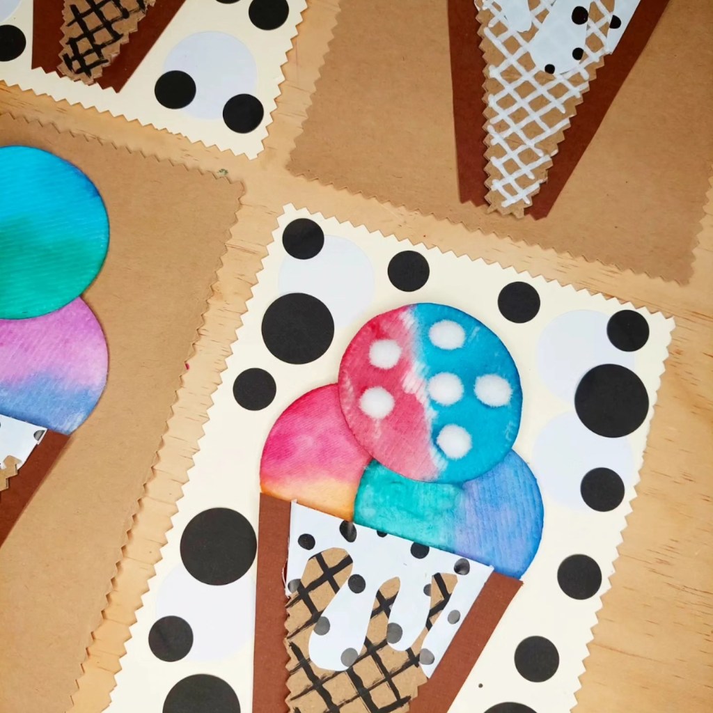 Cotton face cleaning pads for the win! …. a new exciting textures for watercolours to absorb into the cloth and watch the colours blend….. we upcycled some cardboard boxes for the waffle cones!